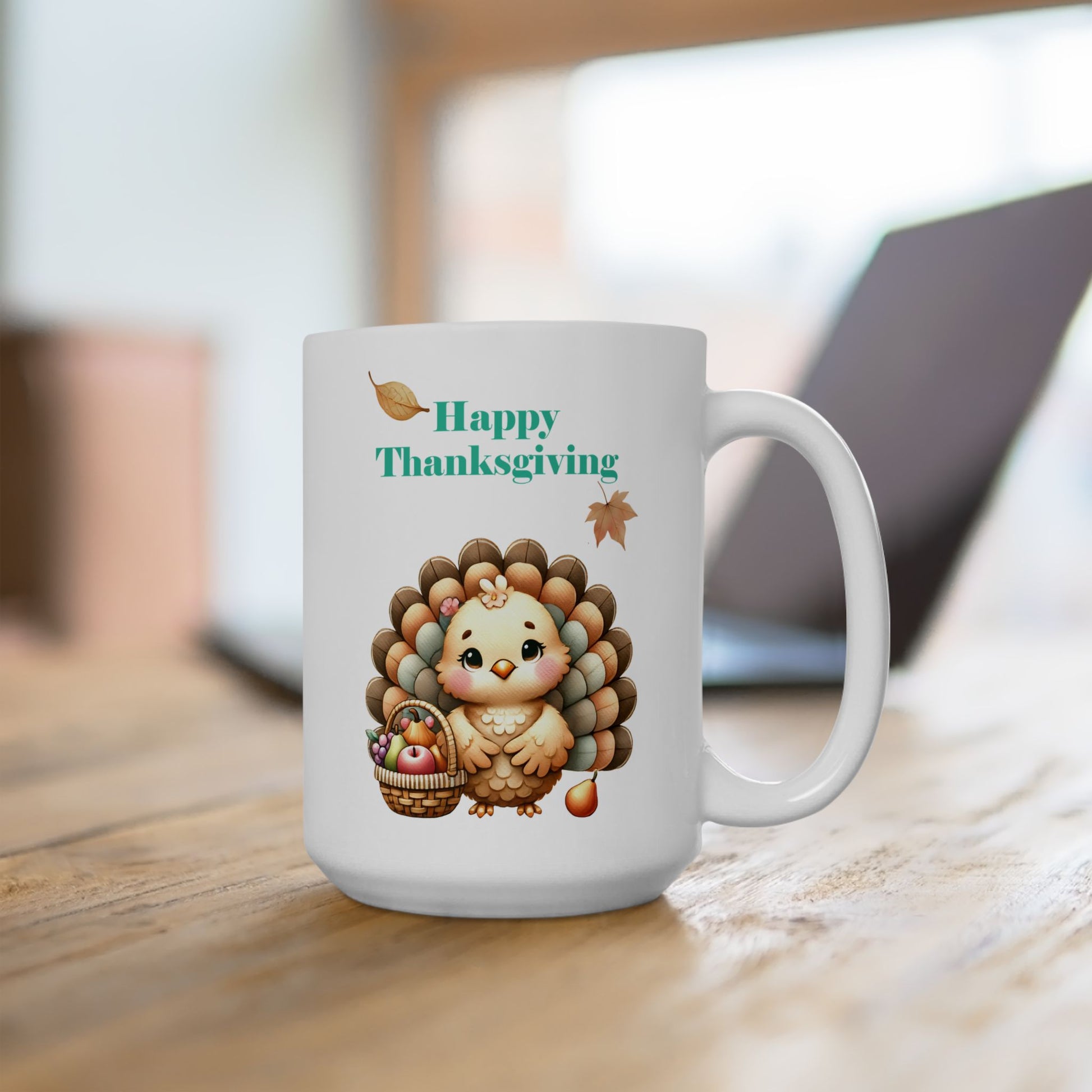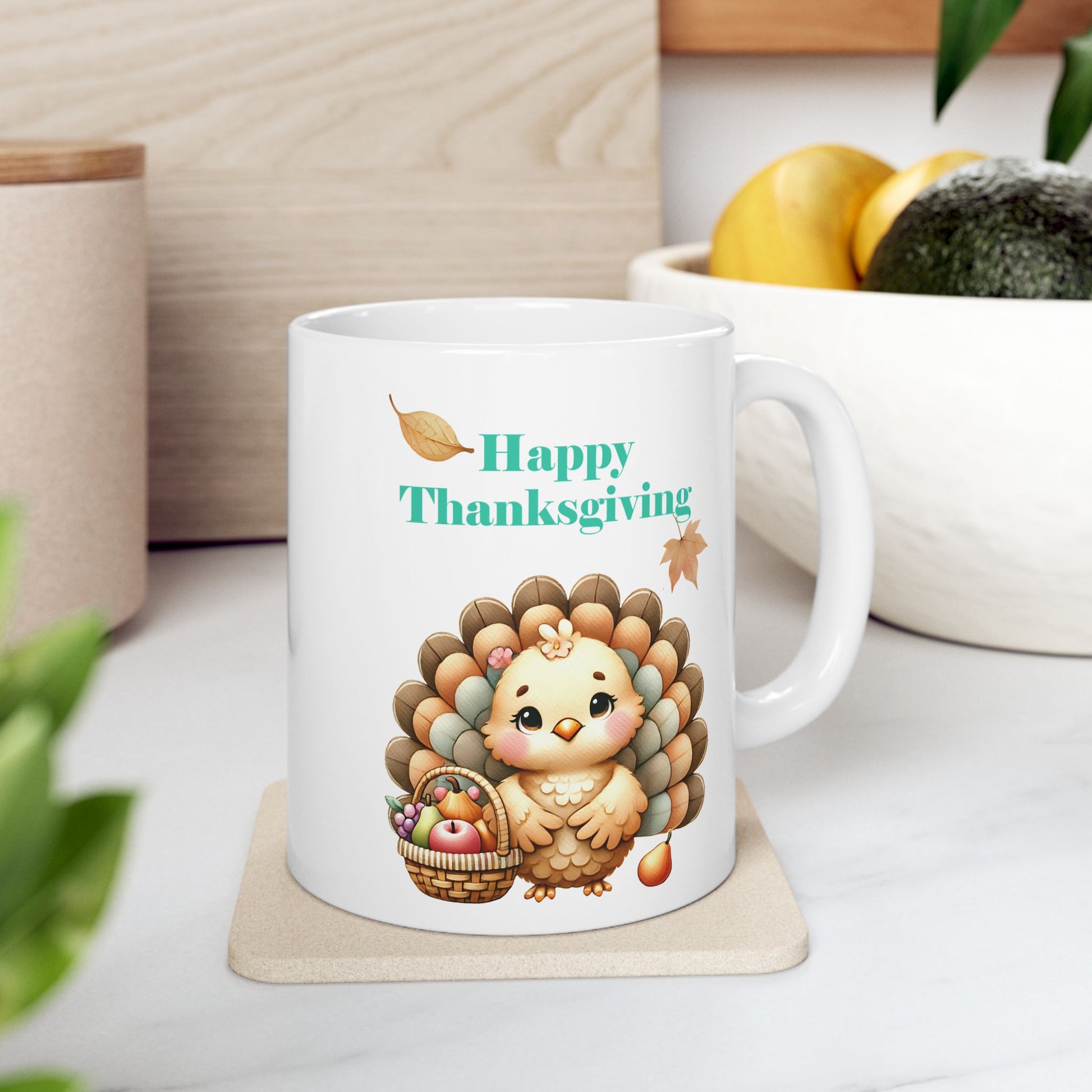 Start your mornings with warmth and charm using our Happy Thanksgiving Mug, featuring an adorable cartoon turkey holding a harvest basket. Perfect for sipping your favorite fall beverage, this mug adds a festive touch to any Thanksgiving table or coffee break.