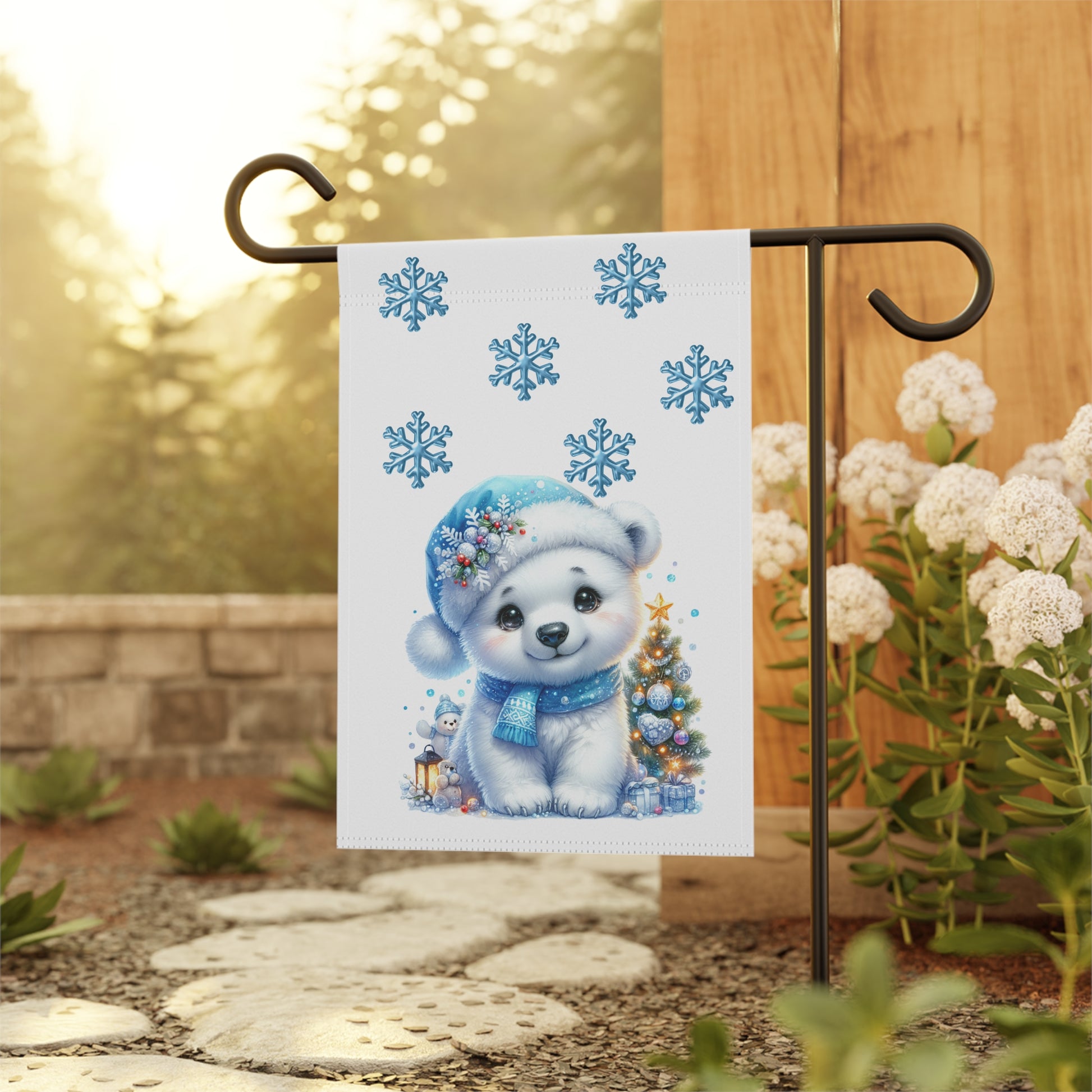 Bring an irresistible touch of winter charm to your outdoor space with this delightful garden flag featuring an adorable baby polar bear! This sweet cub, wearing a cozy blue hat and scarf, sits beside a decorated miniature Christmas tree with gifts, while blue snowflakes gently fall around. It's the perfect decoration to add a heartwarming and whimsical touch to your garden, patio, or entryway throughout the Christmas and winter seasons. Crafted from durable, weather-resistant material, it's designed to withstand the elements and maintain its vibrant colors year after year. A wonderful way to spread holiday cheer or a thoughtful gift for animal lovers! (Flag stand not included).