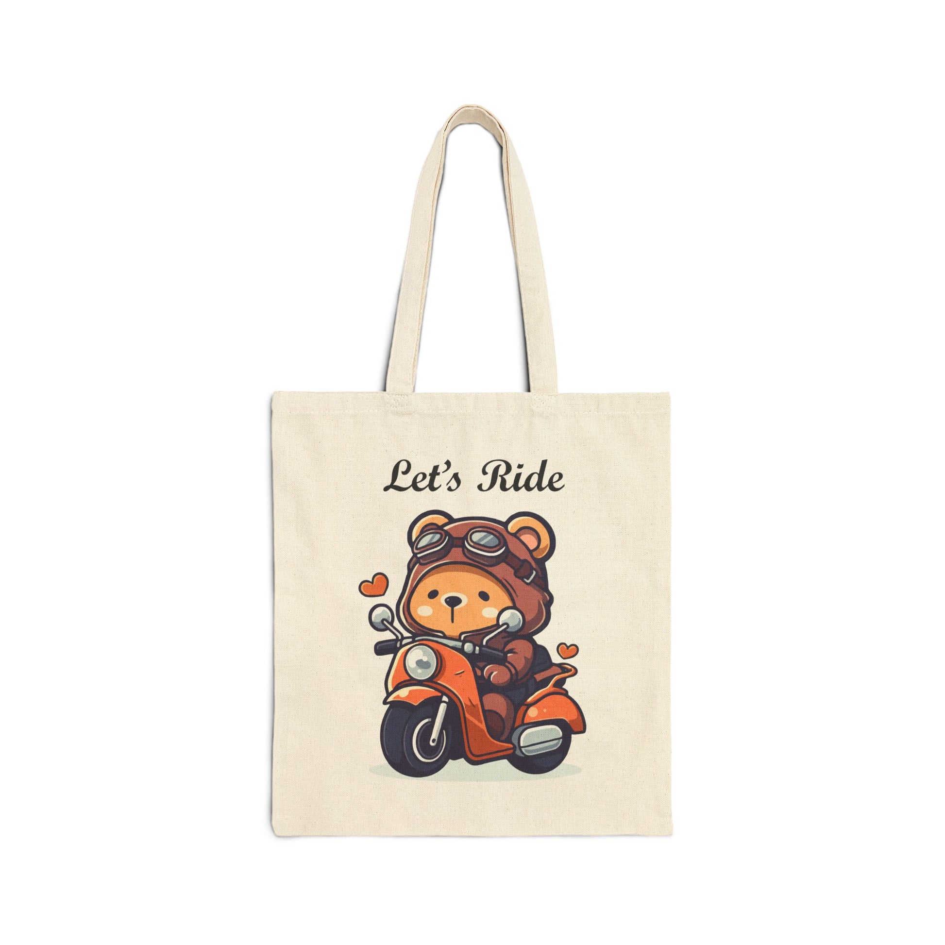 Embark on a charming adventure with this adorable and unique canvas tote bag! Featuring a cute cartoon bear in a helmet and goggles, riding an orange scooter, and the phrase "Let's Ride," this bag is perfect for anyone who loves animals, vintage style, or has a fun-loving spirit. Made from durable, natural cotton canvas, it's the perfect accessory for everyday use. Whether you're headed to the bookstore, the coffee shop, or a weekend trip, this reusable bag is both practical and stylish. It makes a wonderful gift for friends, family, or anyone who appreciates cute and whimsical designs.