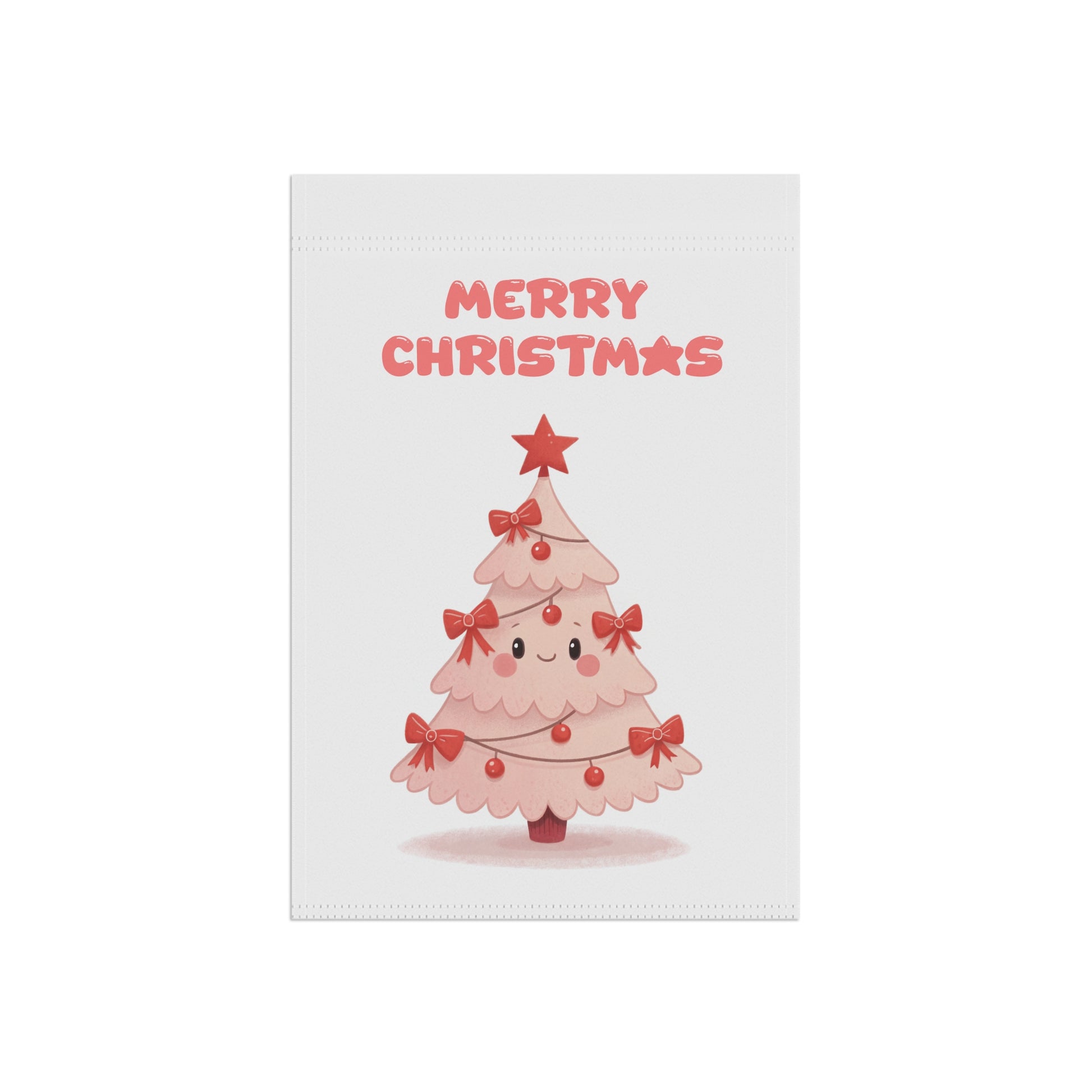 Bring a touch of festive fun and cheer to your home with this adorable "Merry Christmas" garden flag. This charming flag features a whimsical illustration of a cute, smiling pink Christmas tree, complete with red bows, ornaments, and a bright star on top. The cheerful "MERRY CHRISTMAS" text adds a warm and inviting feel, making it the perfect way to welcome the holiday season.