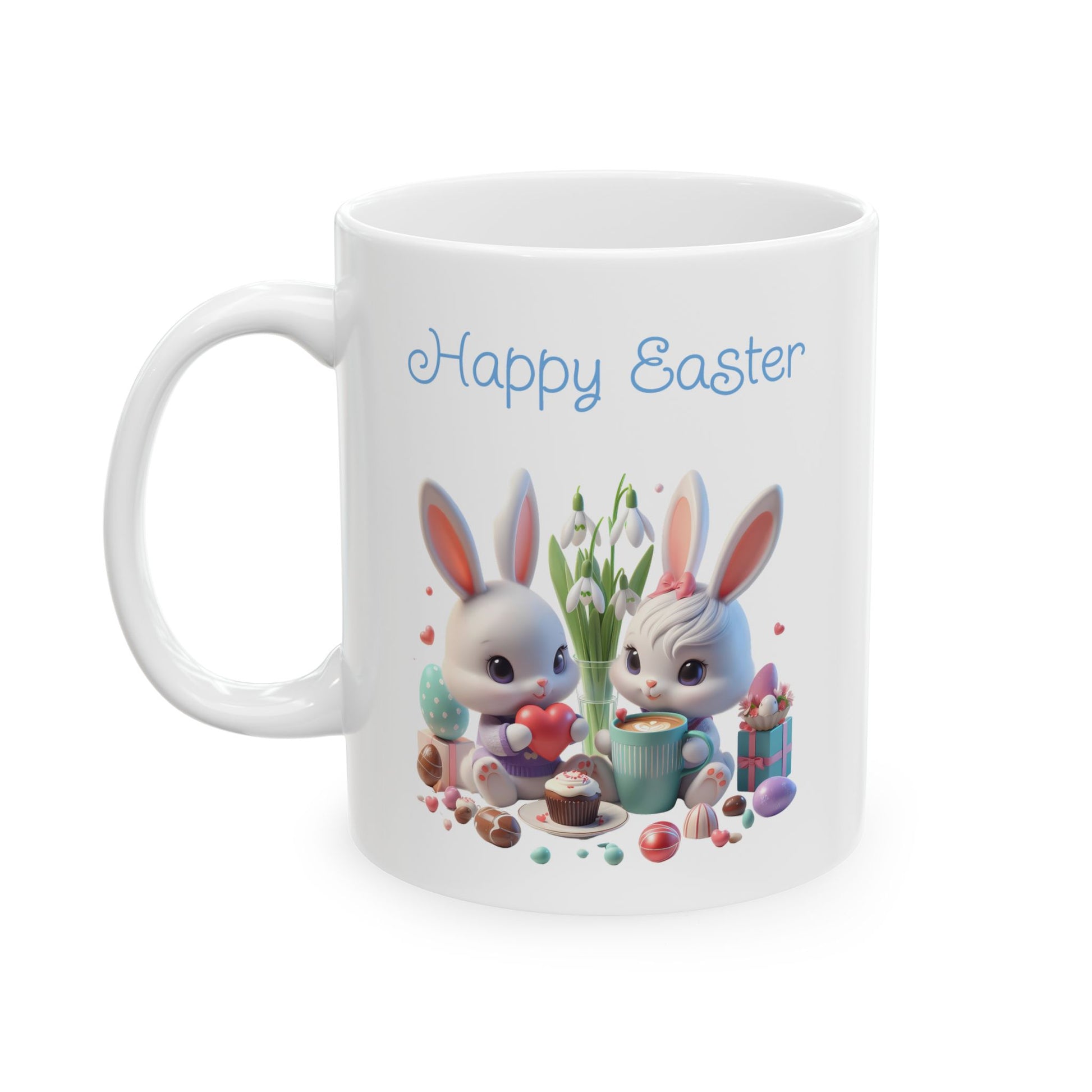 Celebrate Easter with this irresistibly cute coffee mug! This sweet design features two adorable bunnies surrounded by Easter eggs, chocolate treats, and a cupcake, enjoying a cup of hot cocoa together. With the elegant "Happy Easter" text, this mug is the perfect way to bring a smile to your face and a touch of spring to your kitchen. It’s an excellent gift for bunny lovers, kids, or anyone who loves the festive and cheerful spirit of the Easter season.