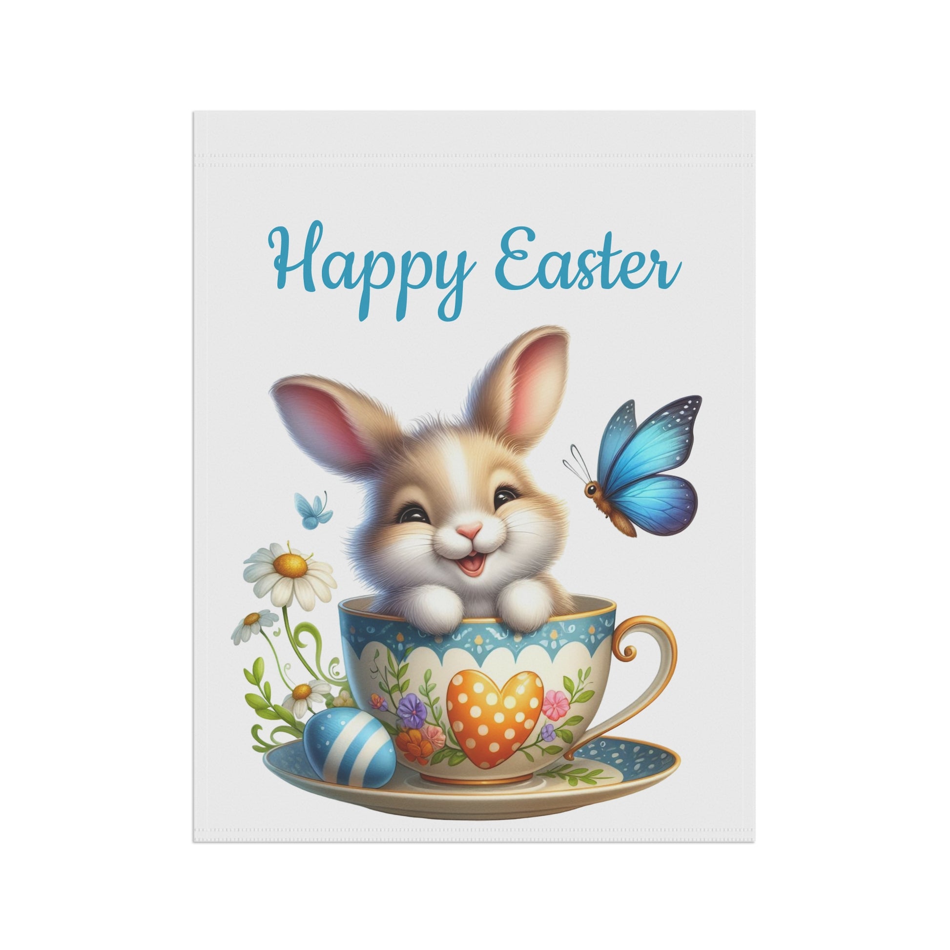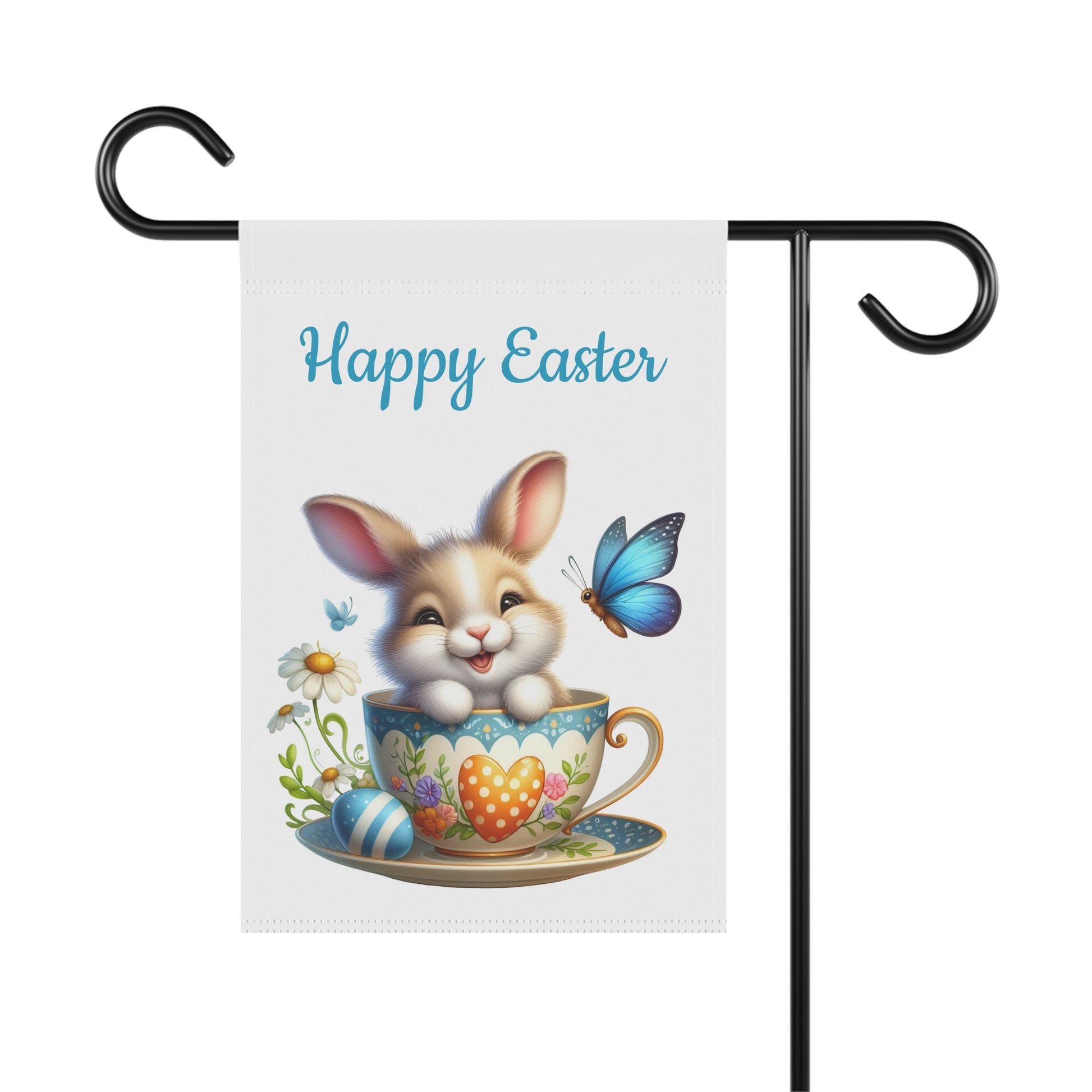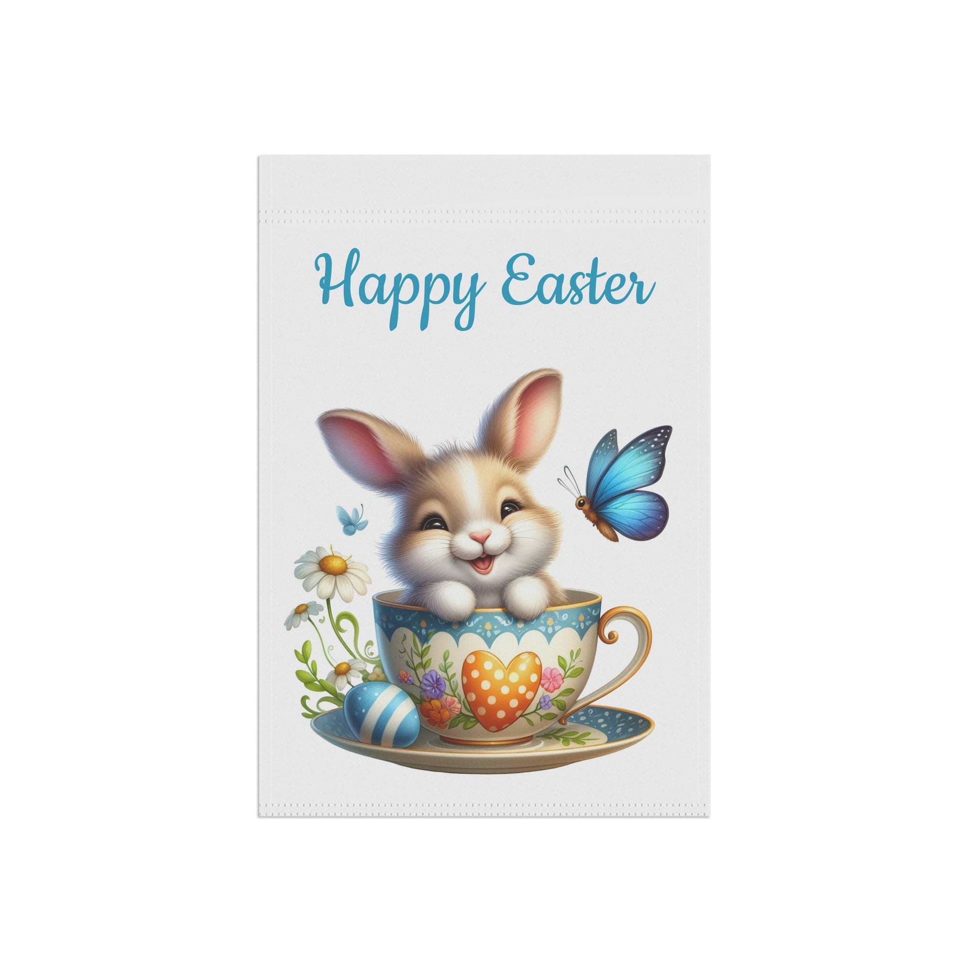 Brighten your garden and welcome the spring season with our charming "Happy Easter Bunny Teacup" Garden Flag! This delightful flag features an irresistibly cute brown and white bunny happily peeking out from a beautifully decorated teacup, surrounded by a vibrant blue butterfly, colorful Easter eggs, and delicate white daisies. The cheerful "Happy Easter" message above adds a festive touch, making it the perfect accent for your yard, patio, or entryway. Crafted from durable, weather-resistant material, this flag is designed to withstand the elements and maintain its vivid colors, bringing joy year after year.