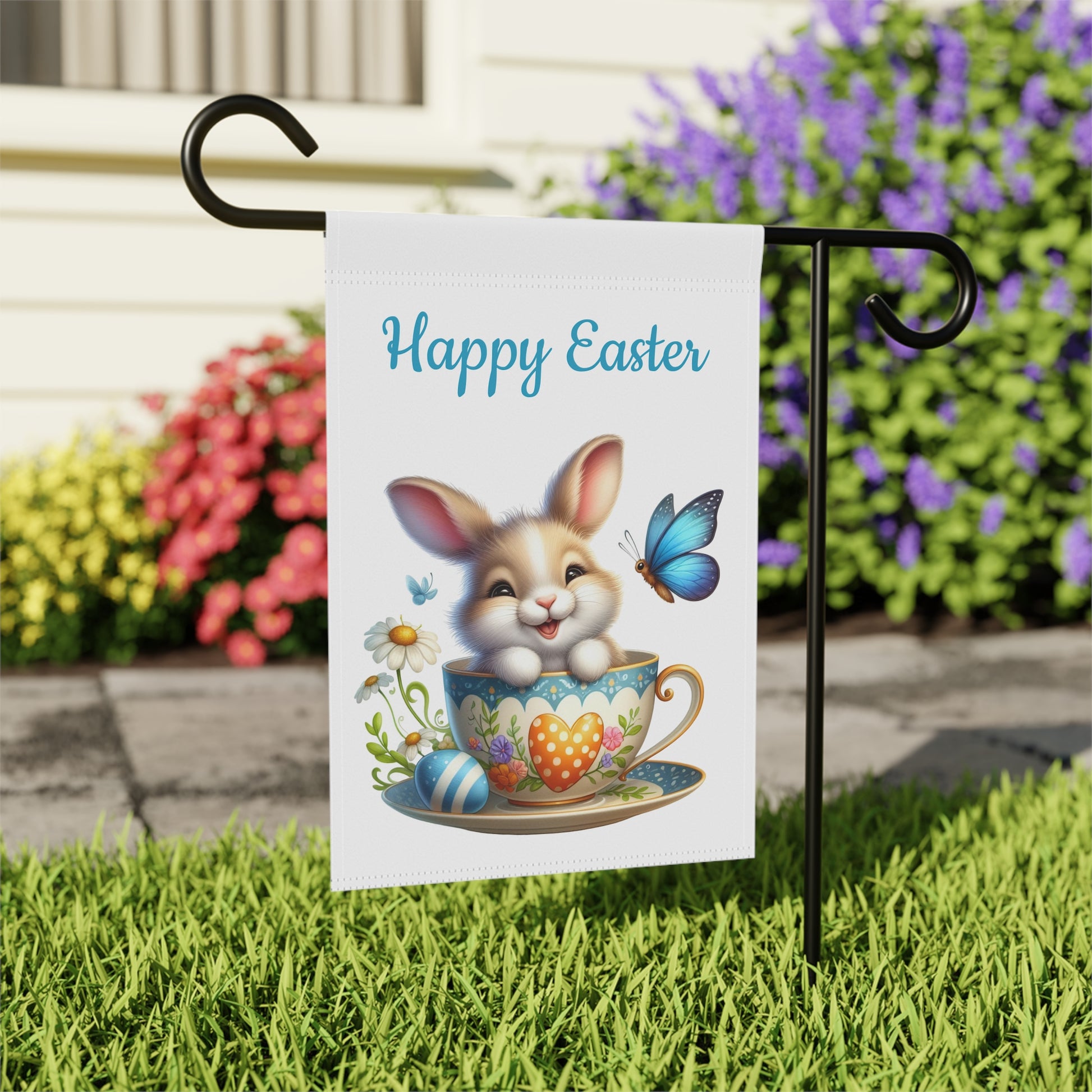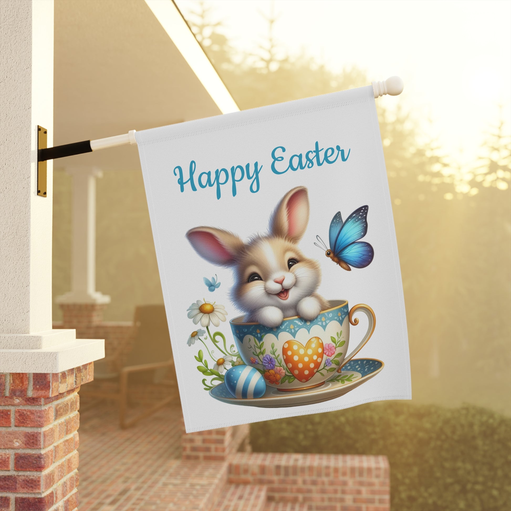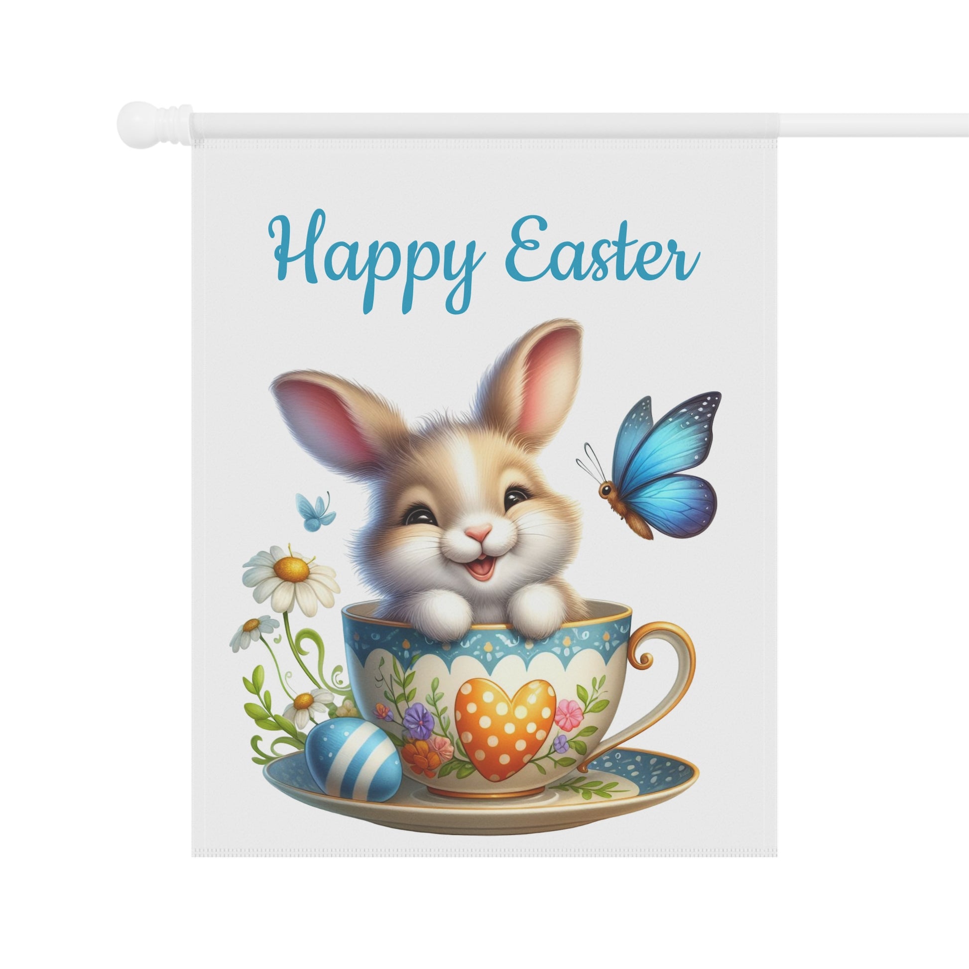 Brighten your garden and welcome the spring season with our charming "Happy Easter Bunny Teacup" Garden Flag! This delightful flag features an irresistibly cute brown and white bunny happily peeking out from a beautifully decorated teacup, surrounded by a vibrant blue butterfly, colorful Easter eggs, and delicate white daisies. The cheerful "Happy Easter" message above adds a festive touch, making it the perfect accent for your yard, patio, or entryway. Crafted from durable, weather-resistant material, this flag is designed to withstand the elements and maintain its vivid colors, bringing joy year after year.
