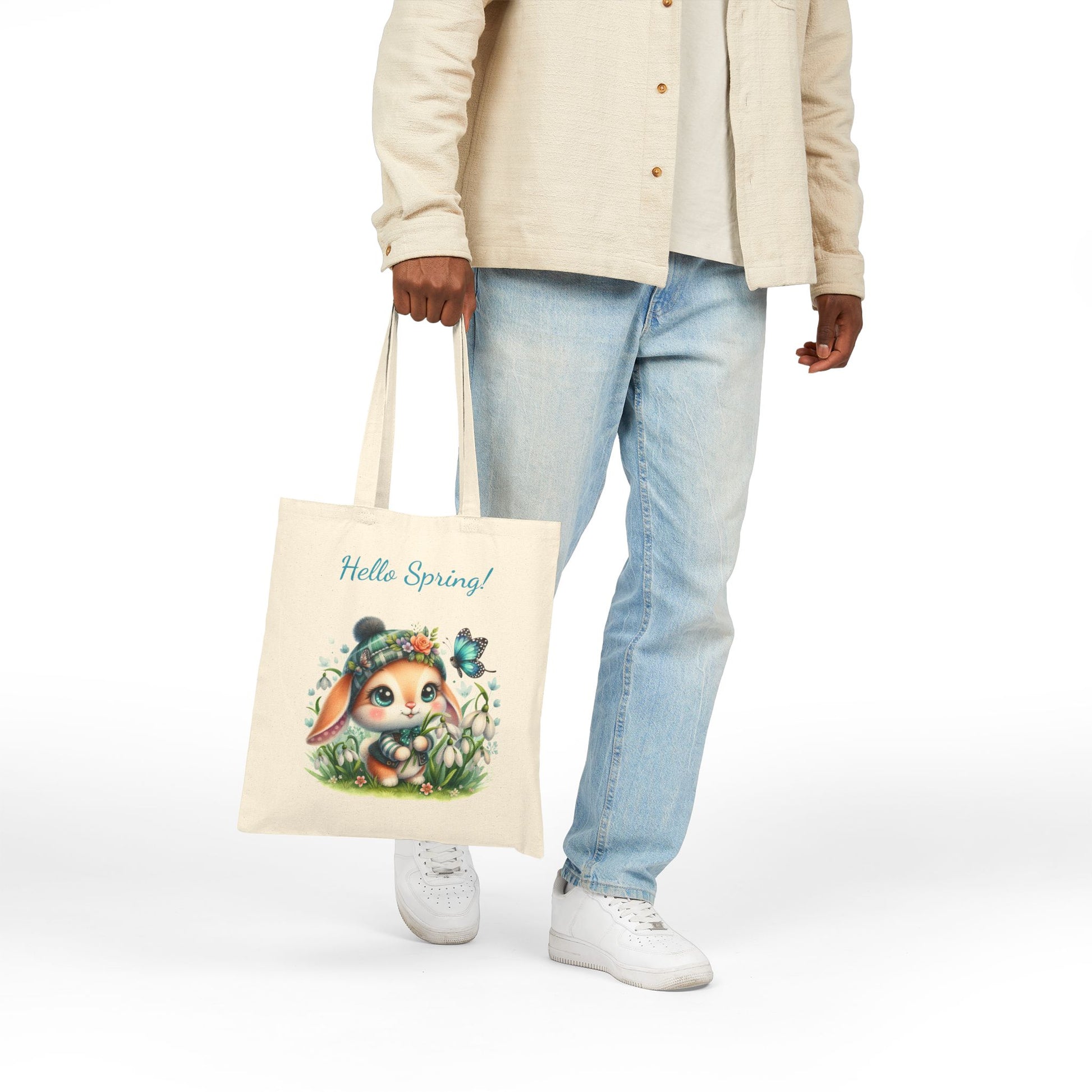 Welcome the season of renewal with this enchanting canvas tote bag. Featuring an adorable, big-eyed bunny wearing a cozy hat and surrounded by delicate snowdrop flowers and a fluttering butterfly, this design captures the essence of a charming springtime scene. The "Hello Spring!" text adds a cheerful touch. Made from durable, natural canvas, this bag is perfect for carrying your daily essentials while showcasing your love for cute animals and the beautiful spring season. It’s a fun and practical accessory for everyday use.