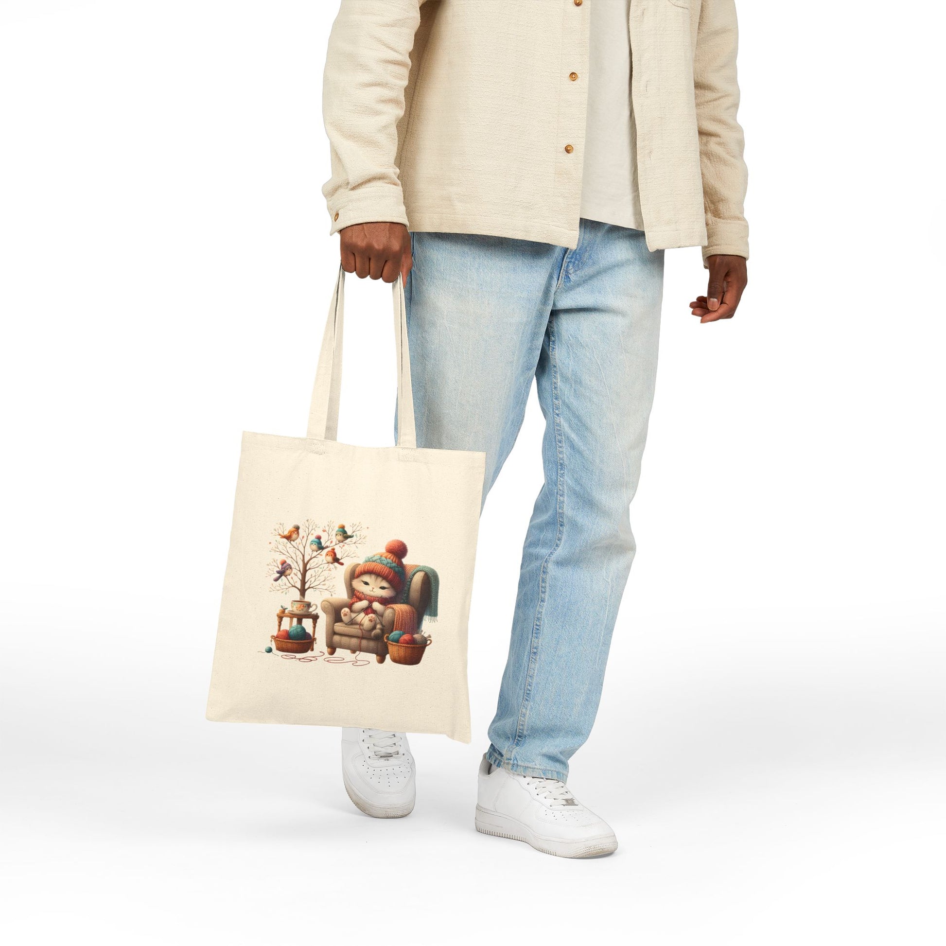 Snuggle up with our "Cozy Cat" Canvas Tote Bag! This charming bag features an adorable cat wearing a warm beanie and scarf, relaxing in a comfy armchair with a basket of yarn. A small table with a cup of tea and a whimsical tree with little birds complete this heartwarming scene. Made from durable canvas, this tote is perfect for anyone who loves cats and cozy vibes. It's spacious enough for your books, a knitting project, or your daily essentials. A great accessory for a trip to the library, a coffee shop, or just as your go-to everyday bag. It also makes a wonderful gift for cat lovers and crafters.