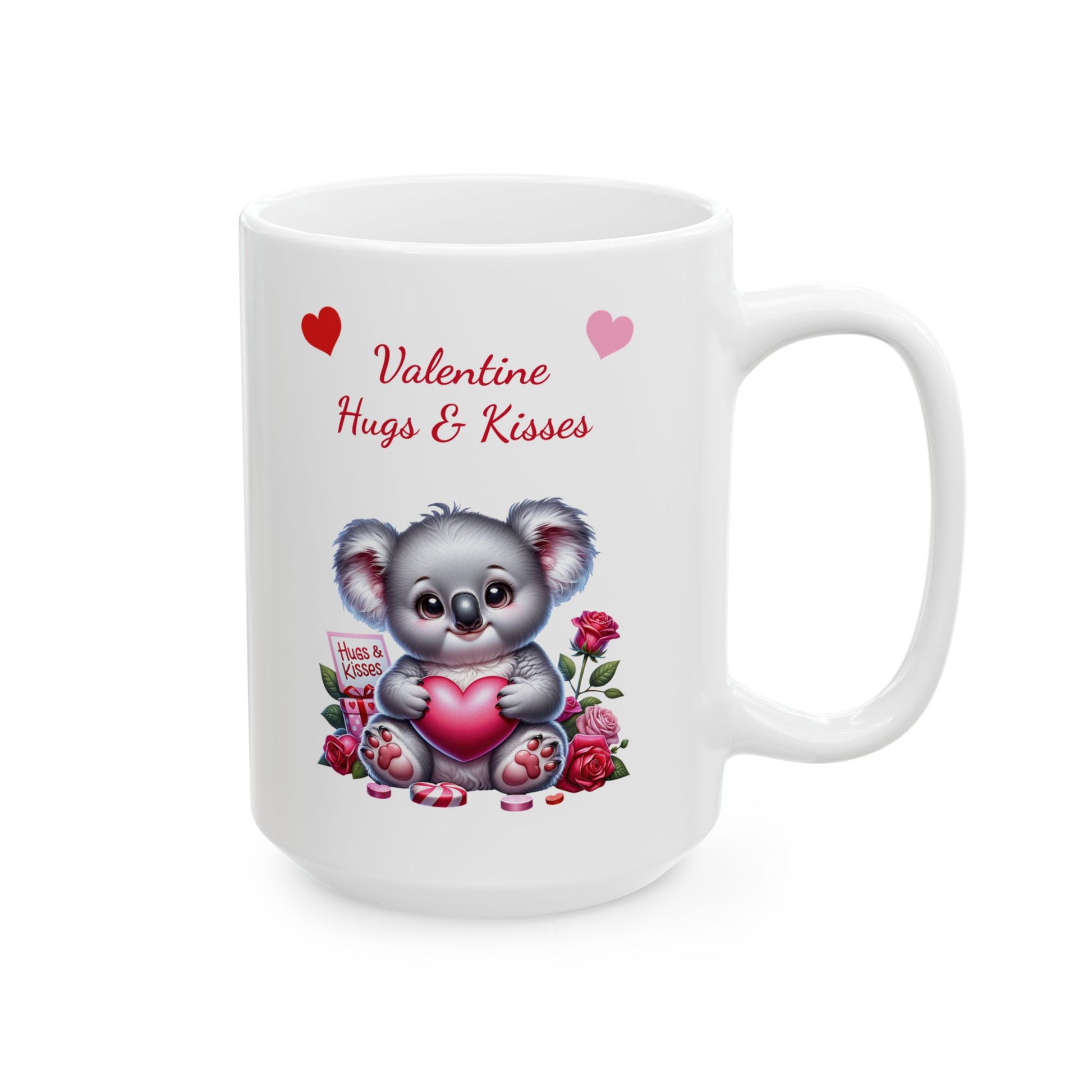 Share endless cuddles and affection with our Adorable Koala "Valentine Hugs & Kisses" Coffee Mug! This delightful ceramic mug features an irresistibly cute baby koala with soft grey fur and big, endearing eyes, lovingly clutching a pink heart. Above the koala, the heartwarming message "Valentine Hugs & Kisses" is beautifully printed, surrounded by delicate red roses, small hearts, and charming gift boxes. It's the perfect way to infuse your daily routine with warmth and affection for a loved one or any koala enthusiast.