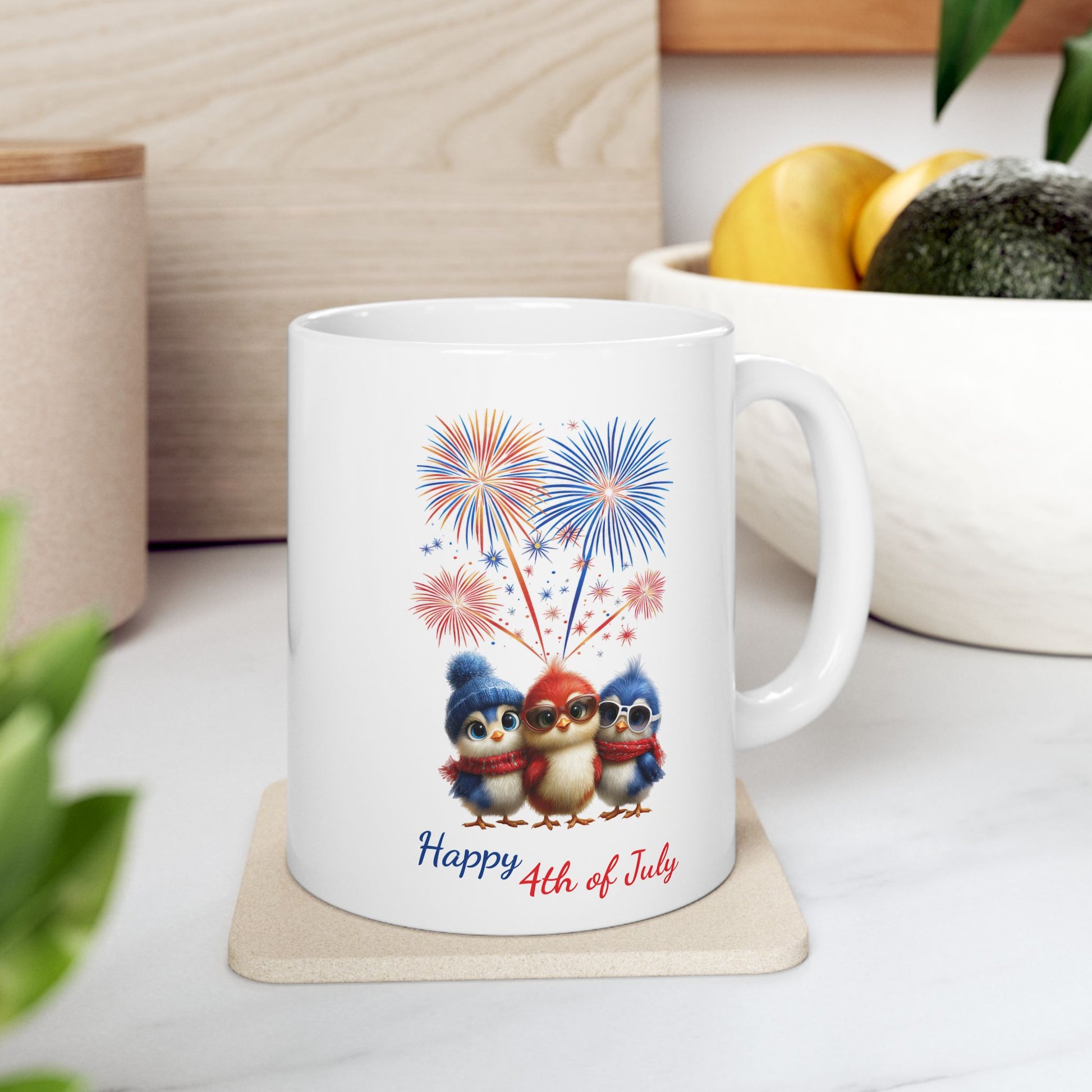 Celebrate with a burst of cuteness with our Adorable Patriotic Birds Coffee Mug! This charming white ceramic mug features a delightful trio of fluffy little birds, each sporting festive red, white, and blue accessories like beanies, scarves, and sunglasses. Above them, vibrant red and blue fireworks explode, perfectly capturing the joy and excitement of the 4th of July. The playful "Happy 4th of July" text in a mix of red and blue script adds a cheerful touch, making this mug an ideal way to enjoy your morning coffee or tea during any national celebration.
