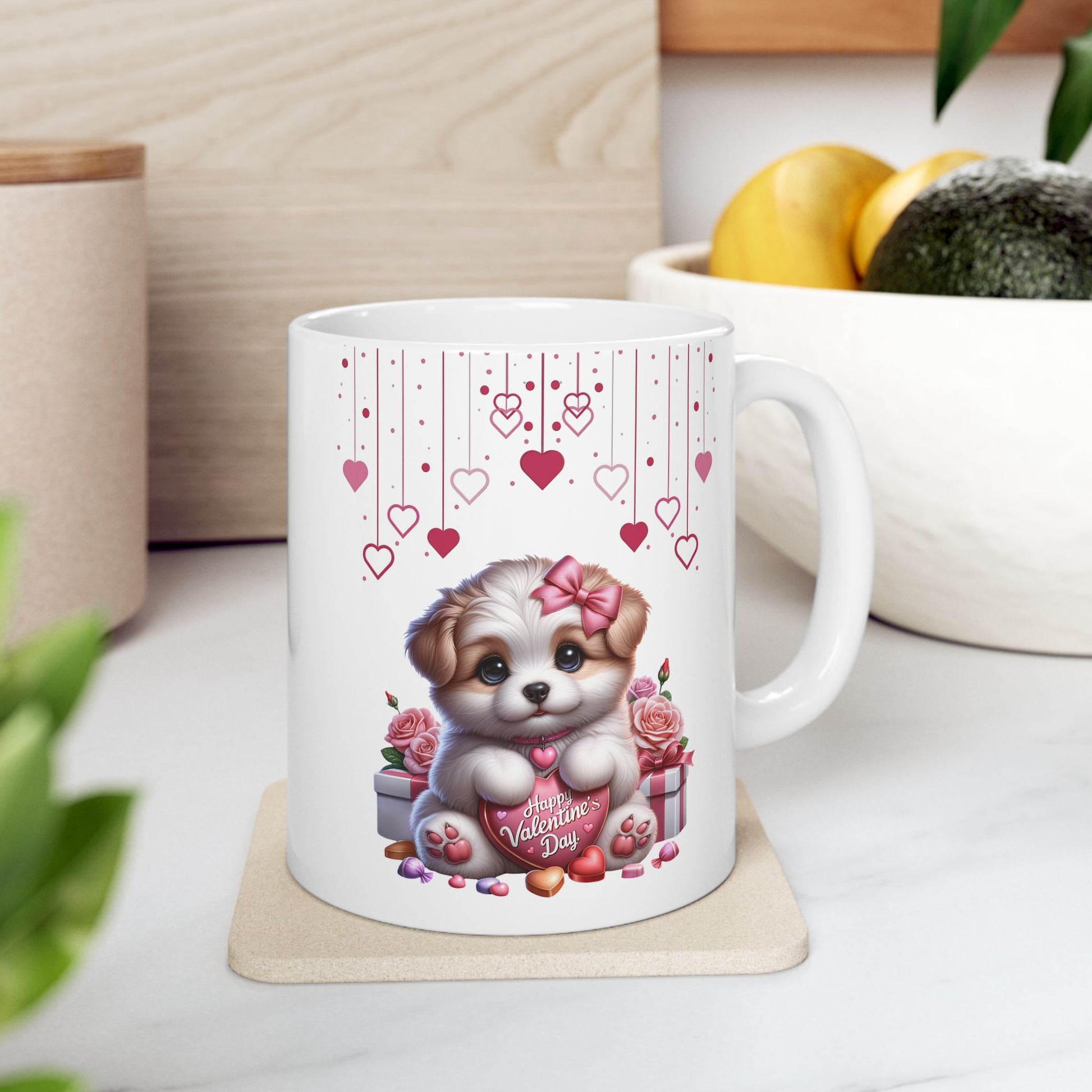 Celebrate love with the paw-fect companion, our Adorable Puppy "Happy Valentine's Day" Coffee Mug! This delightful ceramic mug features an irresistibly cute little puppy with a pink bow, lovingly holding a pink heart that reads "Happy Valentine's Day." Surrounded by delicate hanging hearts, roses, and charming gift boxes, it's a heartwarming way to express your affection to a loved one or any dog enthusiast.