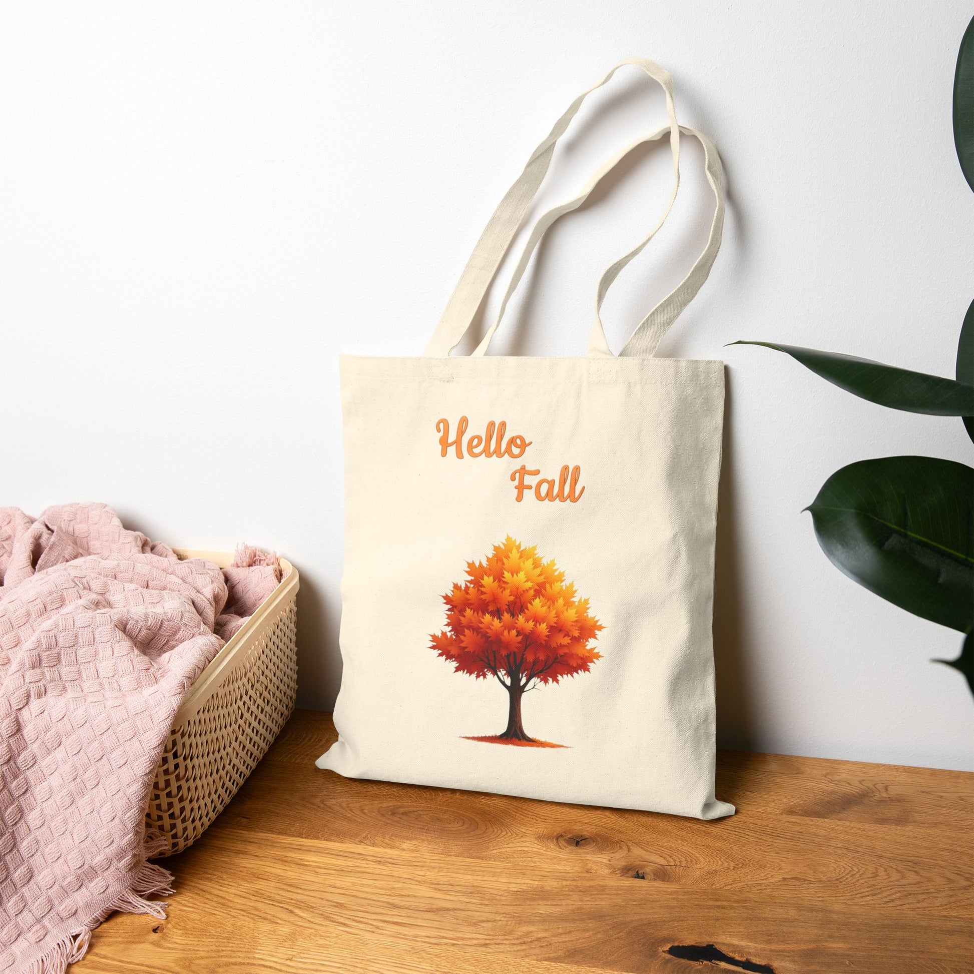 Welcome the Season with our "Hello Fall" Autumn Tree Tote Bag! This beautiful canvas tote bag is the perfect accessory to celebrate the arrival of autumn. Featuring a stunning illustration of a vibrant autumn tree with fiery yellow and orange leaves, along with the greeting "Hello Fall," this tote captures the serene beauty of the season. Made from durable, natural canvas, it's not only a stylish statement piece but also a practical solution for all your shopping, library trips, and daily essentials.