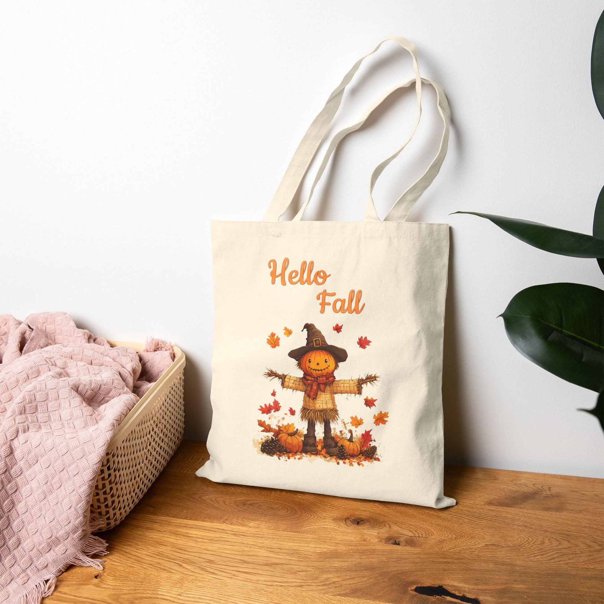 Welcome the autumn season with our delightful "Hello Fall" Canvas Tote Bag! This charming bag features an adorable scarecrow with a pumpkin head, surrounded by colorful falling leaves and pumpkins. This tote is perfect for a variety of uses. Whether you're heading to the farmer's market, carrying your books for class, or packing for a weekend trip, this spacious and stylish tote is your go-to accessory for fall. The natural canvas material and vibrant print make it a great gift for anyone who loves autumn decor and seasonal style.