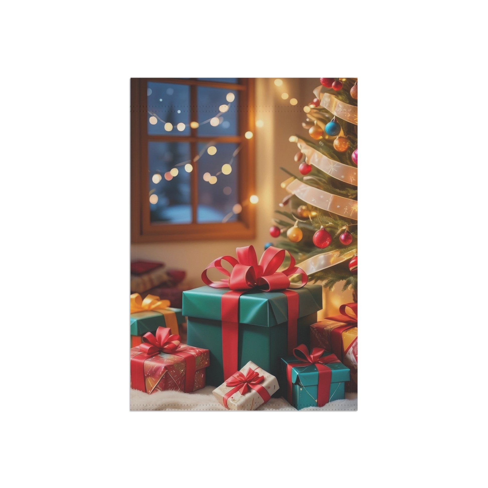 Bring the joy and excitement of Christmas morning to your outdoor space with this delightful garden flag! It features a vibrant collection of beautifully wrapped presents in festive red and green, nestled beneath a warmly lit Christmas tree. The scene is completed by a cozy window looking out onto a snowy night, making it perfect for adding a touch of holiday magic and warmth to your yard. Ideal for welcoming guests during the Christmas season or simply celebrating the spirit of giving. Made from durable, weather-resistant material, this flag ensures vibrant colors and long-lasting display throughout the winter.
