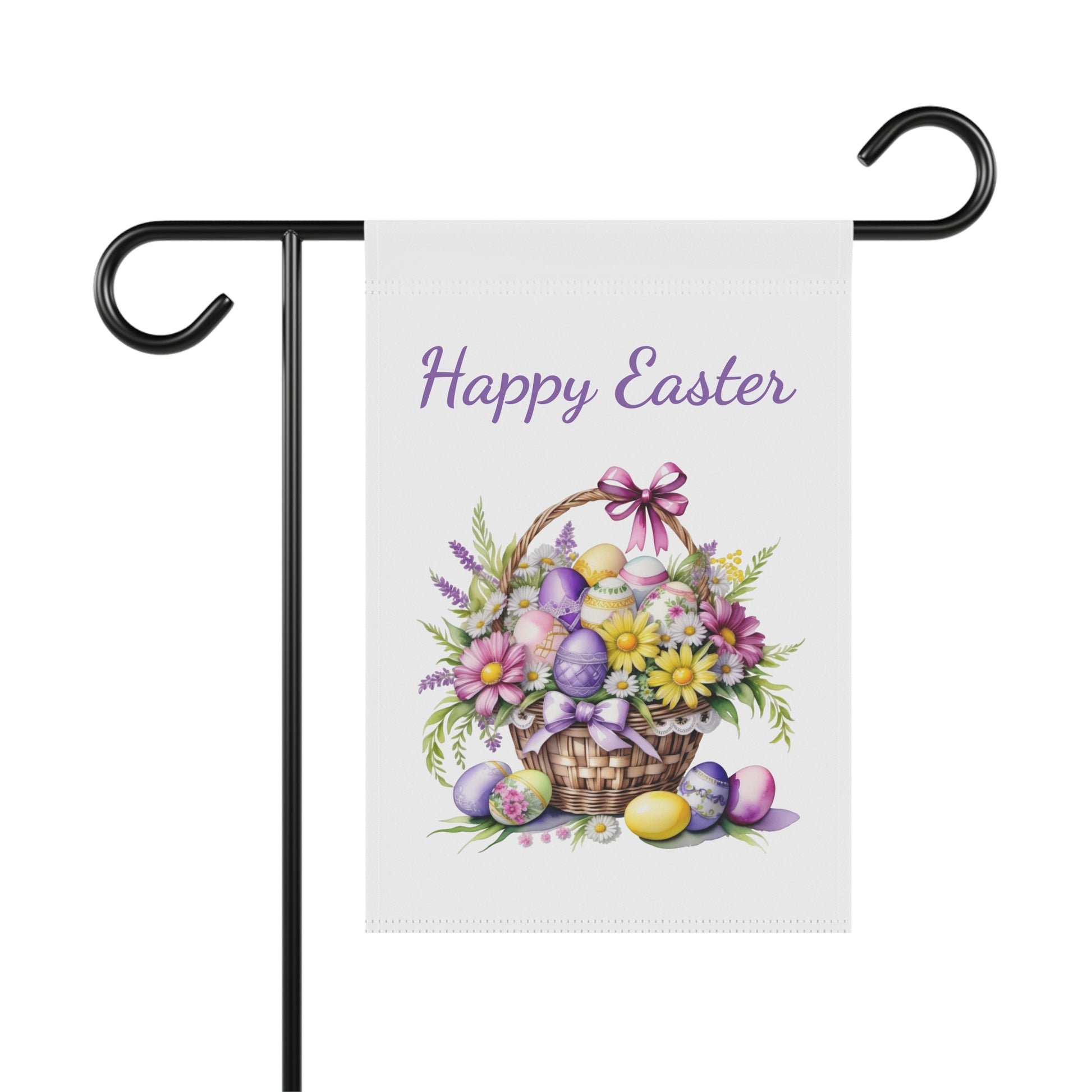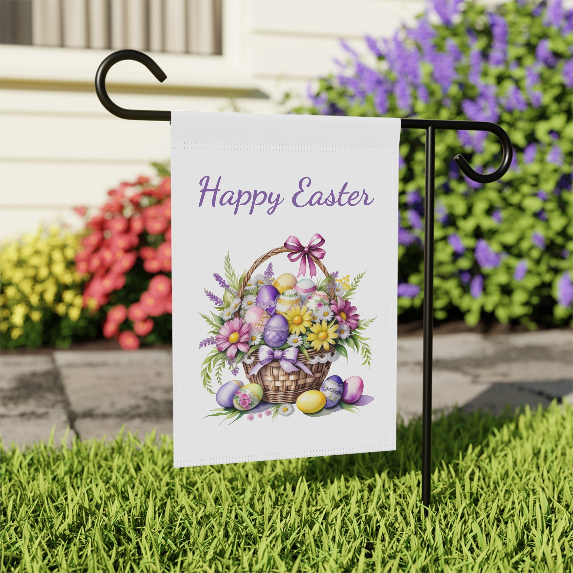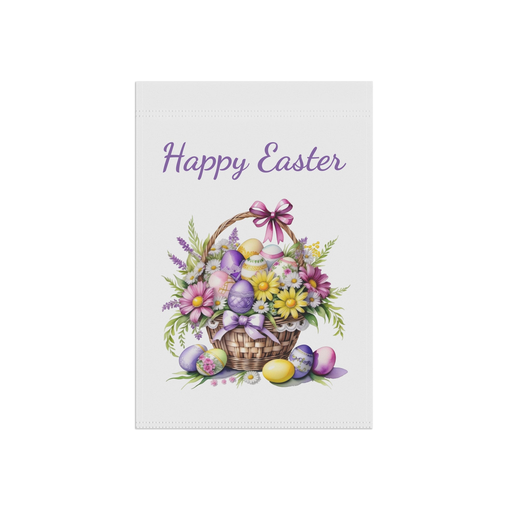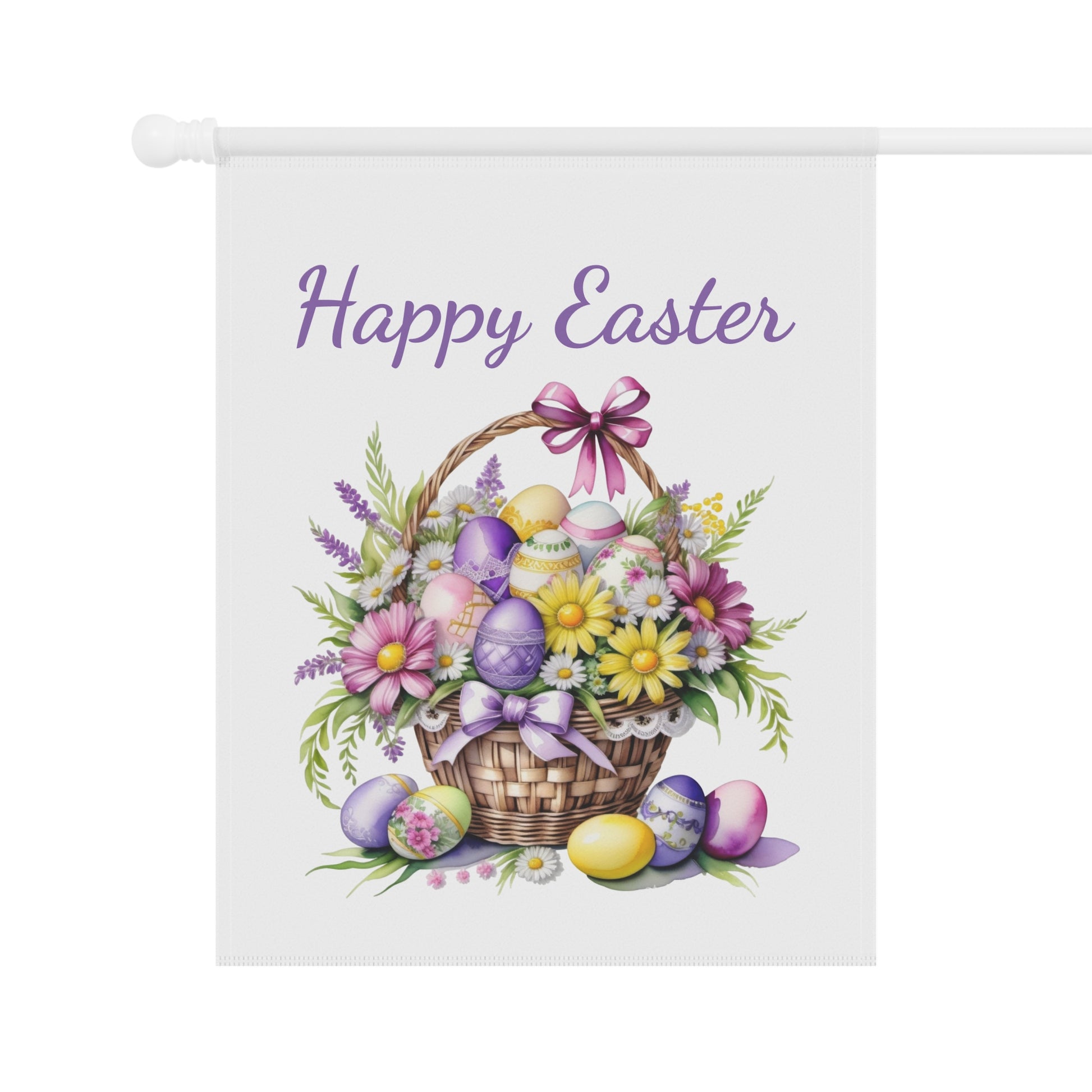 Welcome the Easter season with our delightful "Happy Easter" garden flag, showcasing a beautifully illustrated basket overflowing with pastel flowers and decorated Easter eggs. This charming and vibrant flag is the perfect addition to your outdoor space, adding a touch of festive cheer to your garden, patio, or front yard. Made from high-quality, durable, and weather-resistant material, this flag is designed to withstand the elements and maintain its brilliant colors year after year. It's a wonderful way to celebrate the holiday and add a warm, inviting feel to your home's exterior.