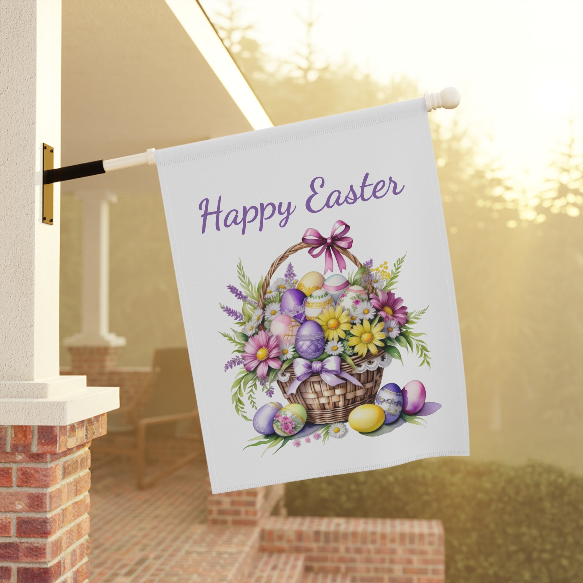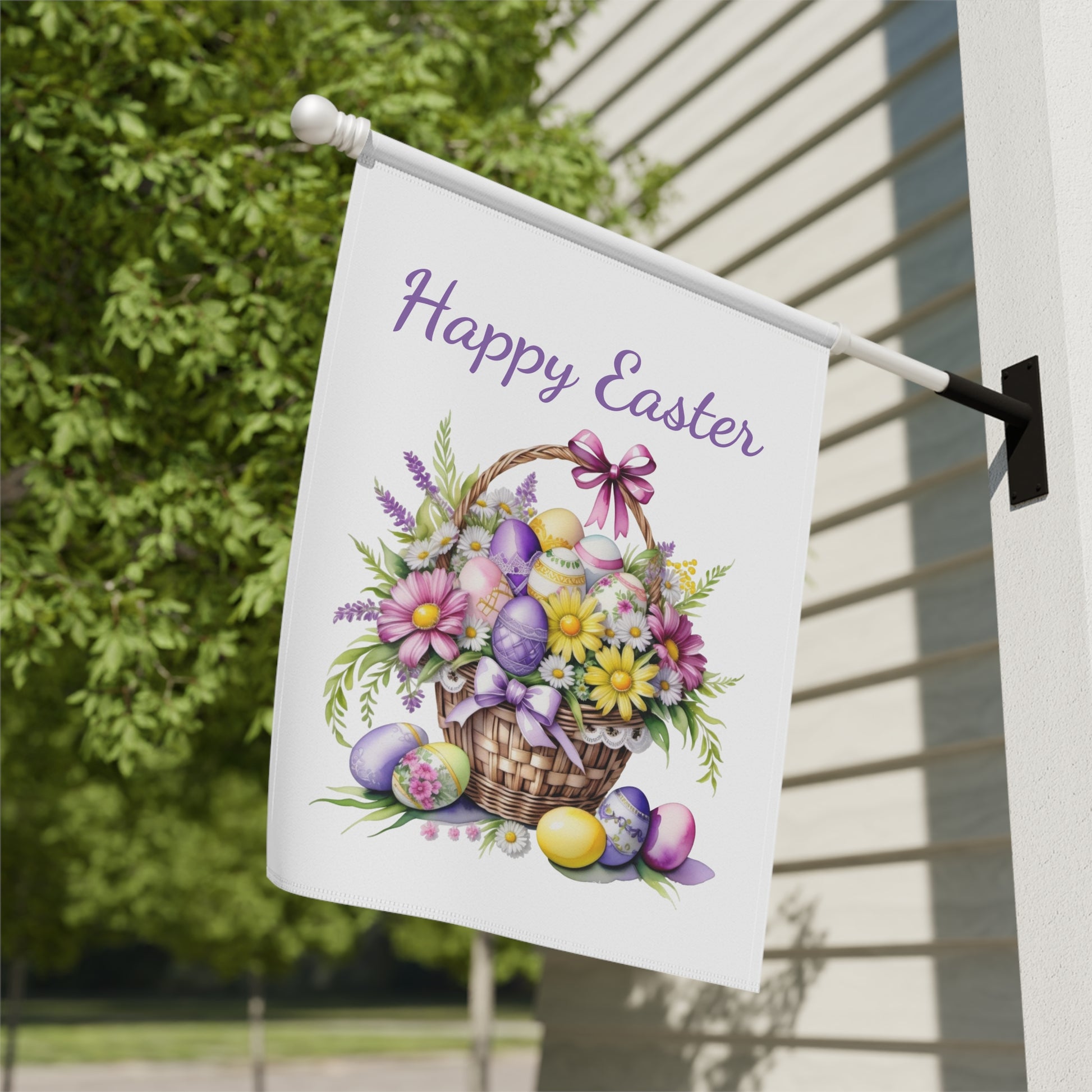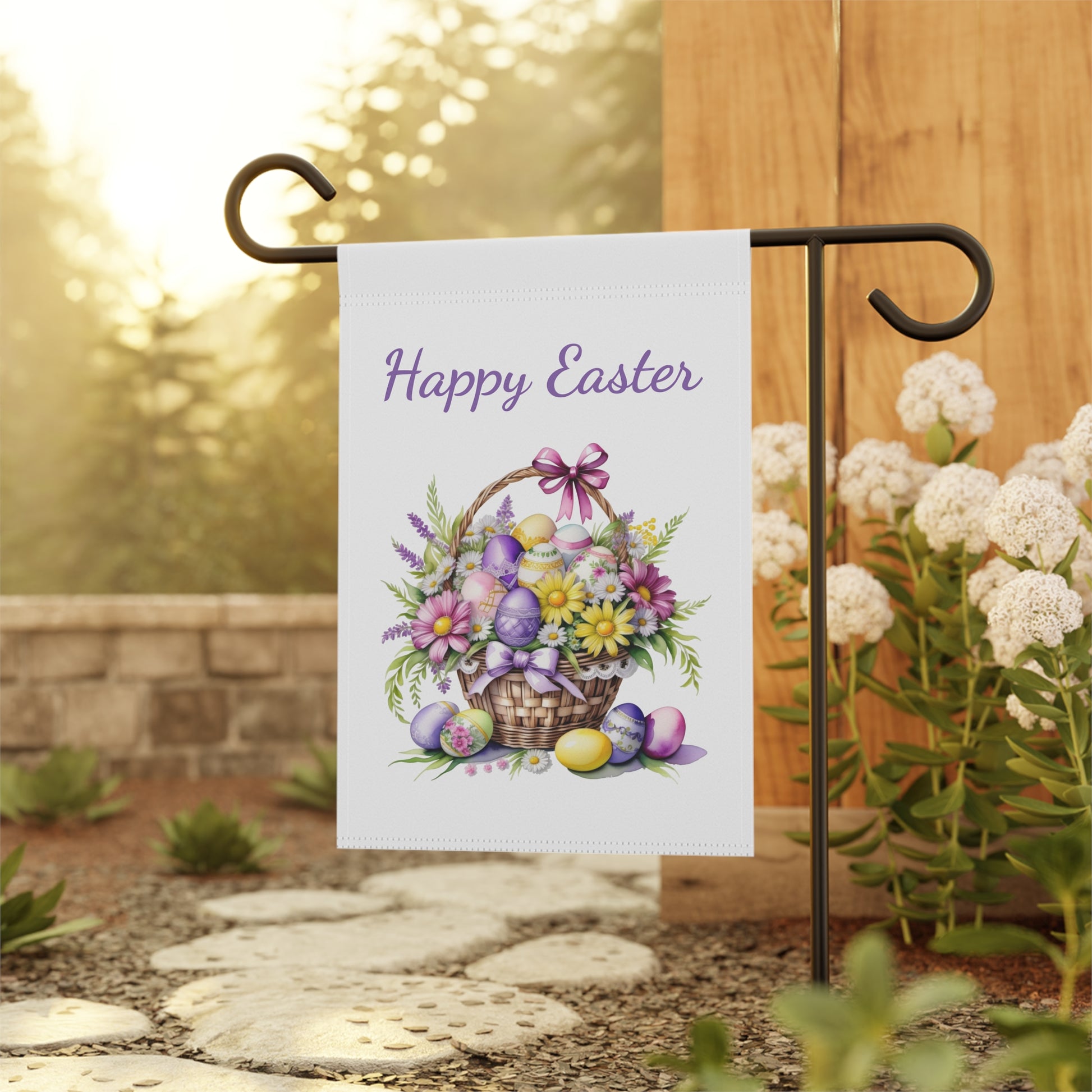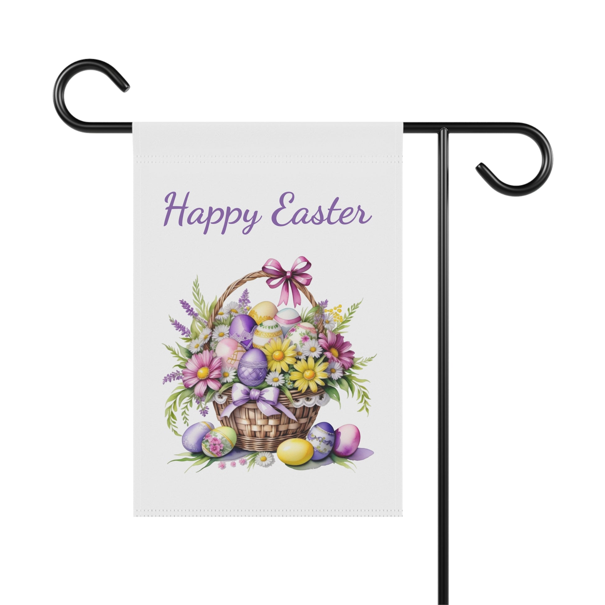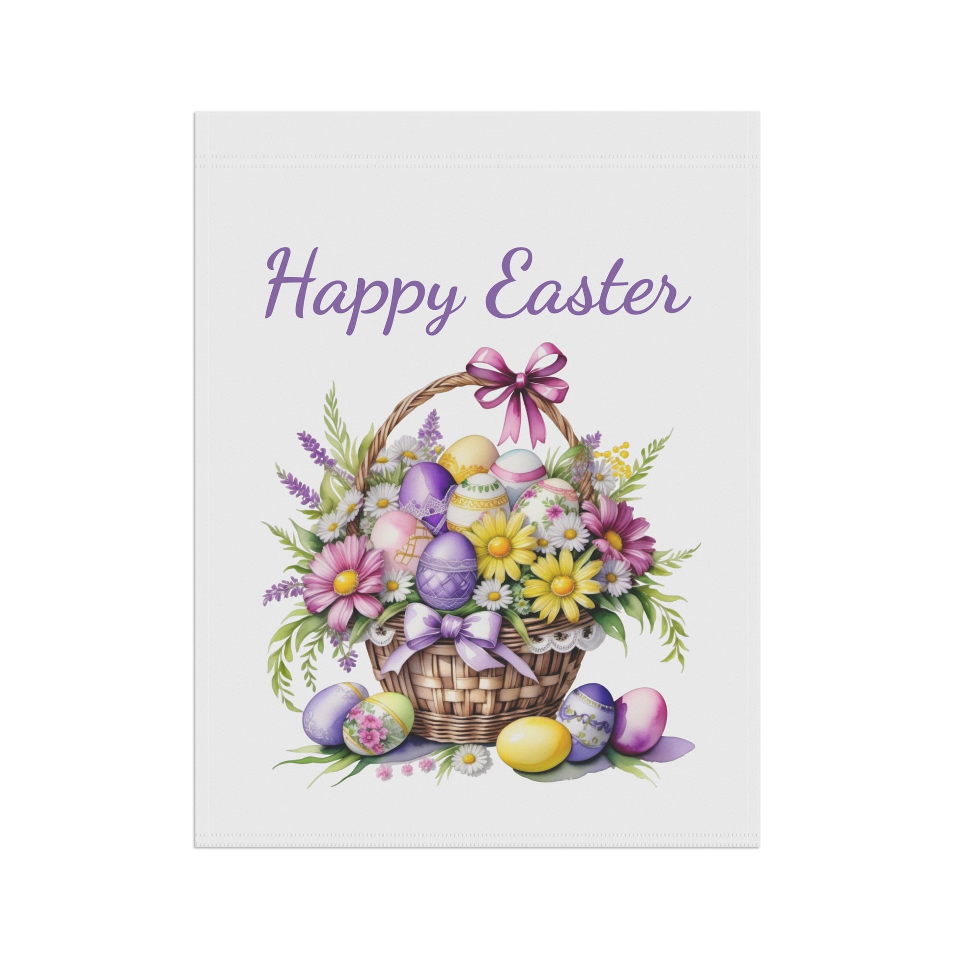 Welcome the Easter season with our delightful "Happy Easter" garden flag, showcasing a beautifully illustrated basket overflowing with pastel flowers and decorated Easter eggs. This charming and vibrant flag is the perfect addition to your outdoor space, adding a touch of festive cheer to your garden, patio, or front yard. Made from high-quality, durable, and weather-resistant material, this flag is designed to withstand the elements and maintain its brilliant colors year after year. It's a wonderful way to celebrate the holiday and add a warm, inviting feel to your home's exterior.