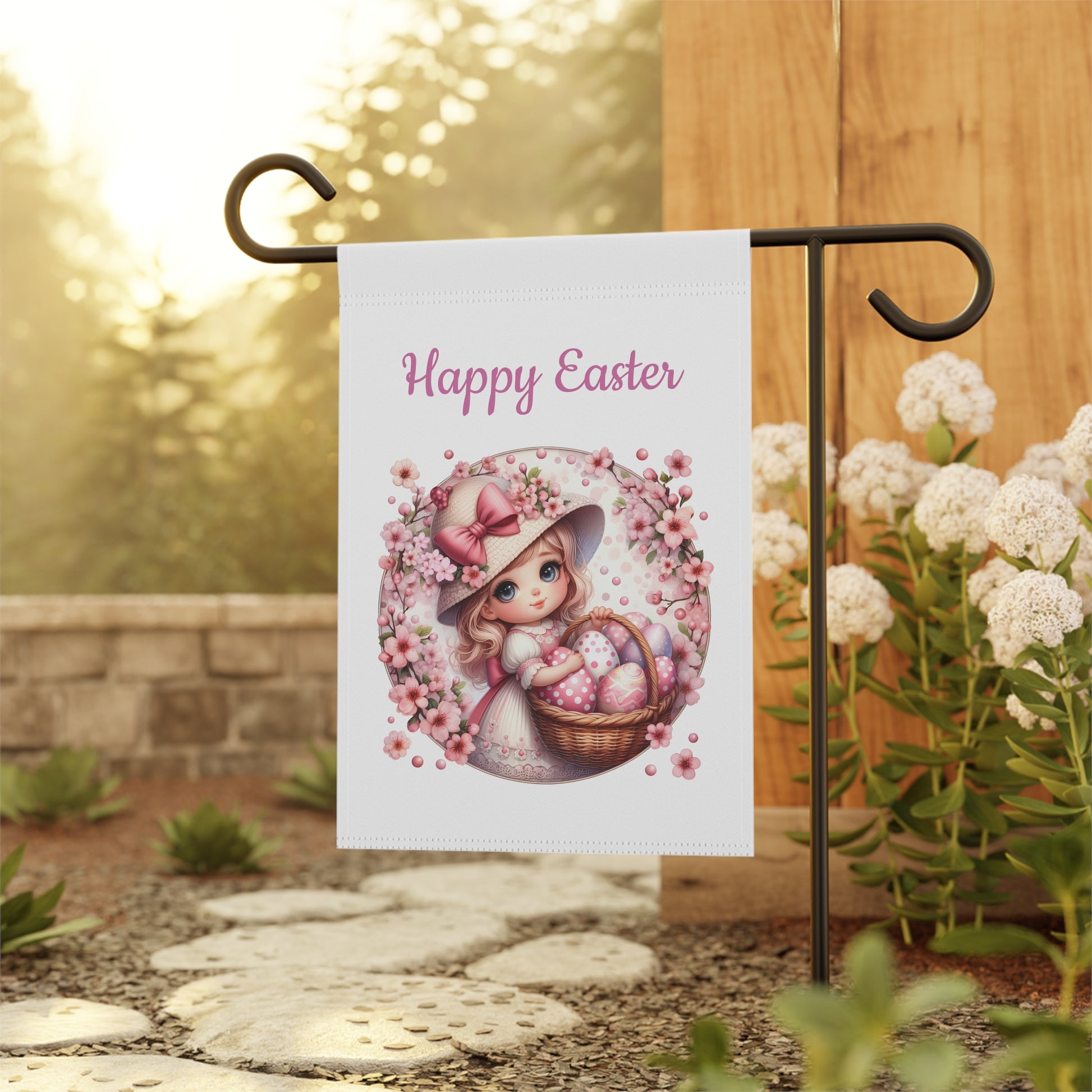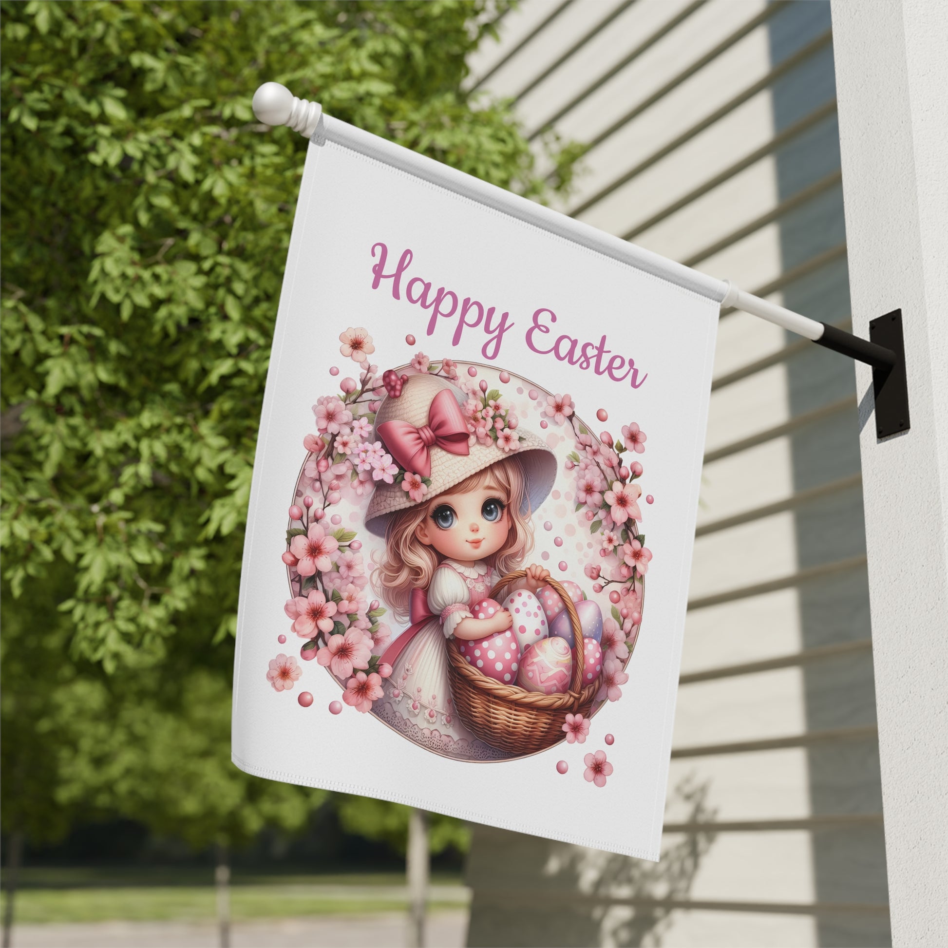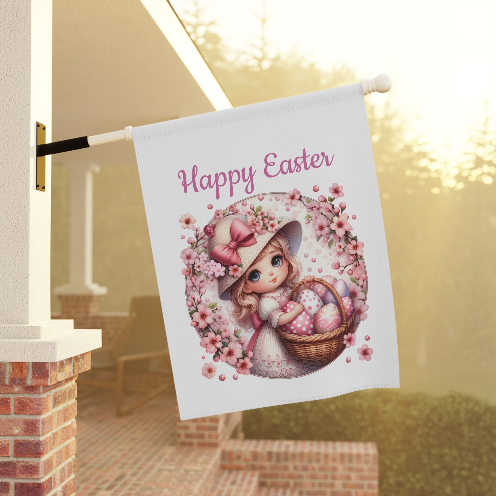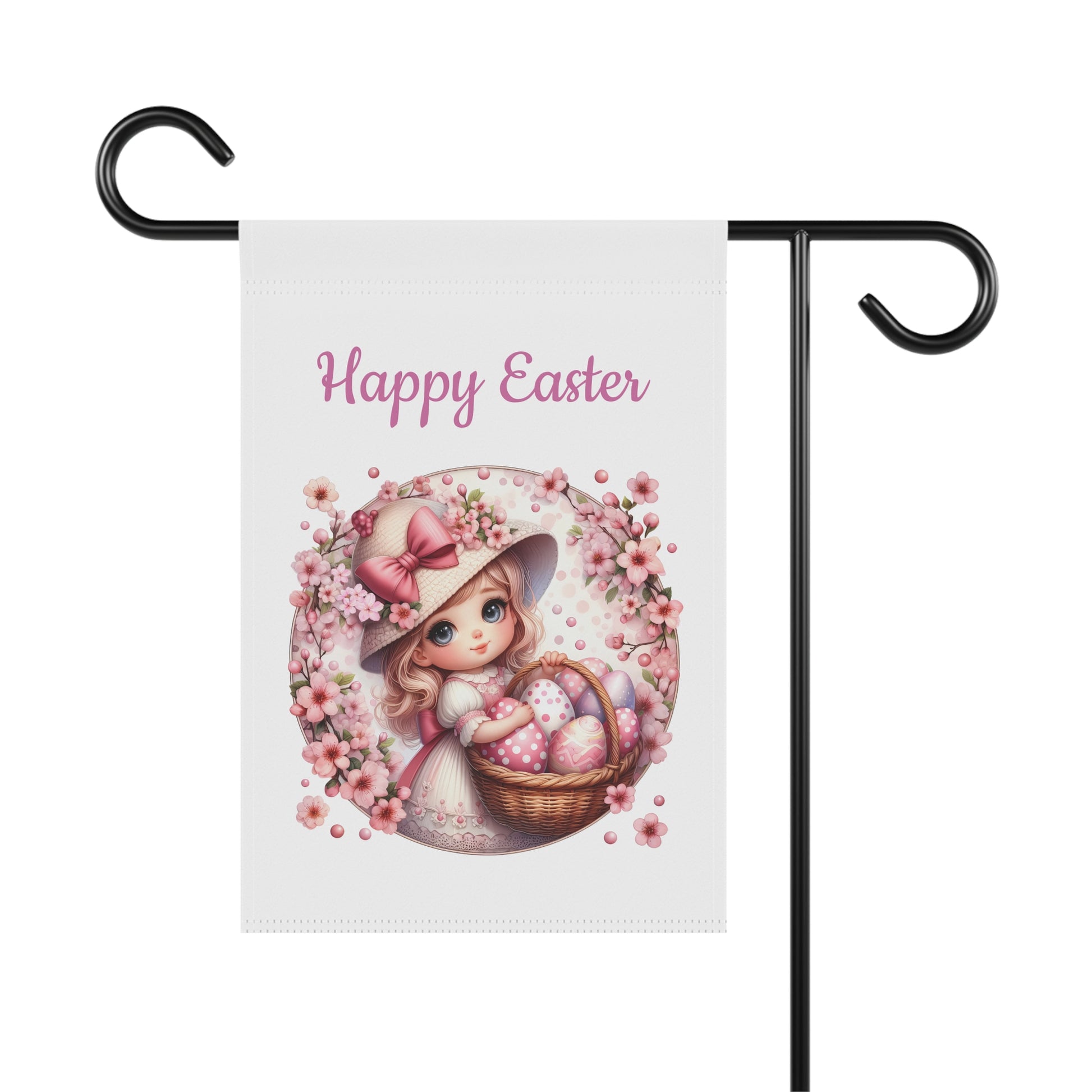 Welcome spring and the Easter season with our enchanting "Happy Easter" garden flag. This beautiful flag features a delightful illustration of a sweet little girl in a sun hat, holding a basket filled with decorated Easter eggs, all framed by a lovely wreath of cherry blossoms. It's the perfect way to add a touch of whimsy and charm to your yard, garden, or entryway. Made from high-quality, durable, and weather-resistant material, this flag is built to withstand the elements, ensuring its vibrant colors and beautiful design stay fresh and vibrant all season long.