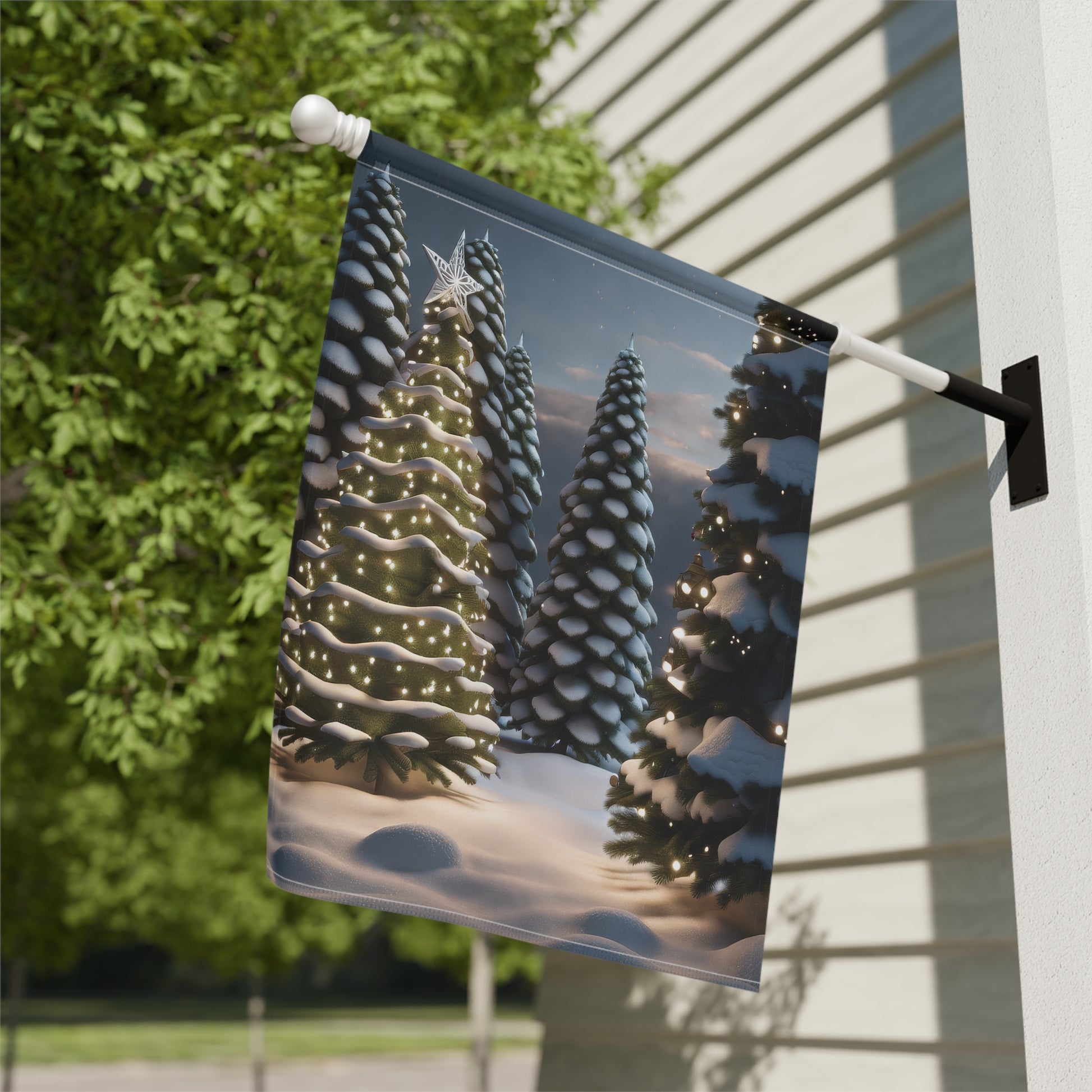 Welcome the winter season with our stunning holiday flag featuring a serene winter wonderland scene. This festive flag will add a touch of seasonal charm to your outdoor decor, perfect for celebrating the holidays in style.
