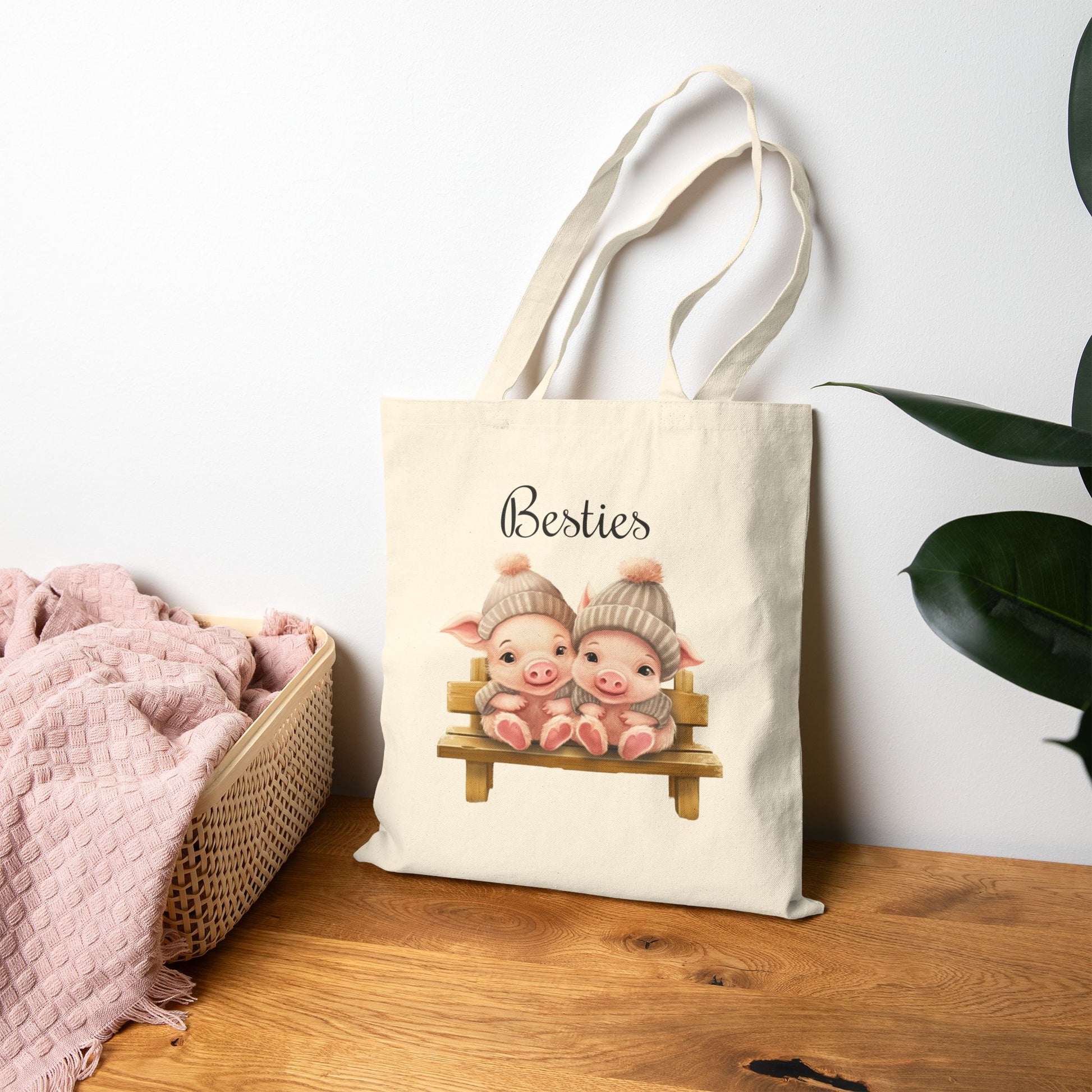Celebrate your special bond with your best friend with our "Besties" canvas tote bag. This heartwarming design features two adorable baby pigs sitting together on a bench, wearing matching hats and ready for a day out. It's the perfect way to show your appreciation for a best friend or a beloved family member.