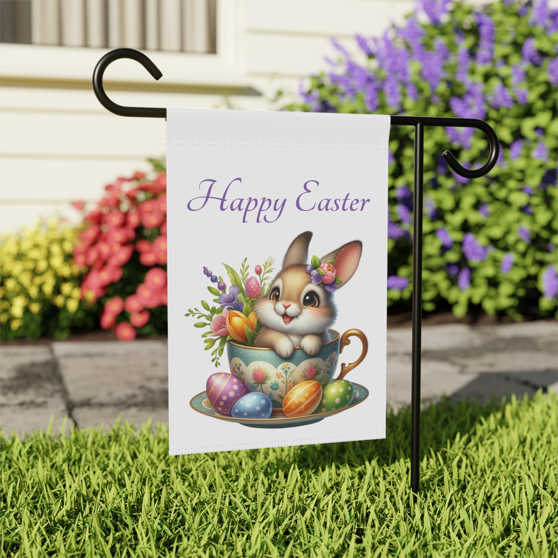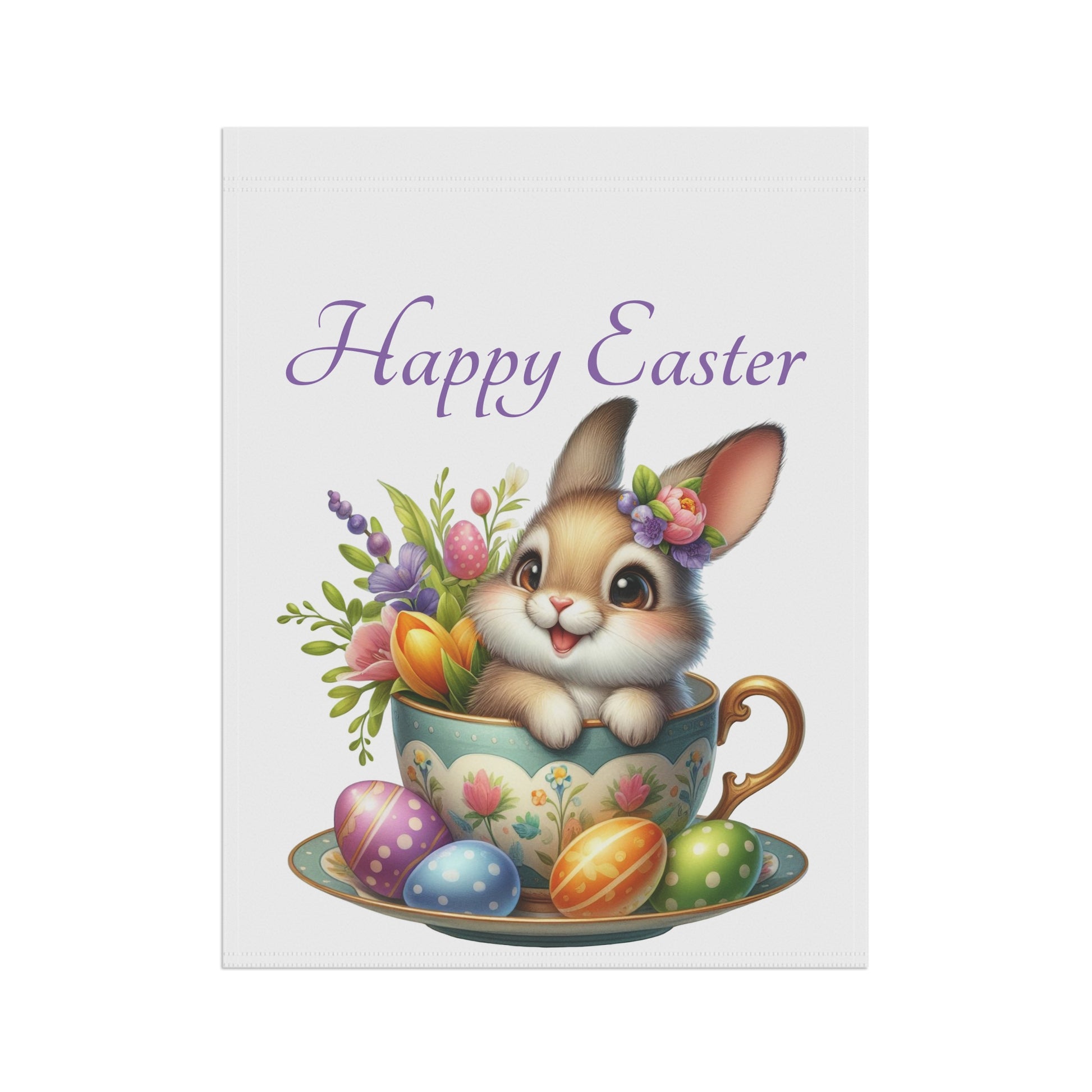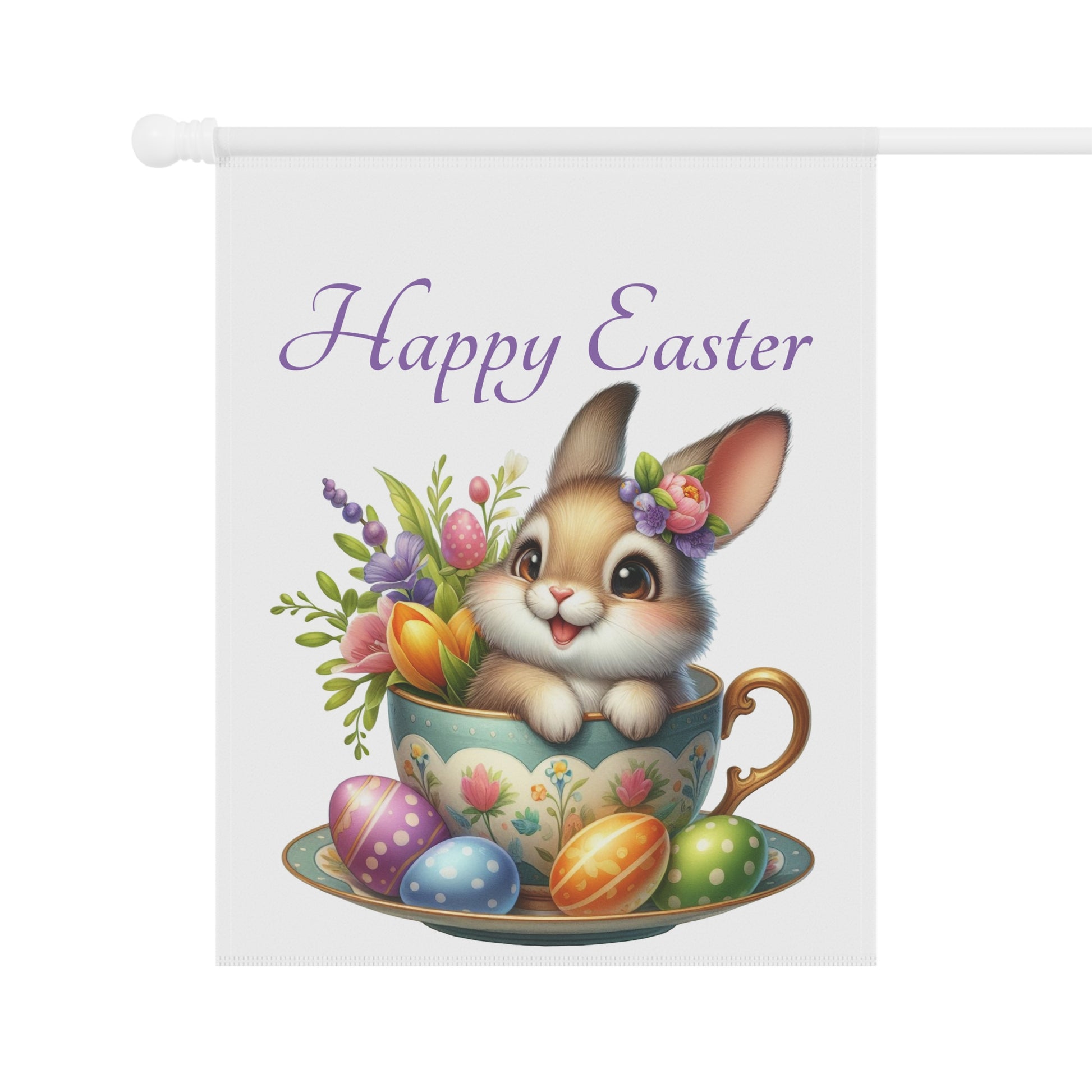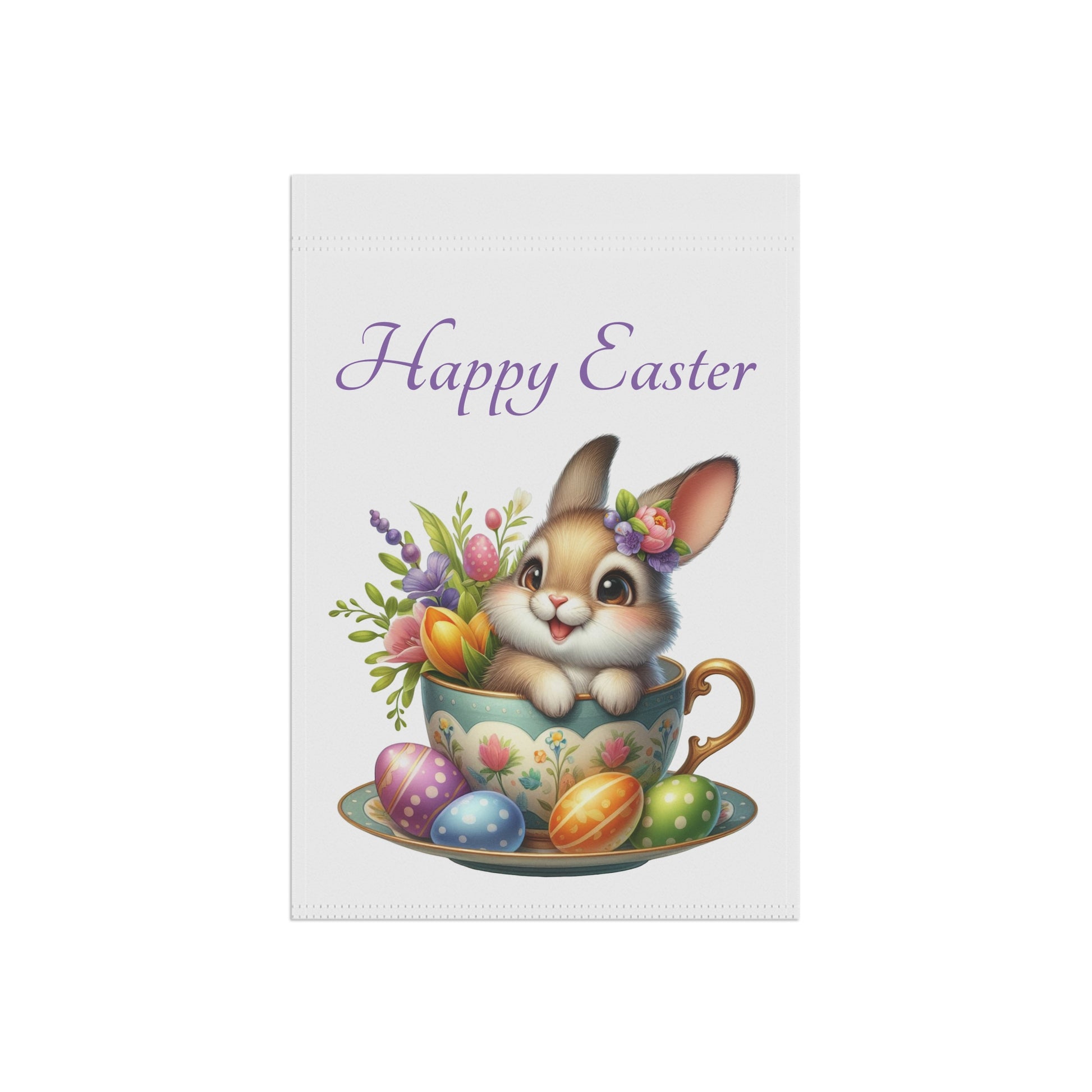 Bring a touch of whimsical charm to your garden this Easter with our delightful "Happy Easter" Garden Flag! This enchanting flag features an irresistibly cute brown bunny peeking out from a beautiful floral teacup, adorned with a tiny flower crown. Colorful Easter eggs are scattered around the teacup, surrounded by lovely spring blooms. The elegant "Happy Easter" message floats above, creating a warm and inviting display for your outdoor space. Made from high-quality, weather-resistant material, this durable flag is designed to withstand the elements, ensuring its vibrant colors and adorable scene remain bright and cheerful throughout the season.