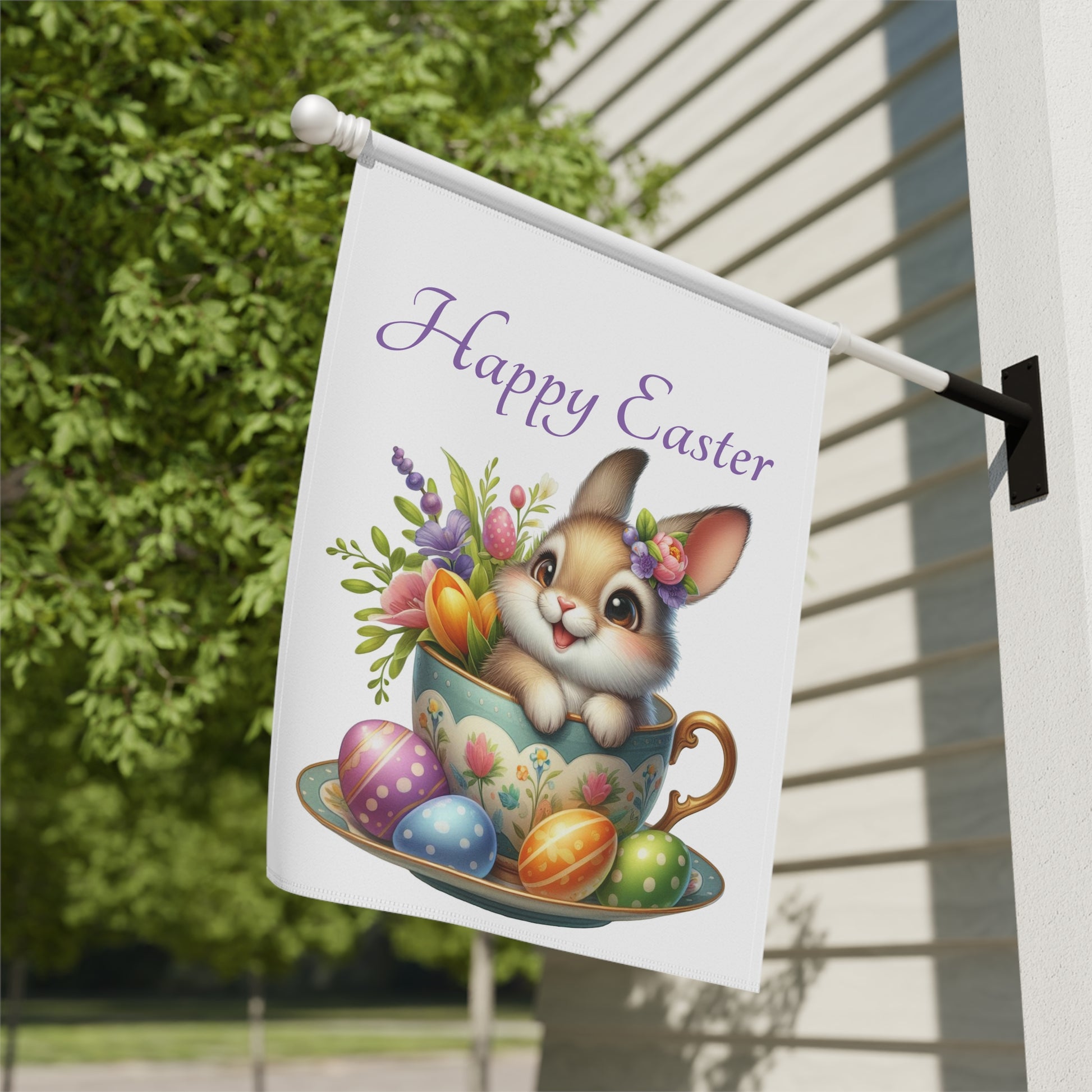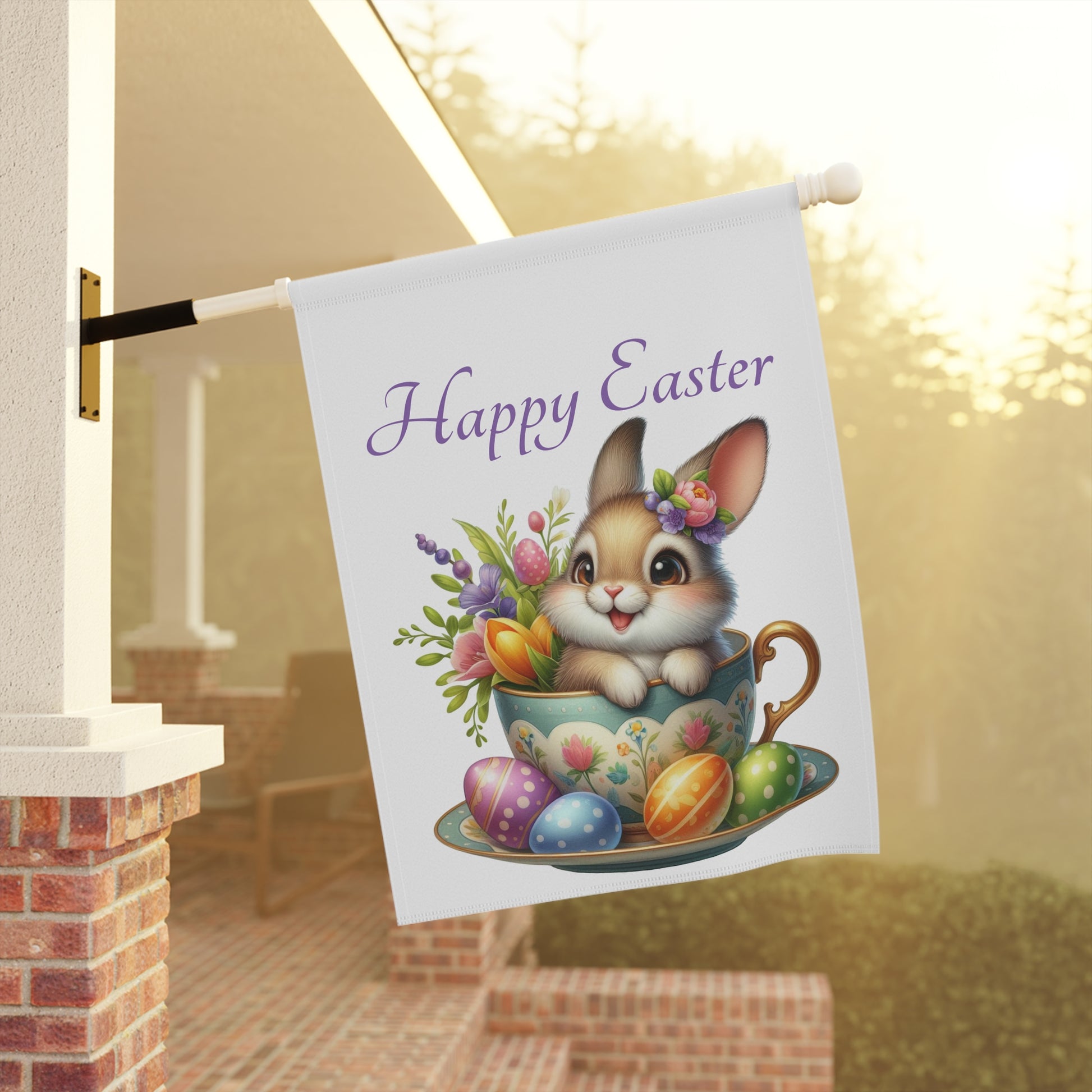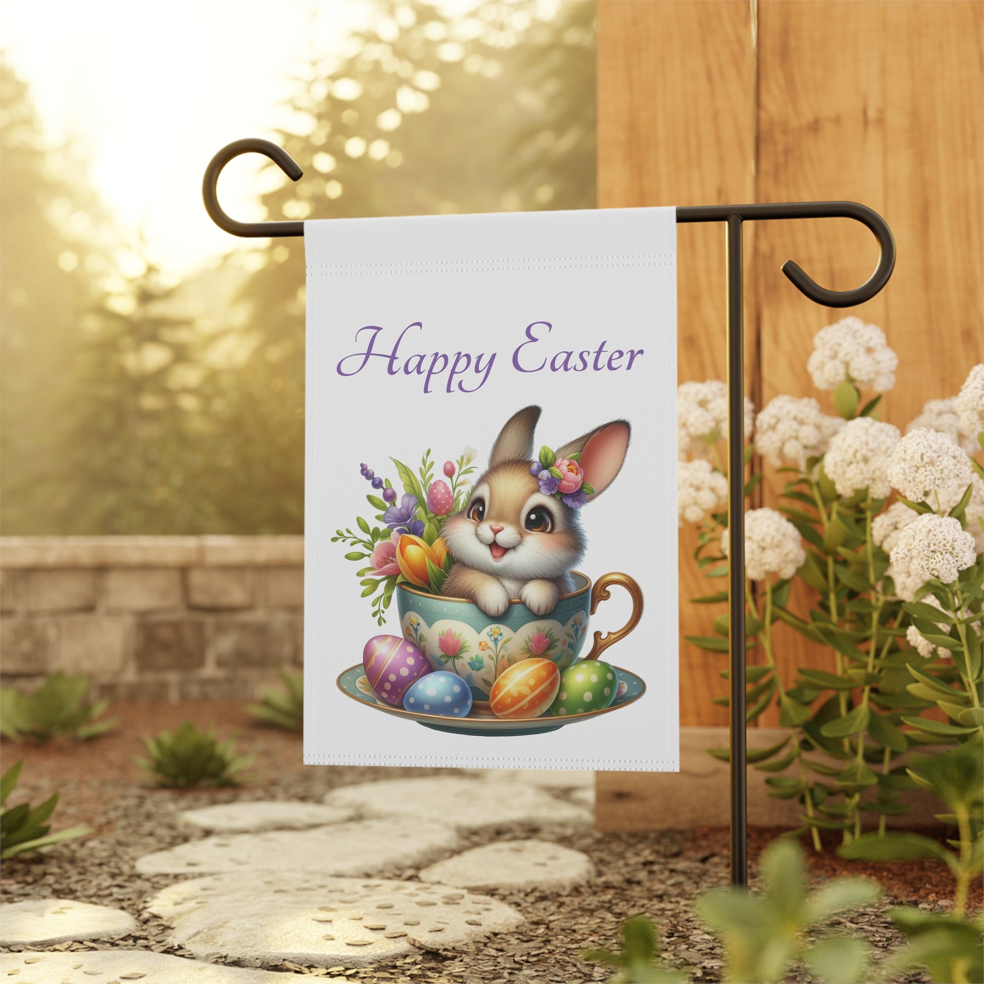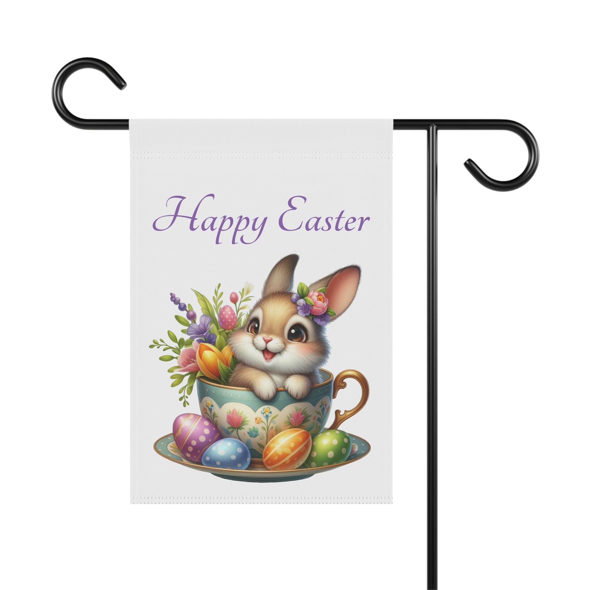 Bring a touch of whimsical charm to your garden this Easter with our delightful "Happy Easter" Garden Flag! This enchanting flag features an irresistibly cute brown bunny peeking out from a beautiful floral teacup, adorned with a tiny flower crown. Colorful Easter eggs are scattered around the teacup, surrounded by lovely spring blooms. The elegant "Happy Easter" message floats above, creating a warm and inviting display for your outdoor space. Made from high-quality, weather-resistant material, this durable flag is designed to withstand the elements, ensuring its vibrant colors and adorable scene remain bright and cheerful throughout the season.