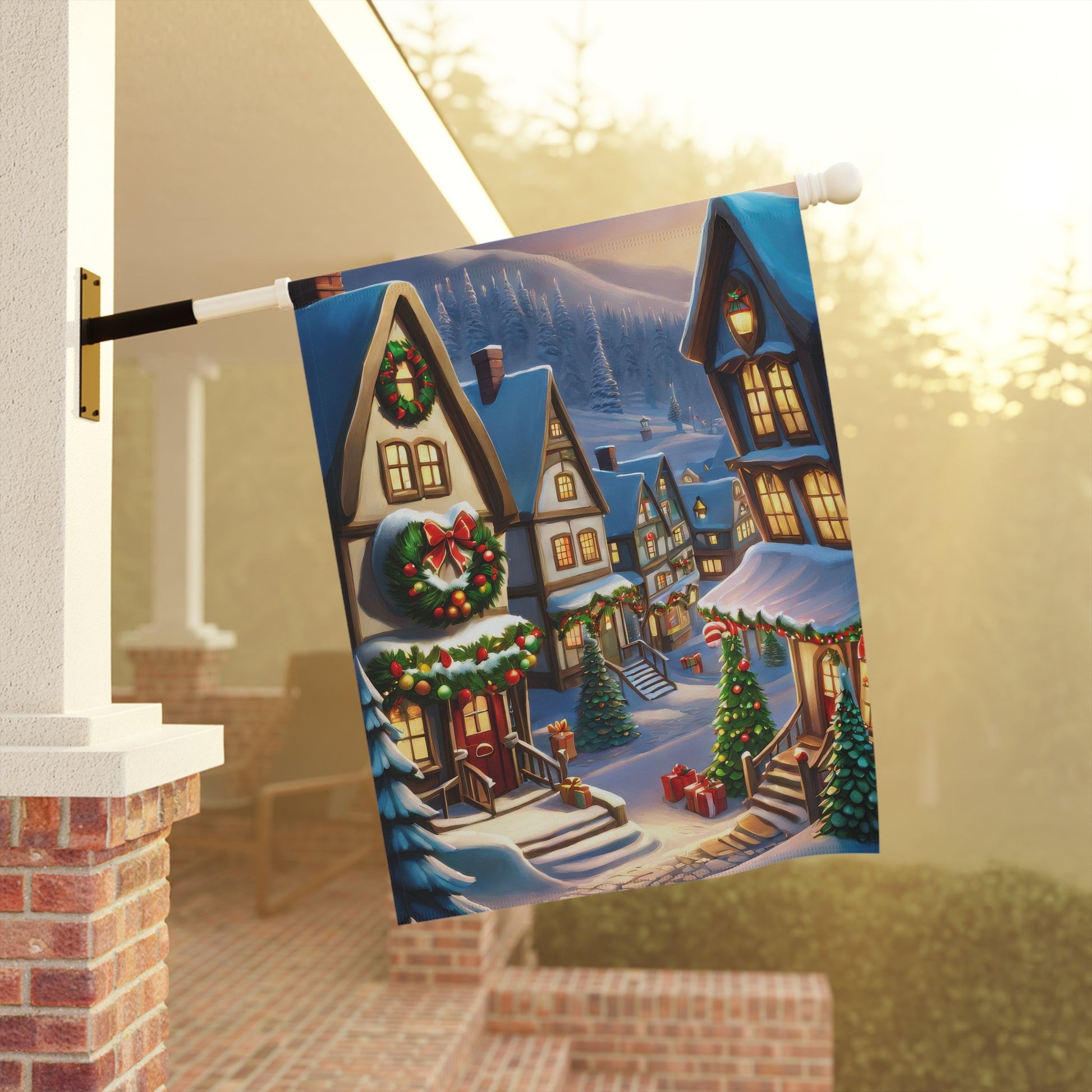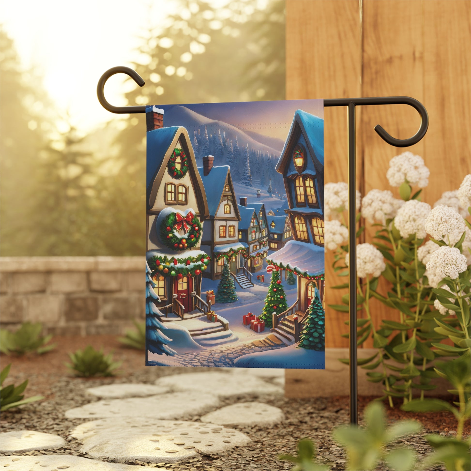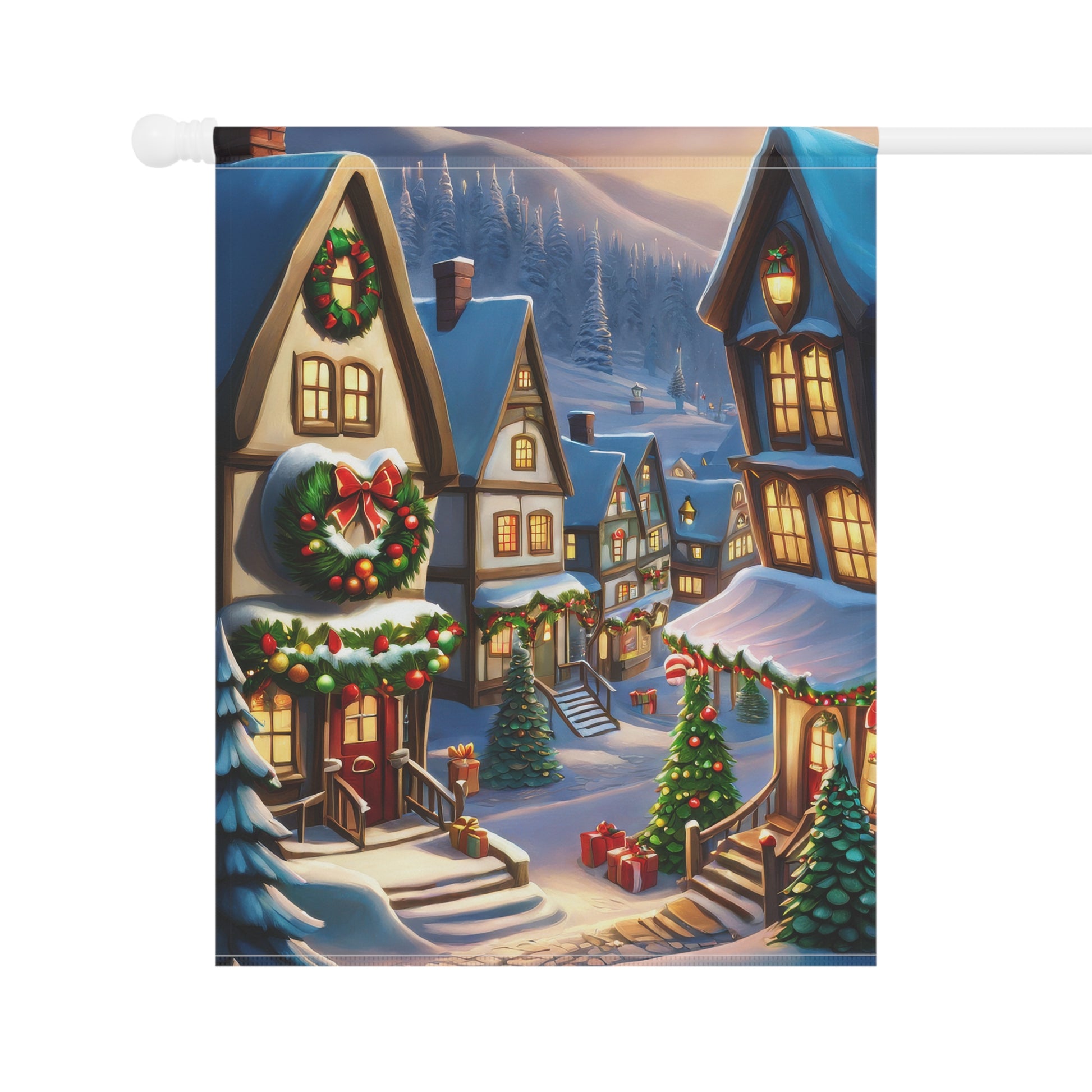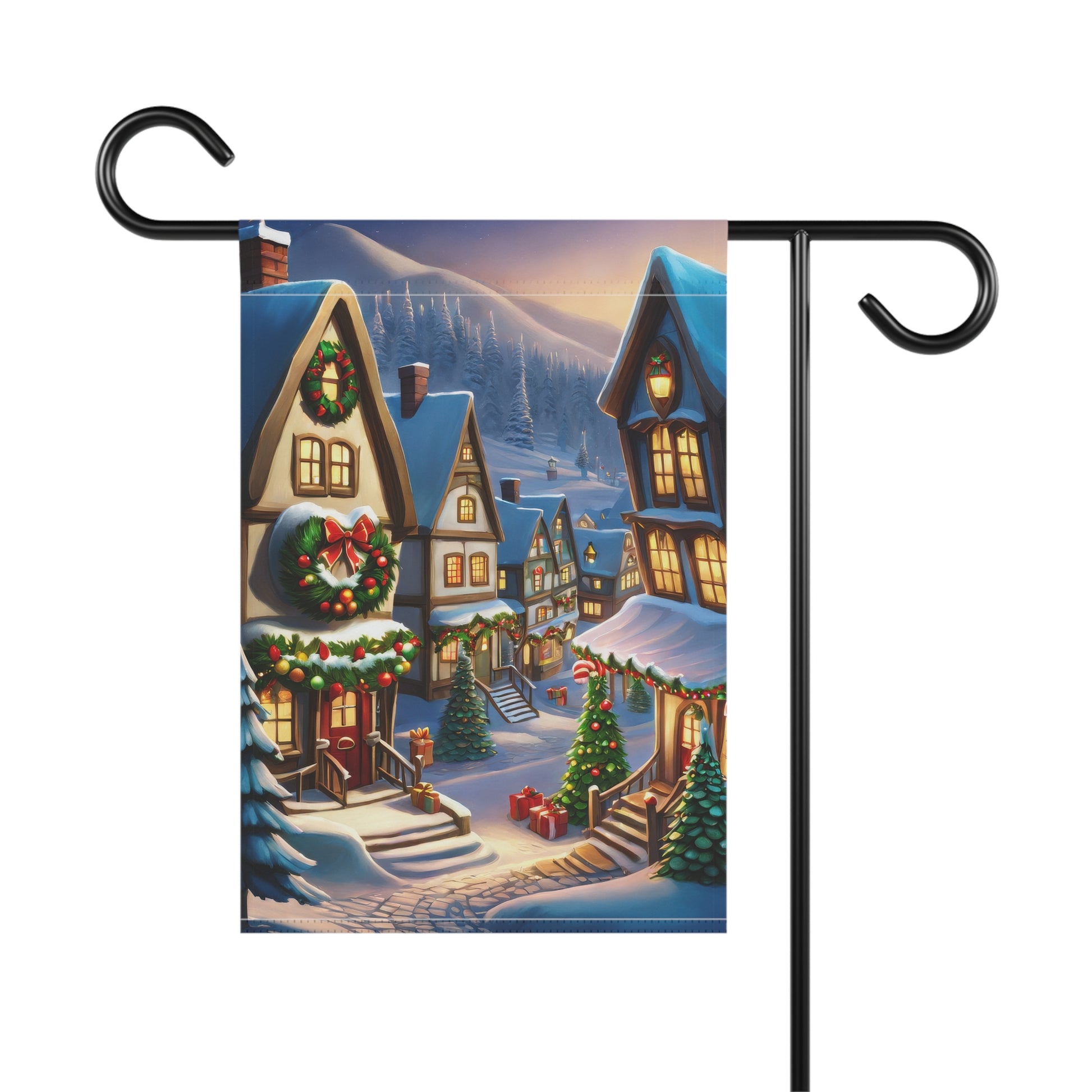Step into the vibrant spirit of a bustling Christmas village with our enchanting garden flag! This charming flag showcases a picturesque, snow-covered street lined with cozy, illuminated houses adorned with wreaths and garlands, and festive Christmas trees twinkling with lights. Distant snow-capped mountains add to the magical backdrop. It perfectly captures the joyful ambiance and cozy warmth of the holiday season. Crafted from durable, weather-resistant material, this flag is designed to withstand the elements and maintain its brilliant colors, ensuring lasting beauty throughout winter. Perfect for adding a magical and inviting touch to your garden, patio, or entryway. (Flag stand not included).