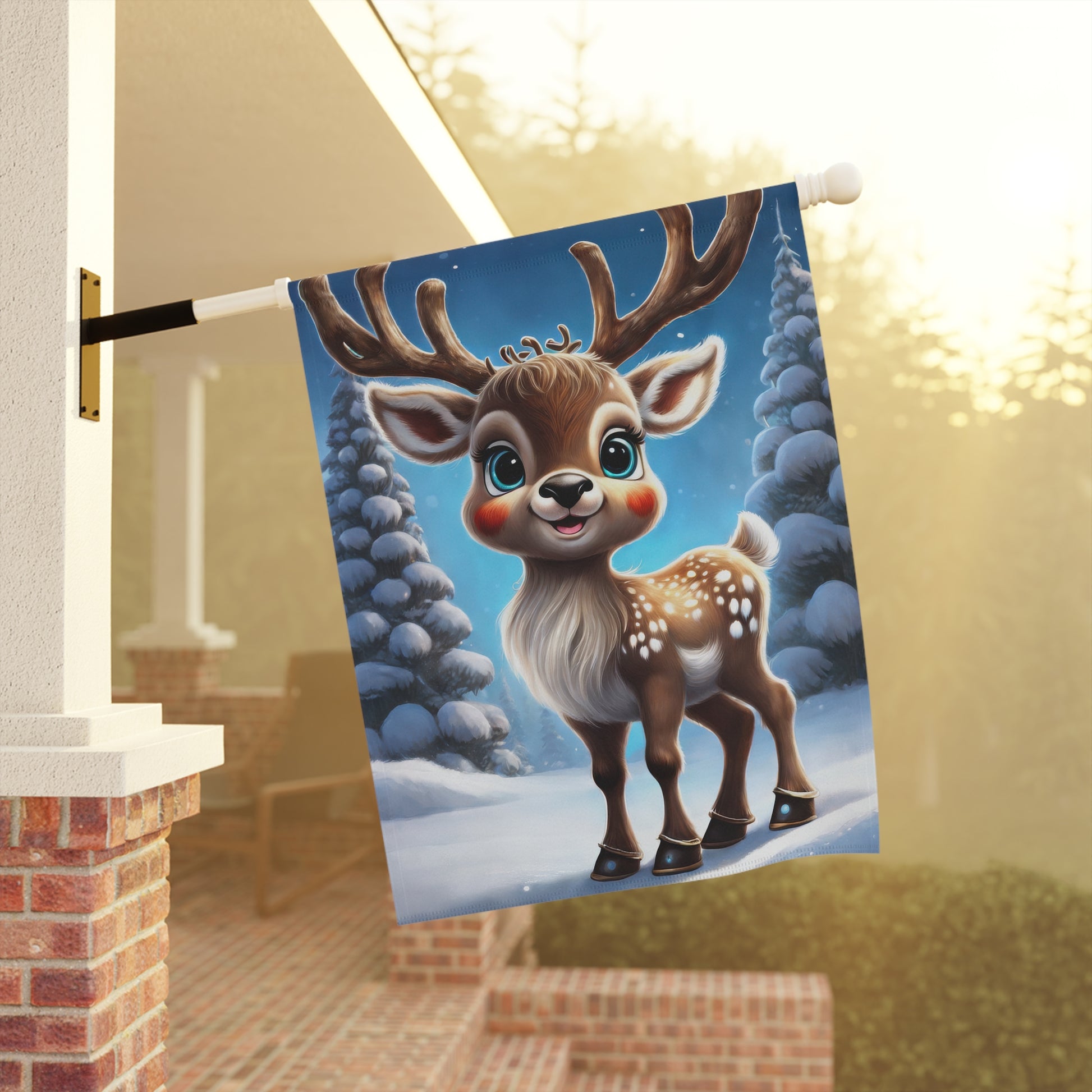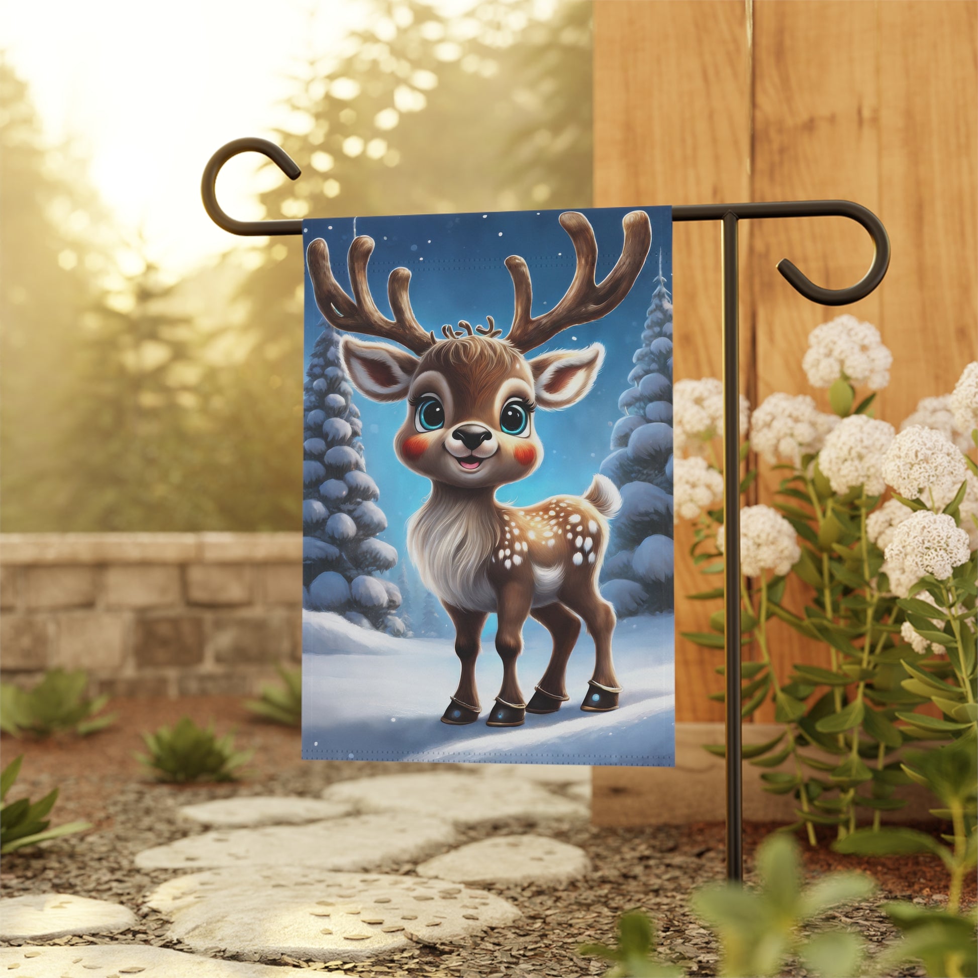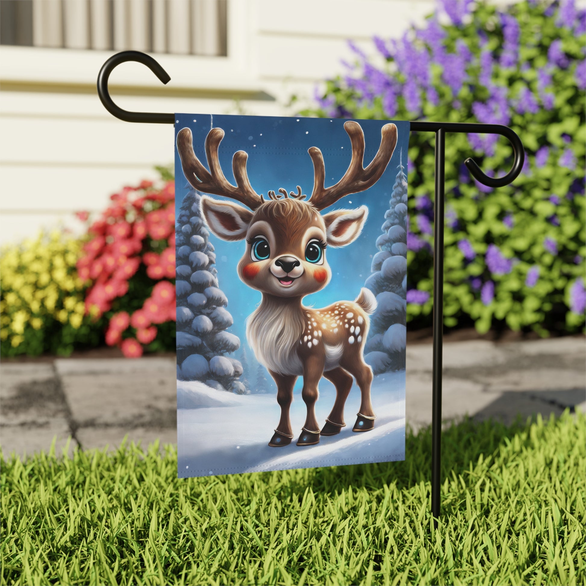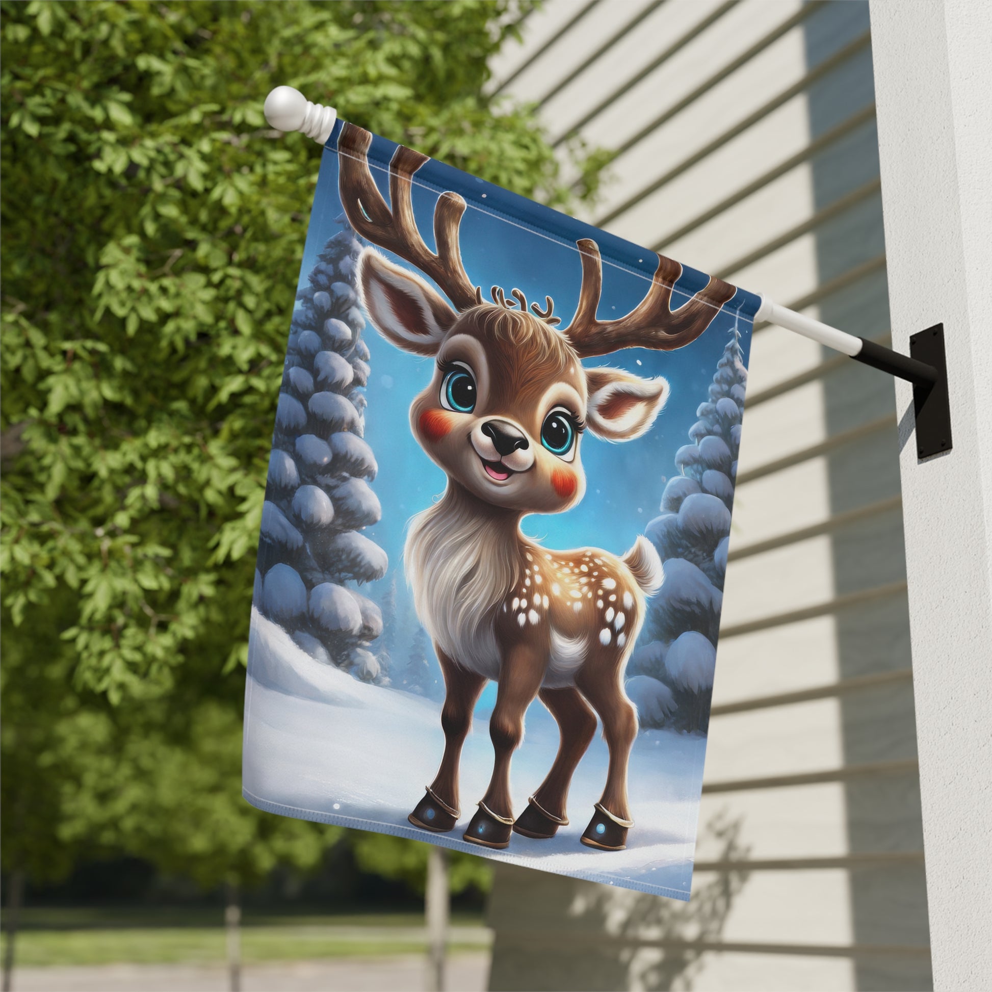 Bring a touch of enchanting charm to your garden with this adorable Reindeer Garden Flag! This sweet flag features a cute, smiling reindeer with big, blue eyes and rosy cheeks, standing proudly in a snowy forest of frosted pine trees under a beautiful blue winter sky. It's the perfect way to welcome guests and celebrate the magic of the holiday season and winter. Made from durable, weather-resistant material, it's designed to withstand the elements and maintain its vibrant charm all season long. Ideal for front yards, patios, and entryways, this flag is a delightful and heartwarming addition to your outdoor decorations.