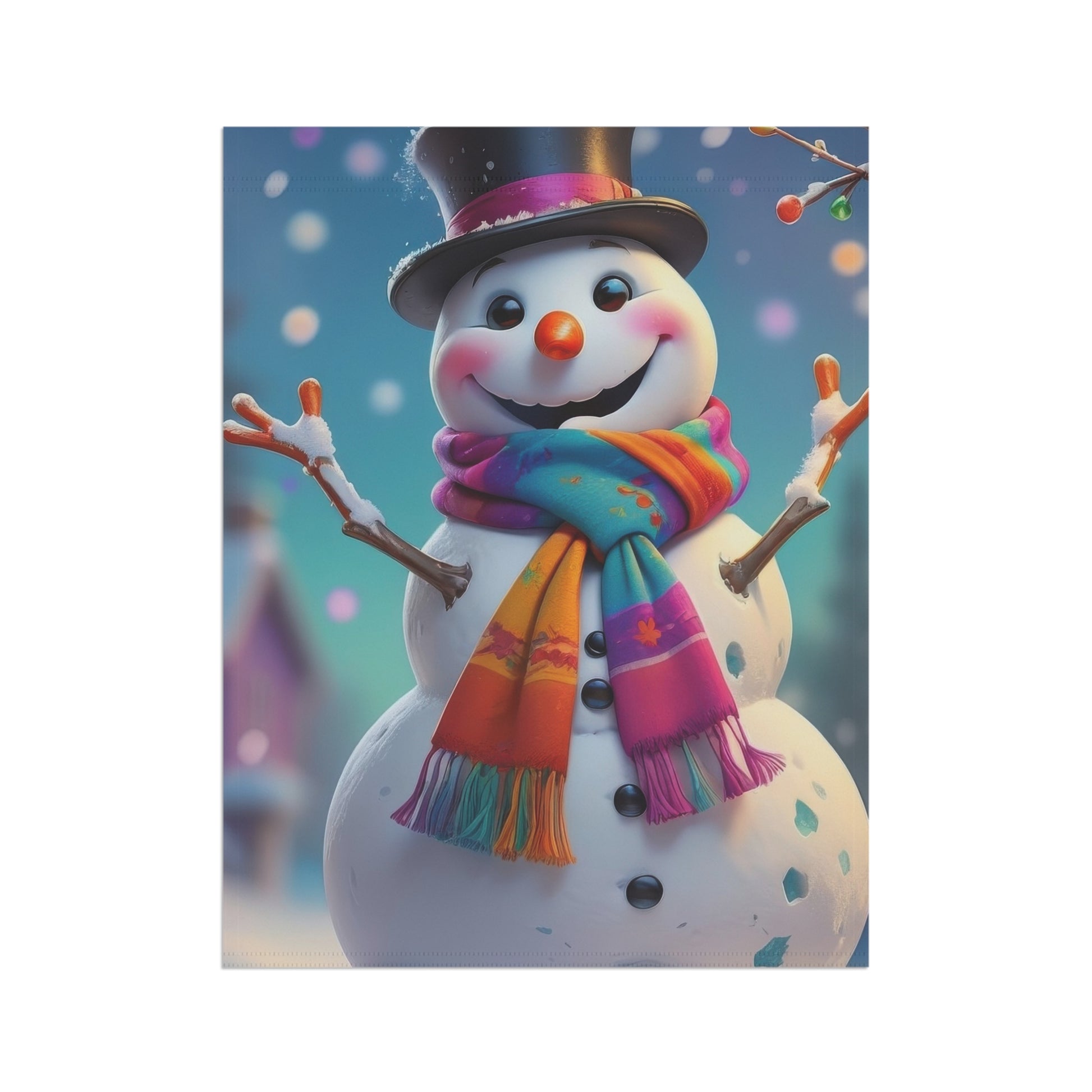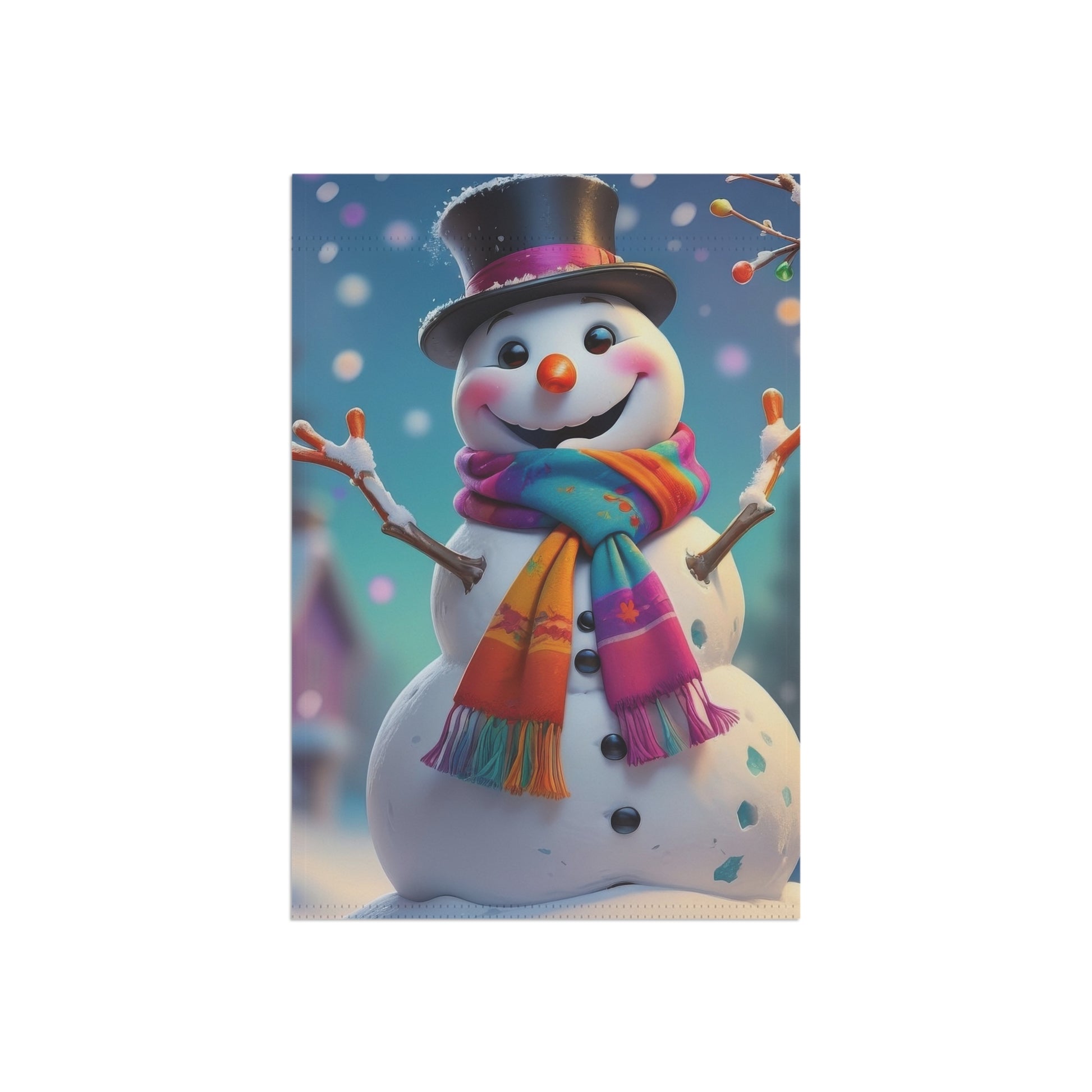 Bring a cheerful smile to your outdoor space with this delightful snowman garden flag! Featuring a classic snowman wearing a dapper top hat and a vibrant, colorful scarf, standing happily in a gently falling snow, this flag is perfect for adding a touch of festive fun and winter charm to your yard. Ideal for welcoming guests throughout the holiday season and the entire winter. Made from durable, weather-resistant material, this flag ensures vibrant colors and long-lasting display in your garden or front yard.