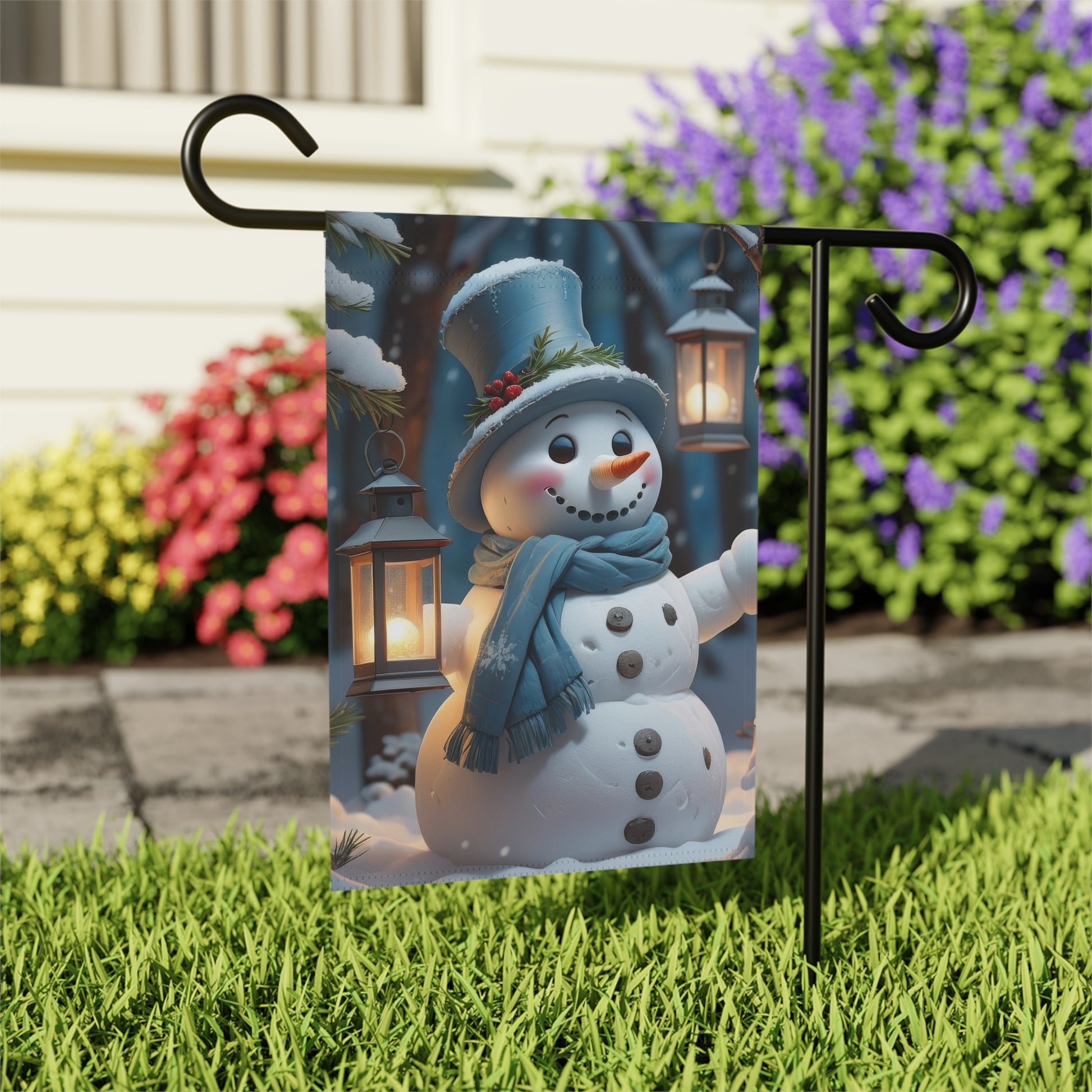 Brighten your home's exterior with this enchanting snowman garden flag! It features a delightful snowman, complete with a stylish top hat and a cozy blue scarf, standing joyfully in a snowy winter forest. The scene is illuminated by two charming, glowing lanterns, creating a warm and inviting atmosphere. This flag is perfect for adding a touch of whimsical fun and festive cheer to your yard throughout the holiday season and the entire winter. Ideal for welcoming guests or simply celebrating the magic of the colder months. Made from durable, weather-resistant material, this flag ensures vibrant colors and long-lasting display