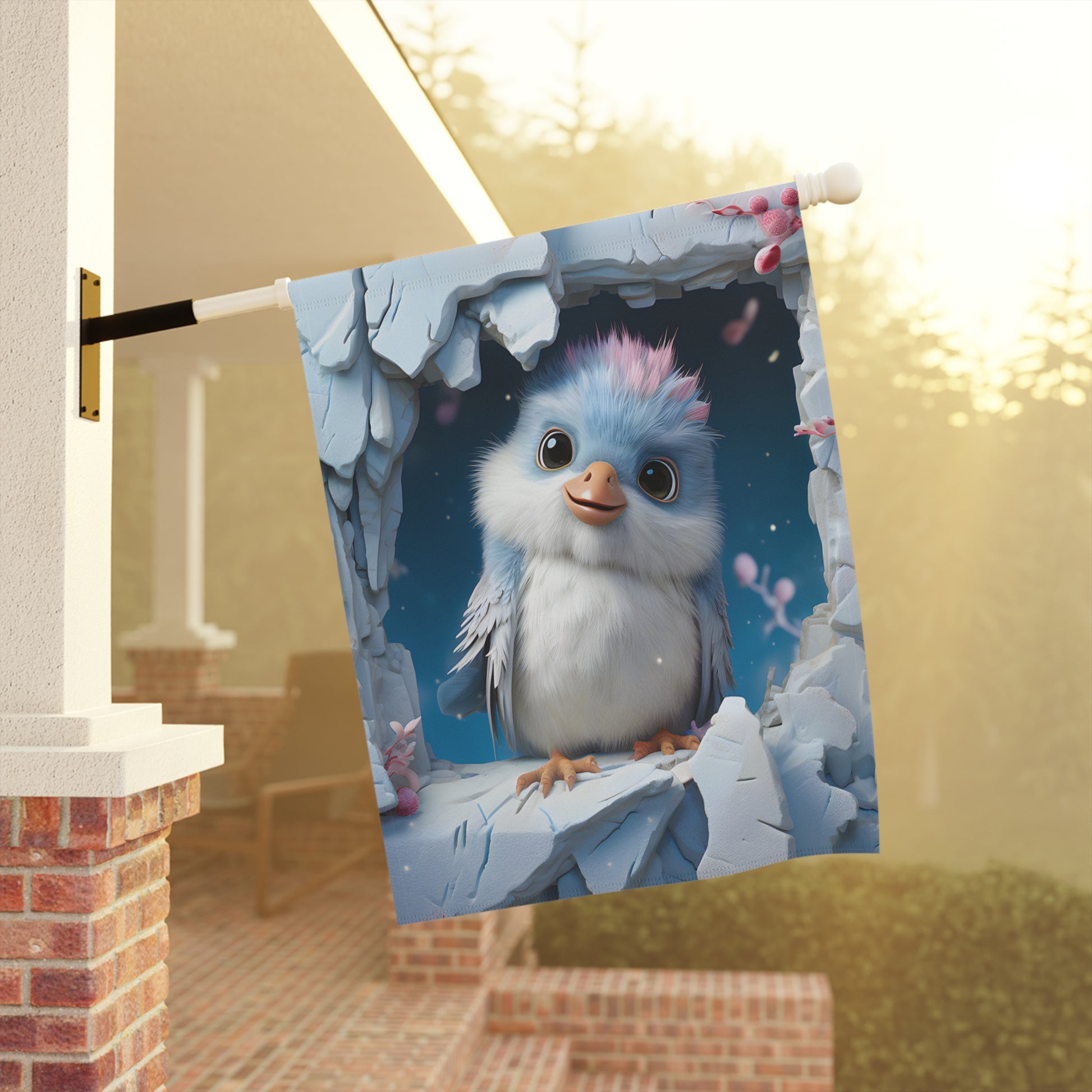 Welcome spring with this adorable baby bird garden flag, featuring a fluffy bluebird with pink-tipped feathers peeking through a charming window of stone and blossoms. Perfect for bird lovers and those who enjoy whimsical, cheerful garden decor, this durable outdoor flag adds a touch of cuteness to any yard, porch, or garden.
