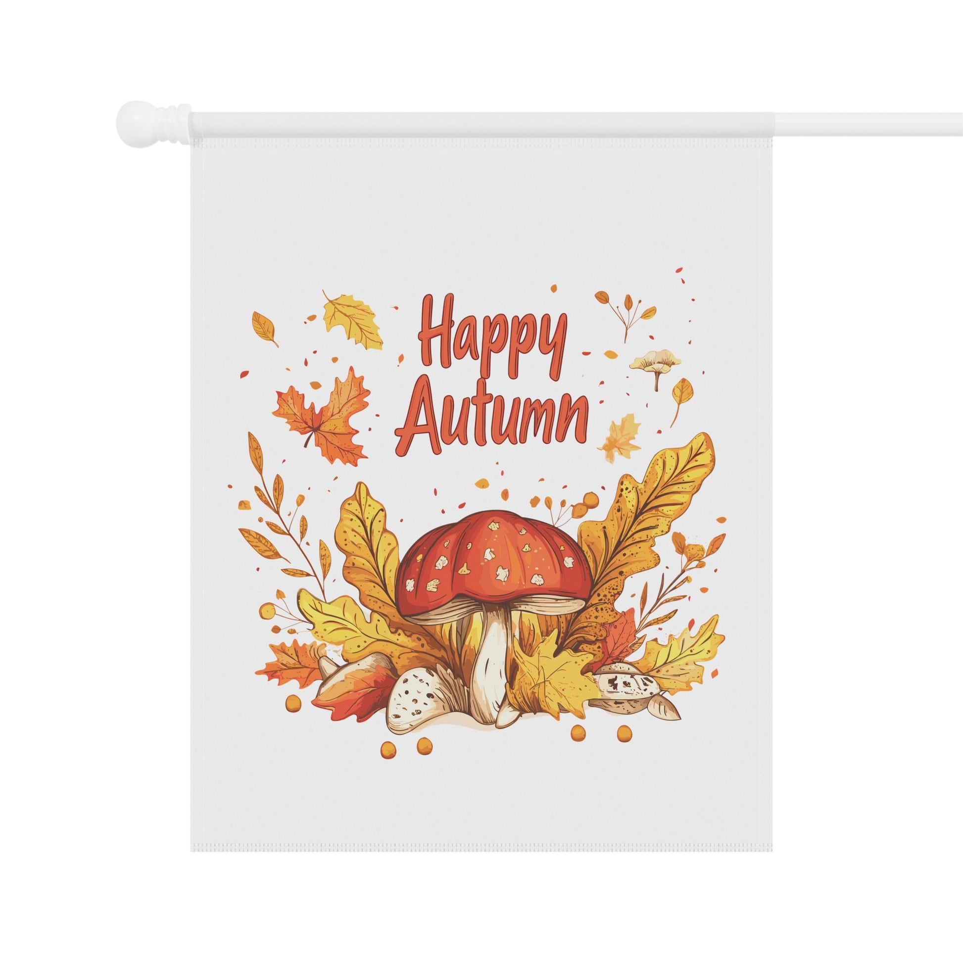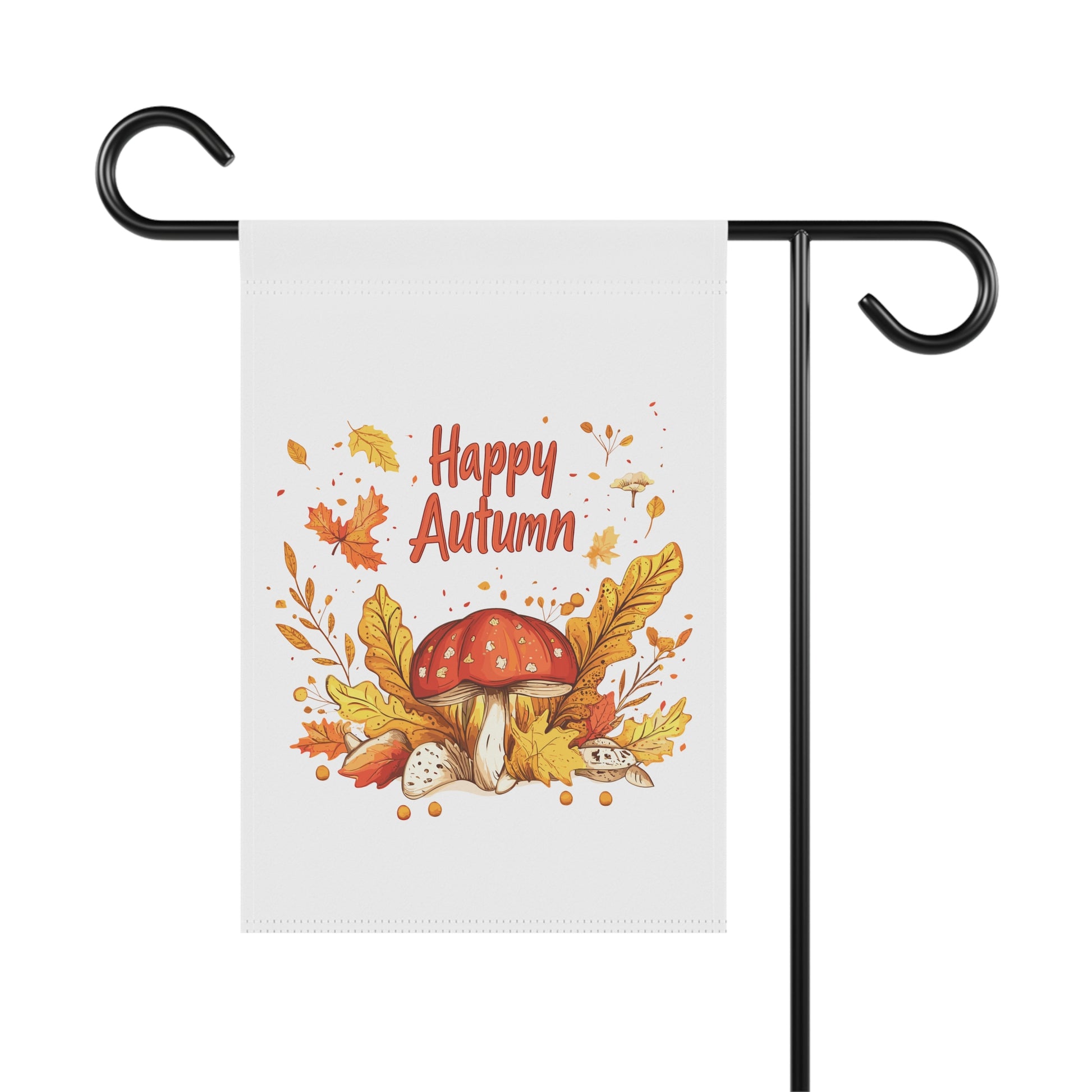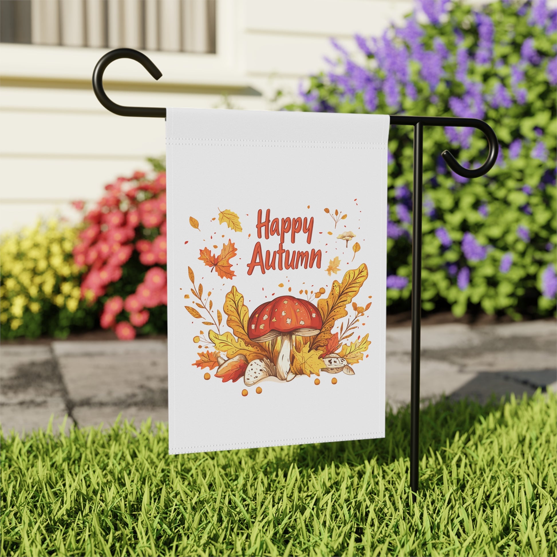 Celebrate the beauty of the season with this rustic "Happy Autumn" garden flag. This charming flag features a whimsical illustration of a large red and white toadstool mushroom nestled among a beautiful bed of vibrant autumn leaves and foliage. The playful "Happy Autumn" text adds a cheerful touch, making it the perfect way to welcome the fall season to your home. The design is printed on both sides, ensuring it looks beautiful from any angle. It fits most standard garden flag stands and is an ideal way to add a touch of seasonal warmth and rustic charm to your yard, garden, or porch.