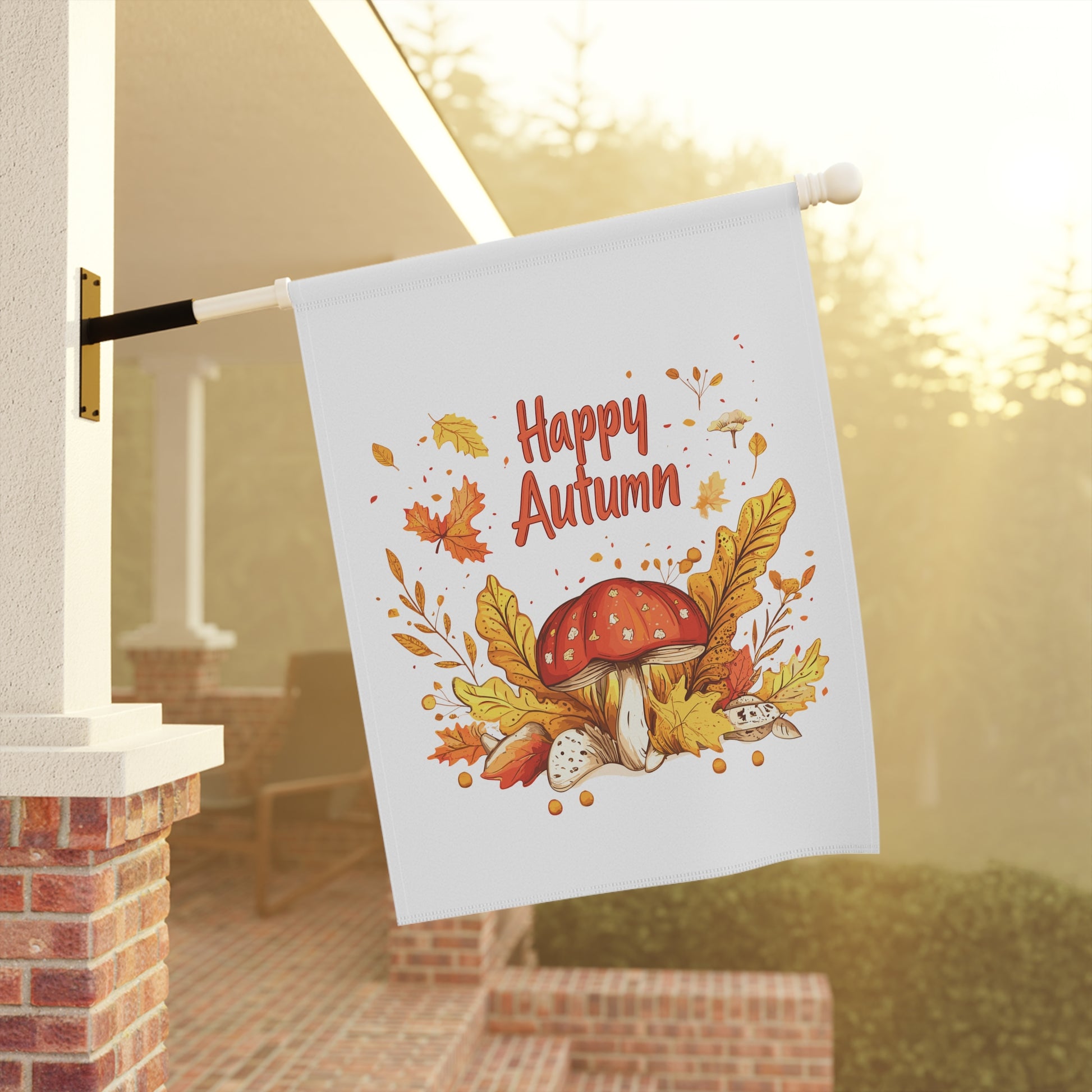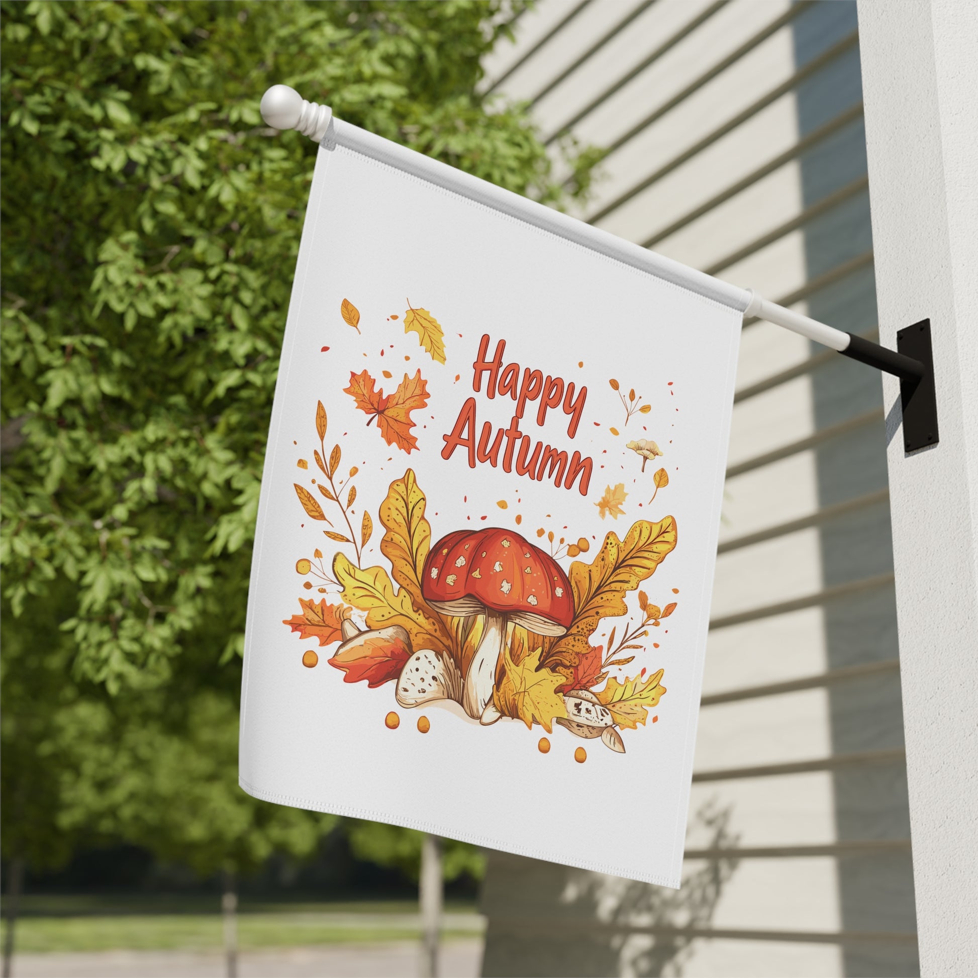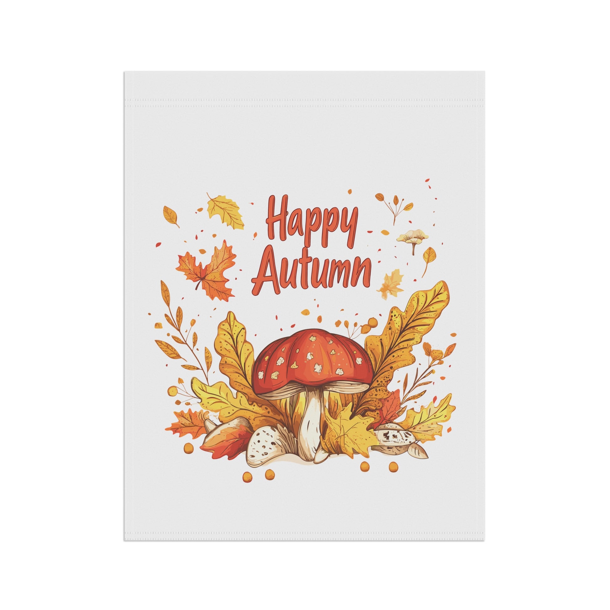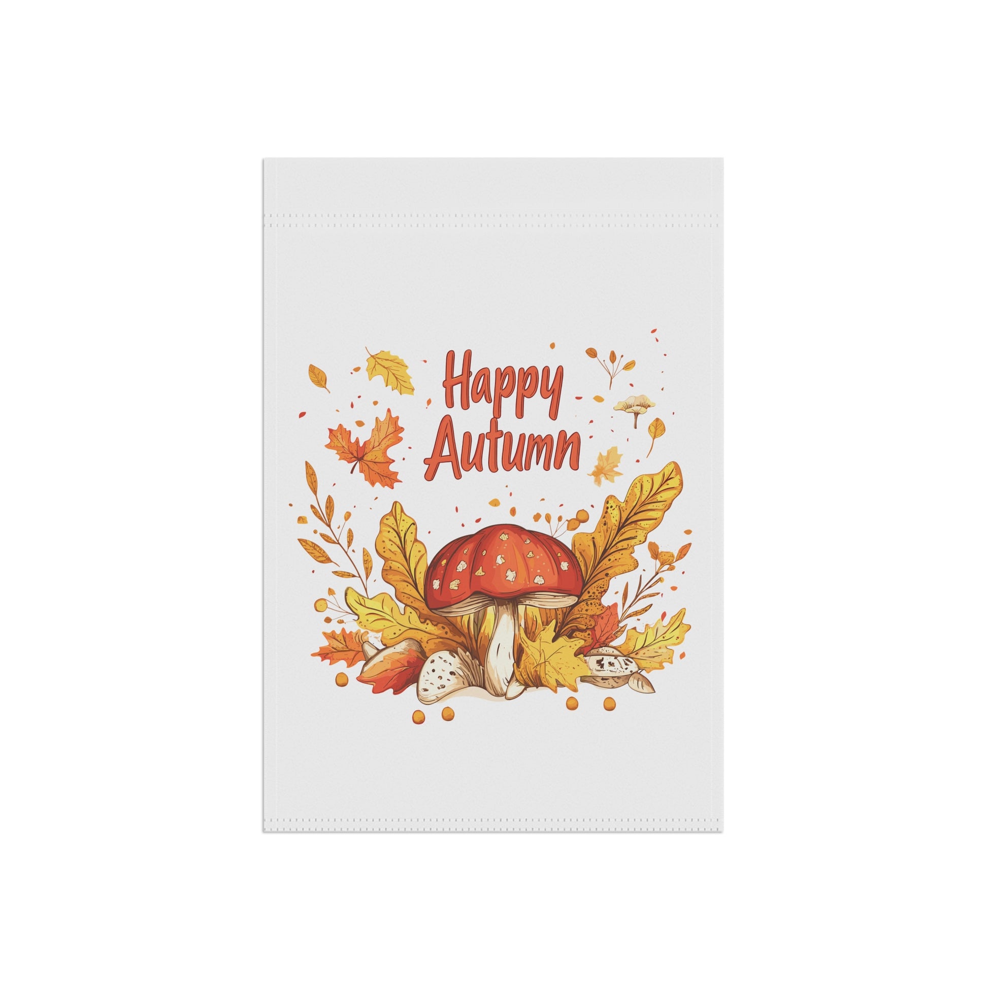 Celebrate the beauty of the season with this rustic "Happy Autumn" garden flag. This charming flag features a whimsical illustration of a large red and white toadstool mushroom nestled among a beautiful bed of vibrant autumn leaves and foliage. The playful "Happy Autumn" text adds a cheerful touch, making it the perfect way to welcome the fall season to your home. The design is printed on both sides, ensuring it looks beautiful from any angle. It fits most standard garden flag stands and is an ideal way to add a touch of seasonal warmth and rustic charm to your yard, garden, or porch.