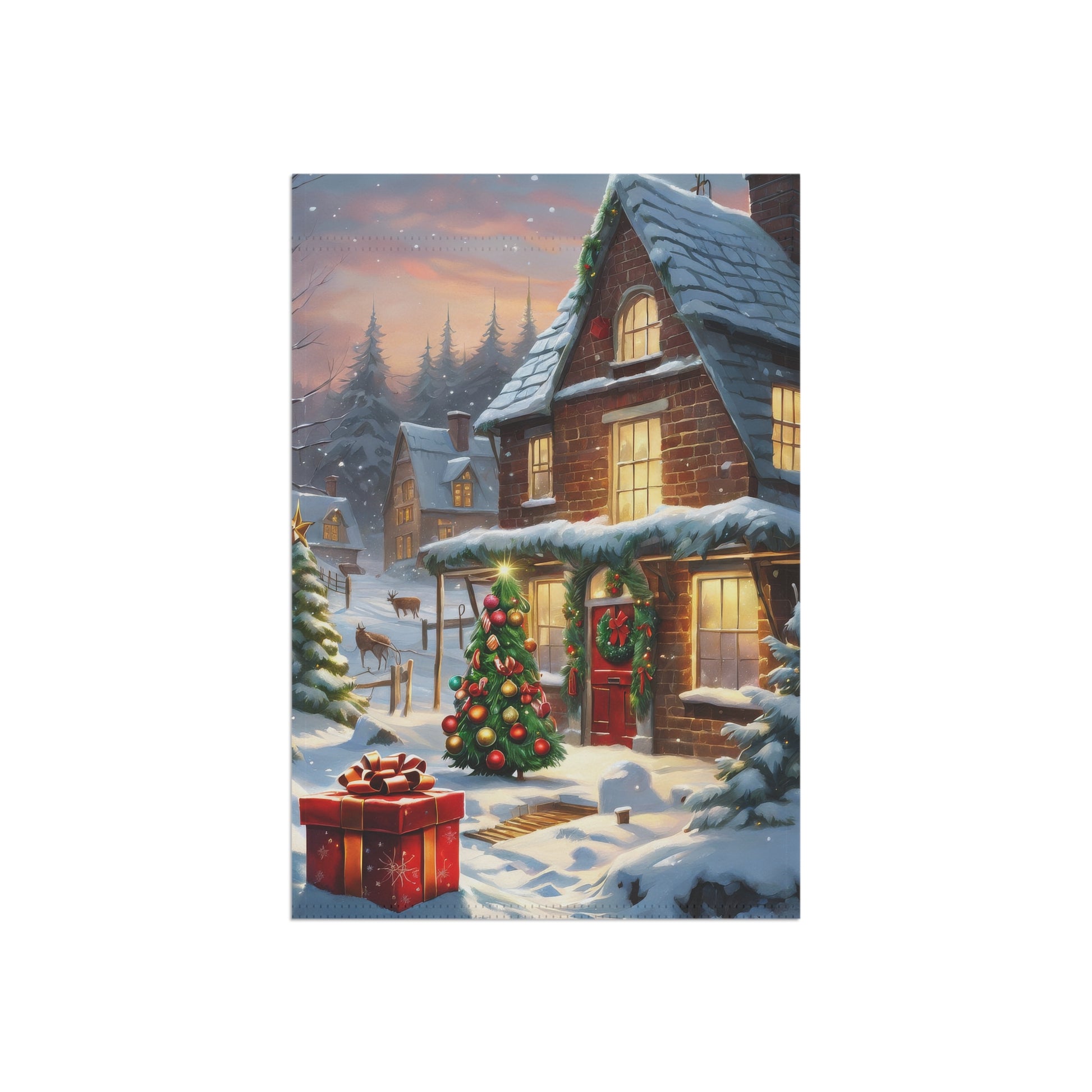 Bring the warmth and charm of a festive holiday scene to your outdoor space with this inviting garden flag. It features a beautifully decorated snow-covered cottage, complete with a twinkling Christmas tree and a large red present, set against a serene winter landscape with a colorful sunset sky. This durable, weather-resistant flag is designed to withstand the elements and keep its vibrant colors, making it a perfect addition to your garden, patio, or entryway throughout the Christmas season. A wonderful way to spread holiday cheer and create a welcoming atmosphere for friends and family. (Flag stand not included).