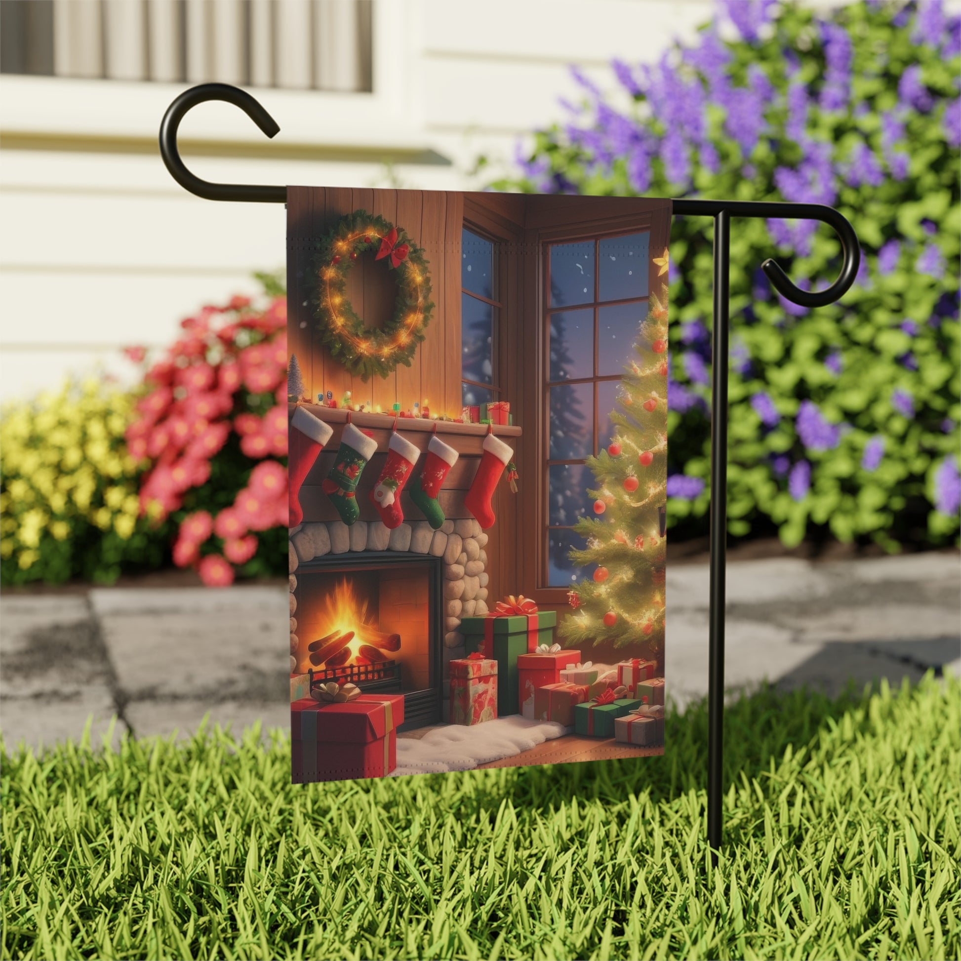 Bring the warmth and cheer of a cozy Christmas evening to your outdoor space with this delightful garden flag! It features a classic festive scene: a roaring fireplace with stockings hung, a beautiful wreath above the mantle, a brightly lit Christmas tree, and presents waiting to be unwrapped. This flag perfectly captures the heartwarming essence of the holidays, making it an ideal addition to your Christmas decor, welcoming guests, or simply spreading joyful holiday spirit. Made from durable, weather-resistant material, this flag ensures vibrant colors and long-lasting display throughout the winter season.