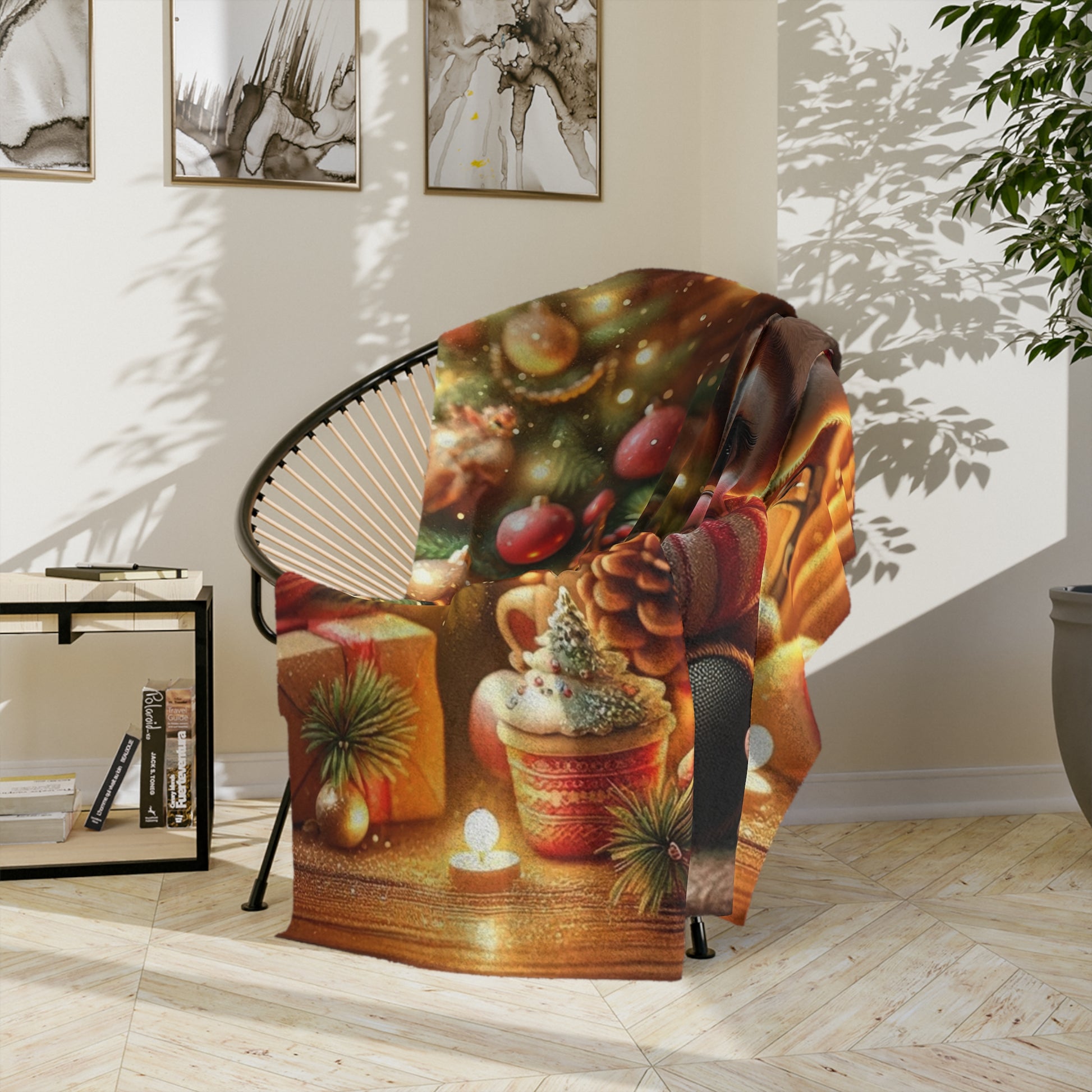 Snuggle up and get into the holiday spirit with our Cozy Reindeer with Hot Cocoa Velveteen Blanket. This super-soft, lightweight blanket is a perfect way to add a heartwarming touch to your festive decor. The charming illustration features an adorable, big-eyed reindeer in a Santa hat and scarf, happily holding a mug of hot cocoa in a cozy, glowing Christmas scene with a decorated tree and flickering candles. ts lightweight design makes it an ideal throw for your couch, a festive accent for your bed, or a snuggle companion for chilly winter nights.