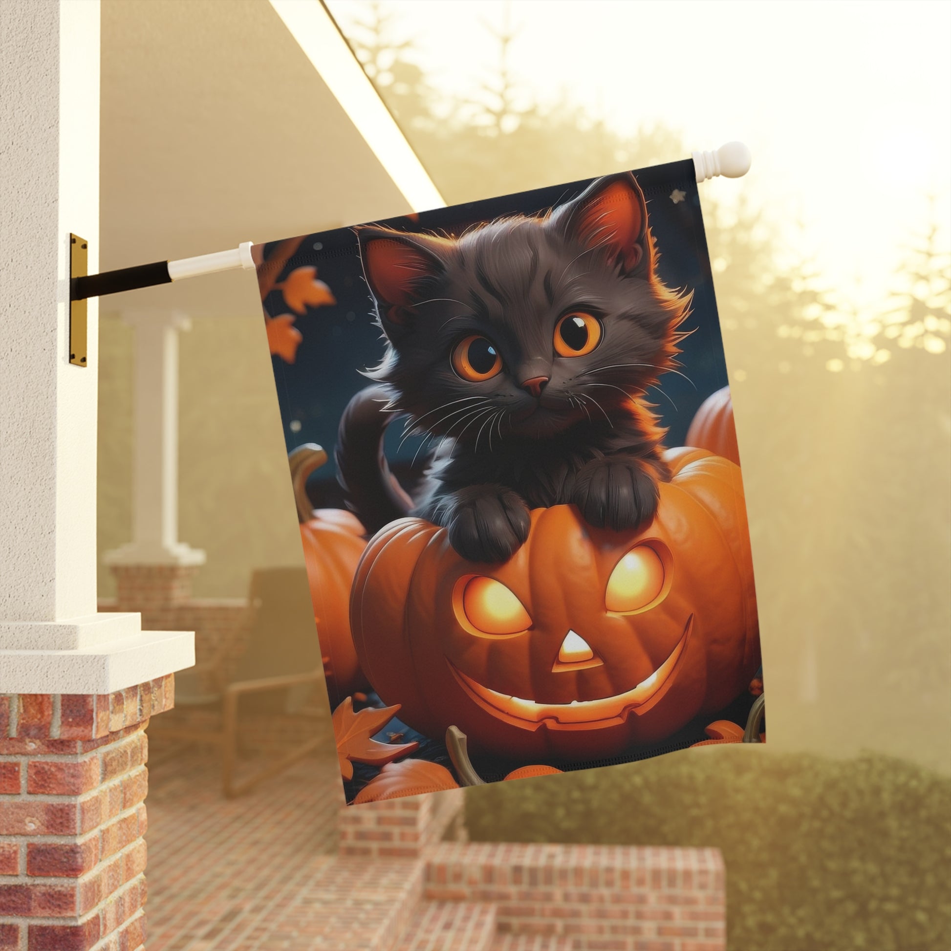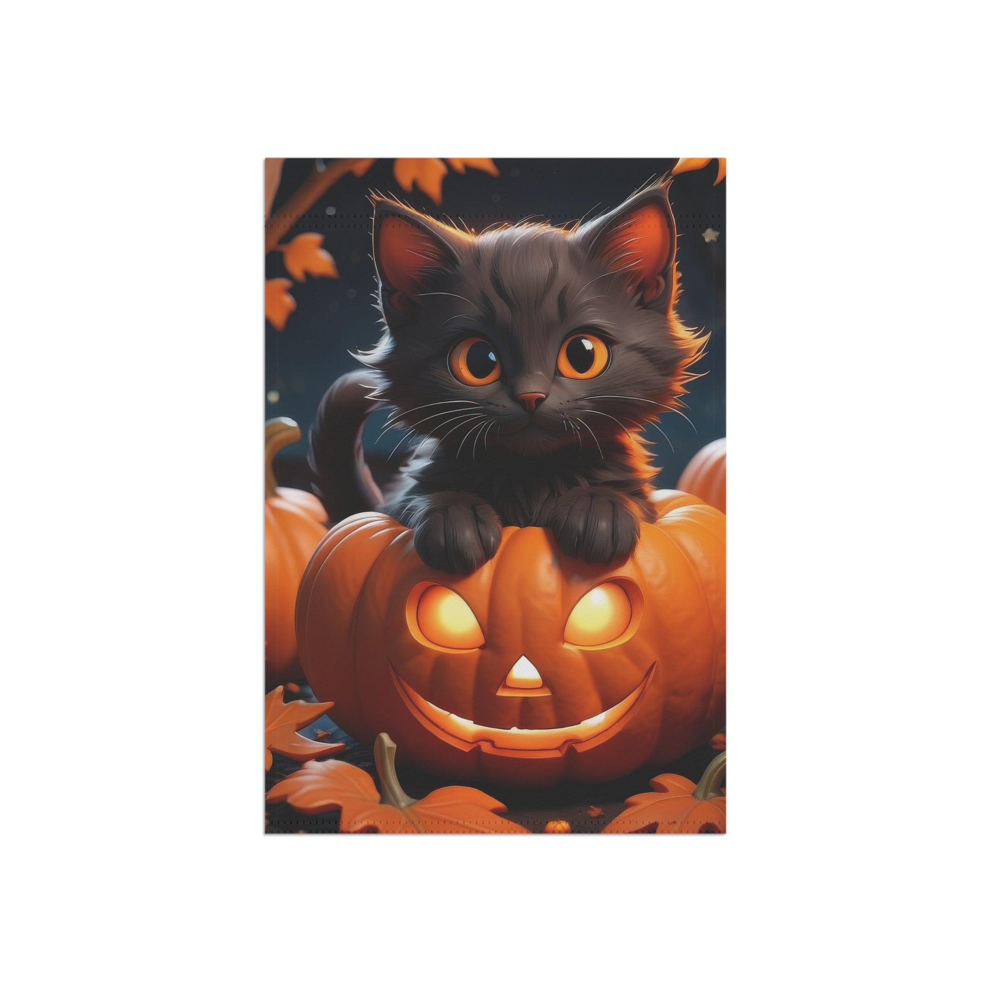 Add a purr-fectly spooky charm to your yard with this Halloween garden flag featuring an adorable black kitten perched on a glowing jack-o'-lantern. A delightful blend of cute and creepy, this flag makes a fun statement for Halloween night and the fall season.