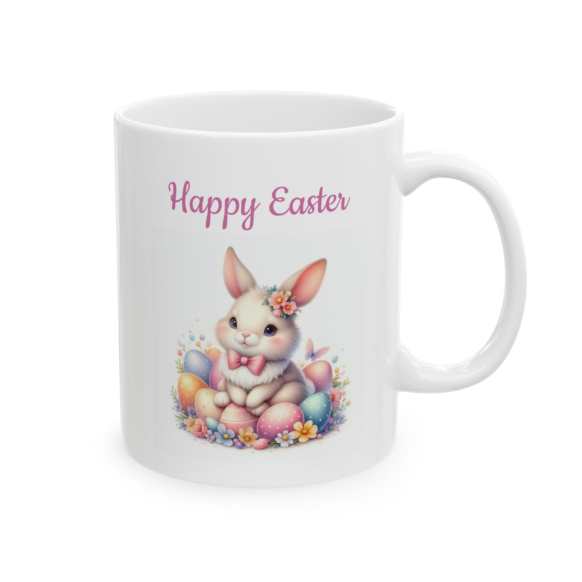 Celebrate the joyous arrival of spring with our charming "Happy Easter" ceramic mug! This delightful mug features an irresistibly cute bunny, adorned with a sweet bow tie and a floral crown, sitting amidst a colorful bounty of beautifully decorated Easter eggs and delicate spring flowers. It's a heartwarming scene that perfectly captures the spirit of new beginnings and festive cheer.