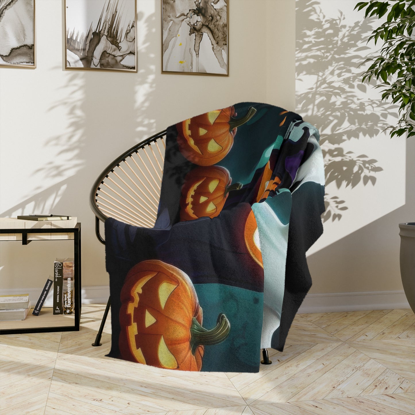 Get ready for a hauntingly good time with this adorable and spooky "BOO" Halloween blanket! The design features a charmingly eerie haunted house with the word "BOO" glowing brightly, flanked by three grinning jack-o'-lanterns. Above the house, two friendly (but still spooky!) ghosts float under a dark, mysterious sky. This blanket is perfect for adding a touch of festive fright to your home, cozying up during scary movie marathons, or enhancing your Halloween party decor. Made from luxuriously soft velveteen plush, it provides ultimate comfort and warmth. A must-have for Halloween enthusiasts and a fantastic gift for anyone who loves the playful and spooky side of the season!