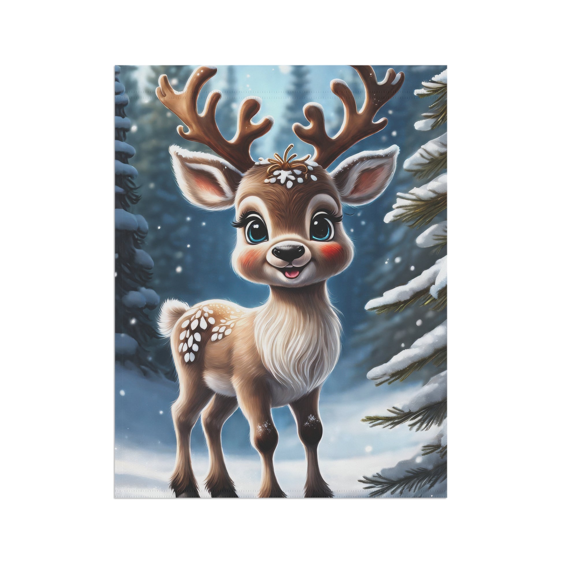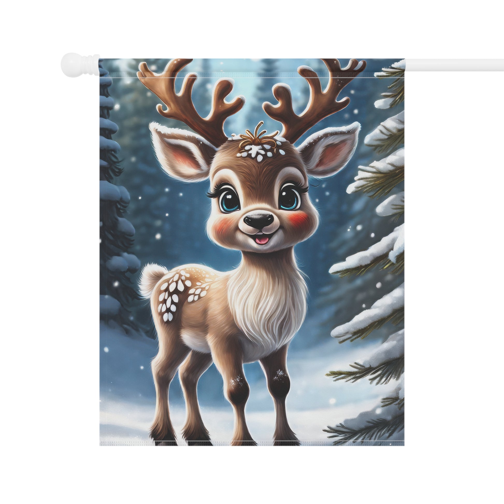 Bring a touch of enchanting charm to your garden with this adorable Reindeer Garden Flag! This sweet flag features a cute, smiling reindeer with big, blue eyes and rosy cheeks, standing proudly in a snowy forest of frosted pine trees under a beautiful blue winter sky. It's the perfect way to welcome guests and celebrate the magic of the holiday season and winter. Made from durable, weather-resistant material, it's designed to withstand the elements and maintain its vibrant charm all season long. Ideal for front yards, patios, and entryways, this flag is a delightful and heartwarming addition to your outdoor decorations.
