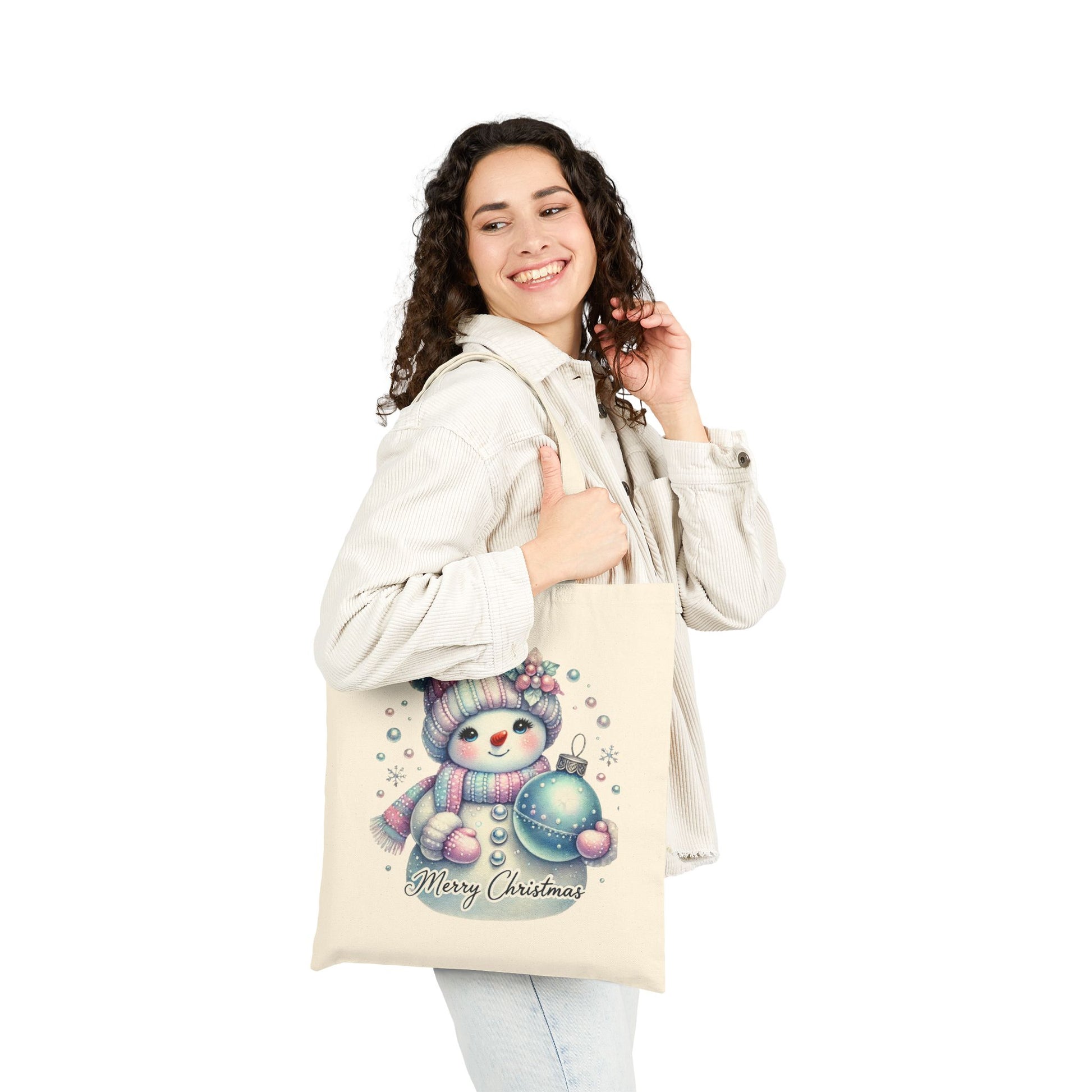Get into the holiday spirit with our "Merry Christmas" Snowman Canvas Tote Bag! This charming bag features an adorable snowman wearing a cozy striped hat and scarf, and holding a beautiful, sparkly blue ornament. The whimsical design is complemented by falling snowflakes and the "Merry Christmas" text. This tote is the perfect accessory for all your festive activities. Use it for holiday shopping, carrying gifts, or as a cheerful companion for everyday errands. It's a wonderful way to spread holiday cheer and makes a great gift for anyone who loves Christmas and winter themes.