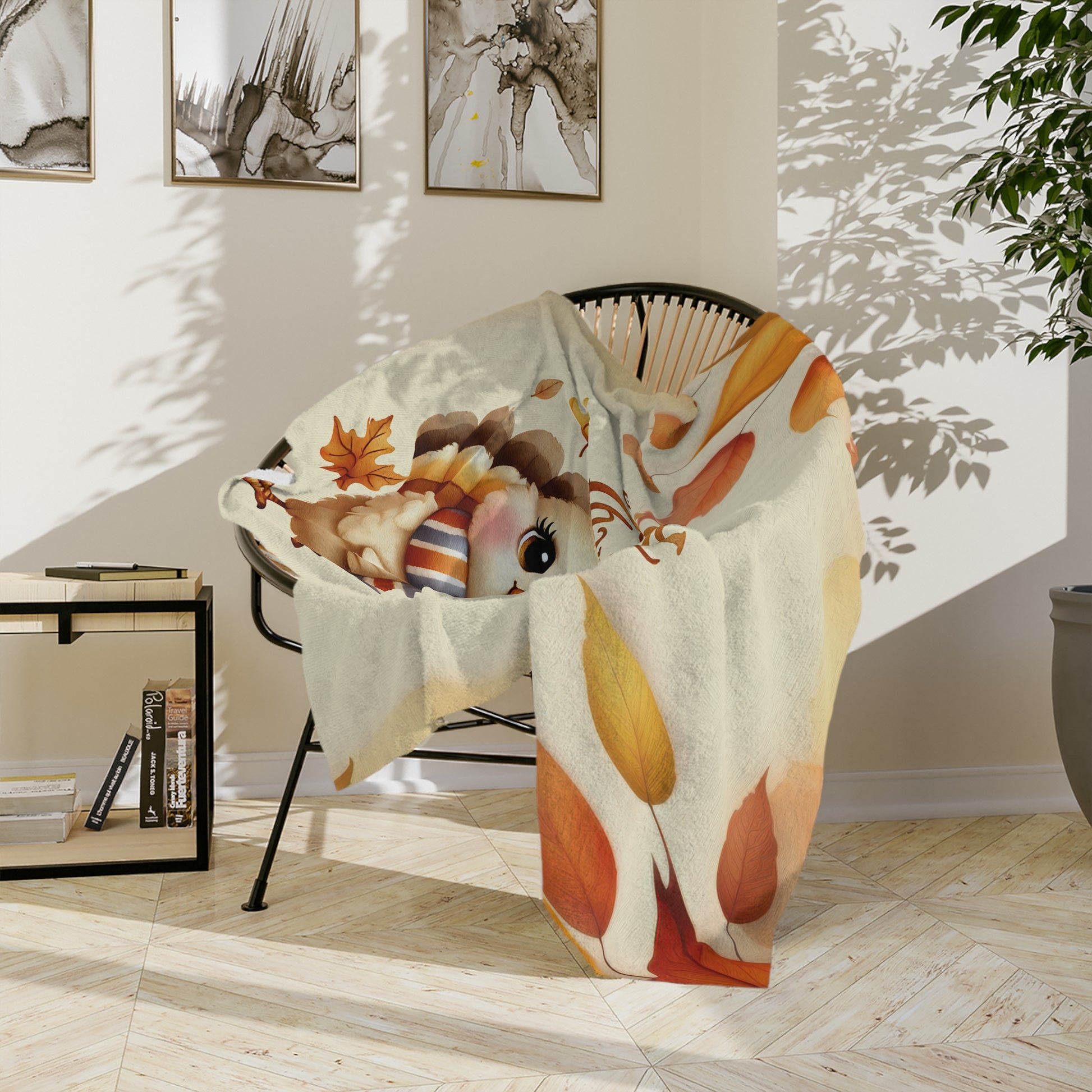Wrap yourself in luxurious comfort this Thanksgiving with our ultra-soft velveteen blanket. This delightful design features an adorable cartoon turkey, charmingly dressed in a flower and striped scarf, nestled among vibrant autumn leaves. Perfect for adding a touch of festive elegance and warmth to your home, this blanket is ideal for holiday decorating, cozy family gatherings, or as a thoughtful gift. The smooth, plush texture of velveteen offers a truly premium feel, making it an irresistible choice for celebrating the season of gratitude in style.