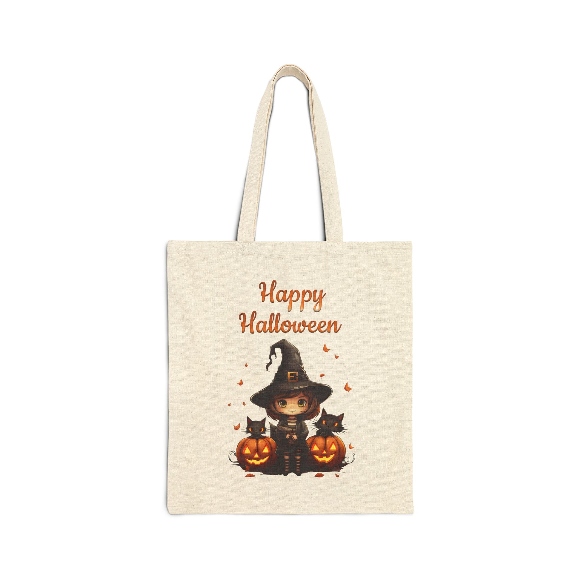 Celebrate the spooky season with our "Happy Halloween" canvas tote bag! This adorable design features a cute little witch surrounded by her two black cat companions and carved jack-o'-lanterns. It's a charming and practical accessory for all your fall adventures.