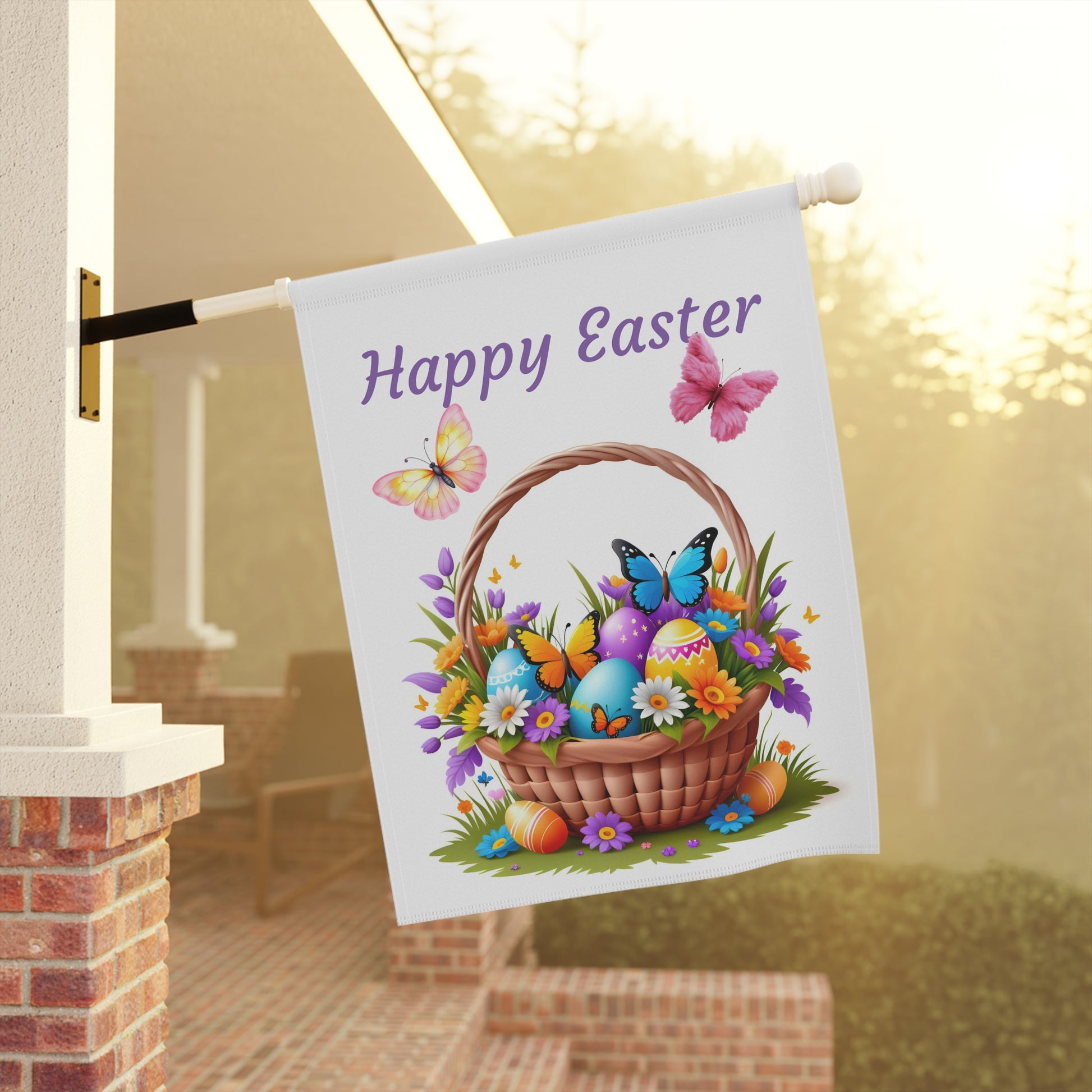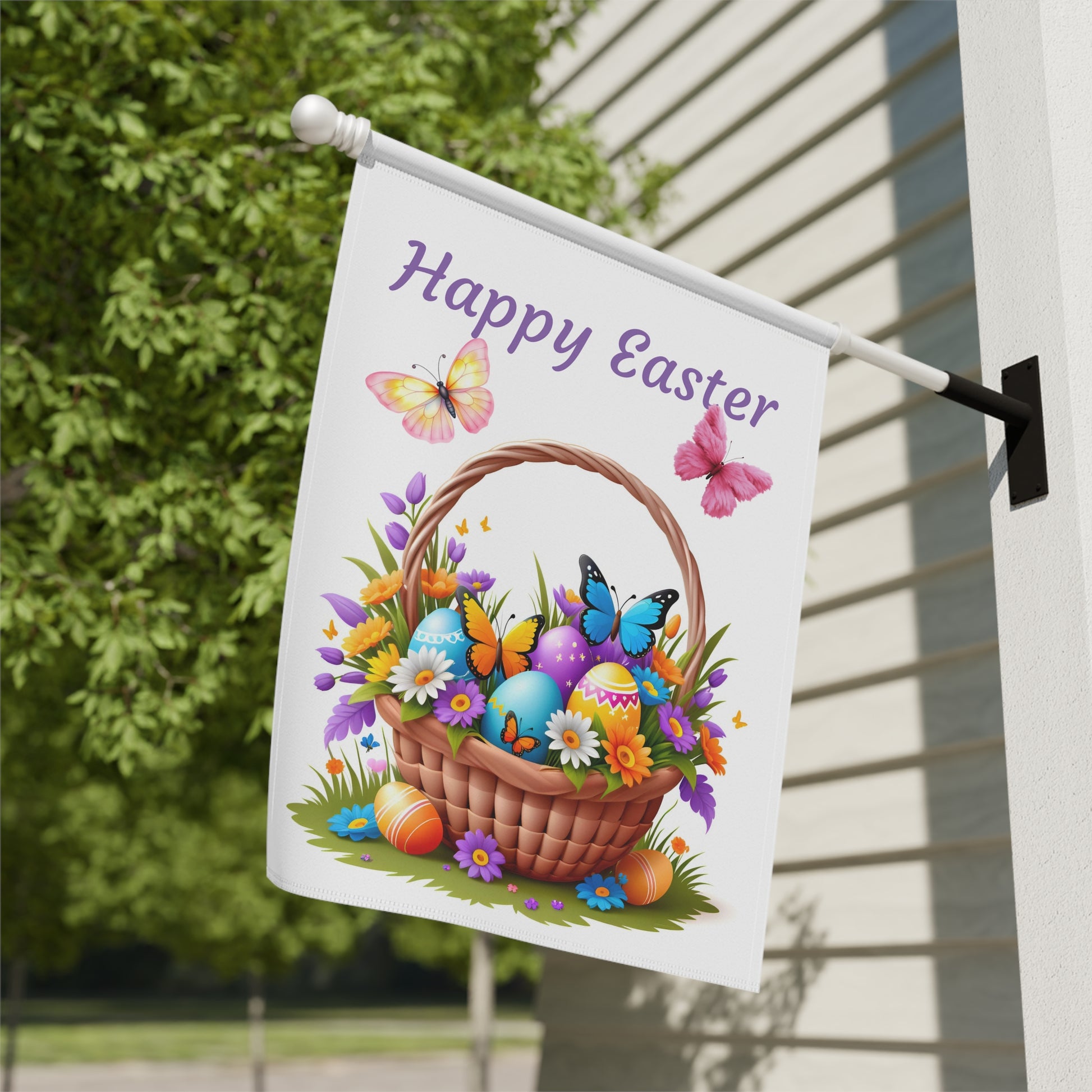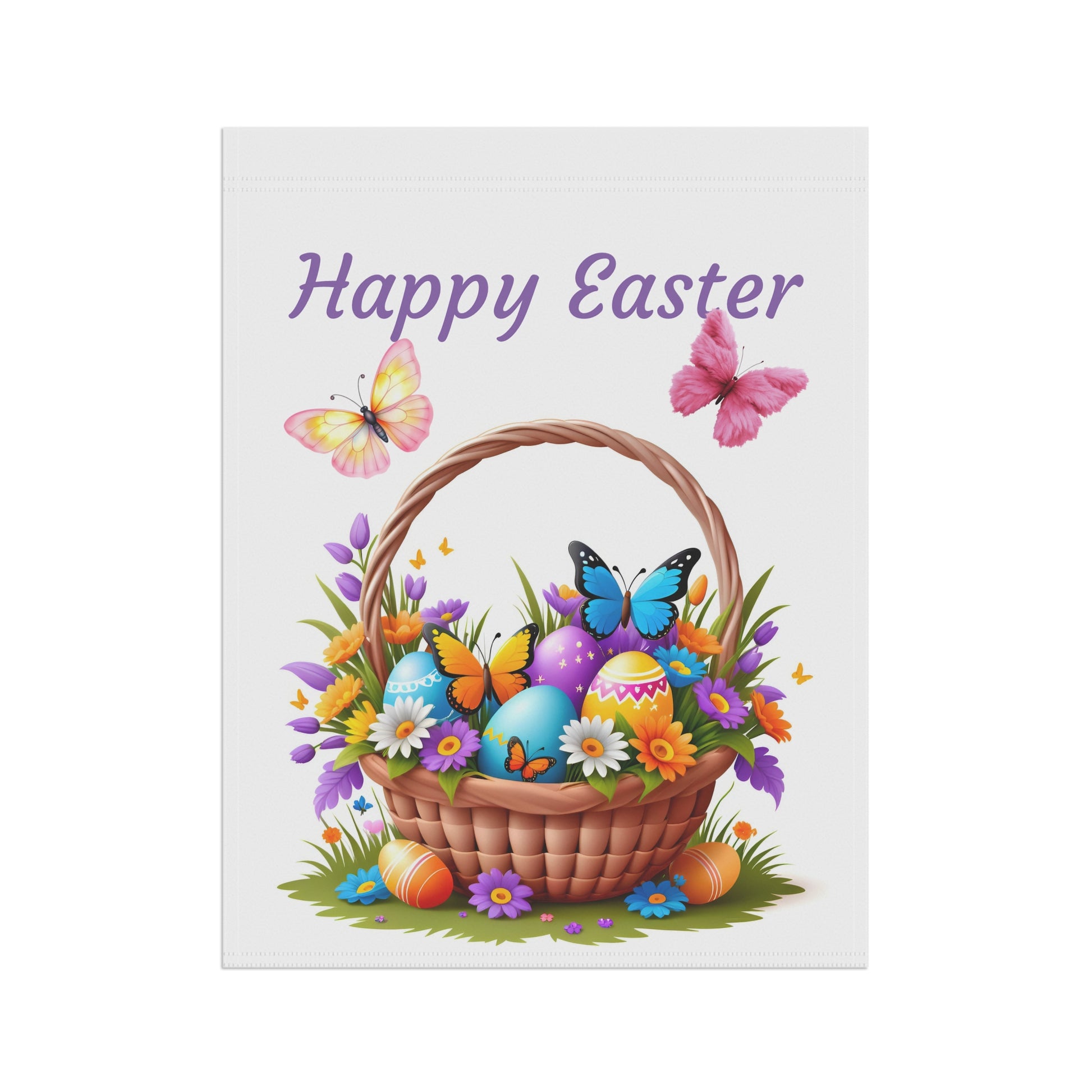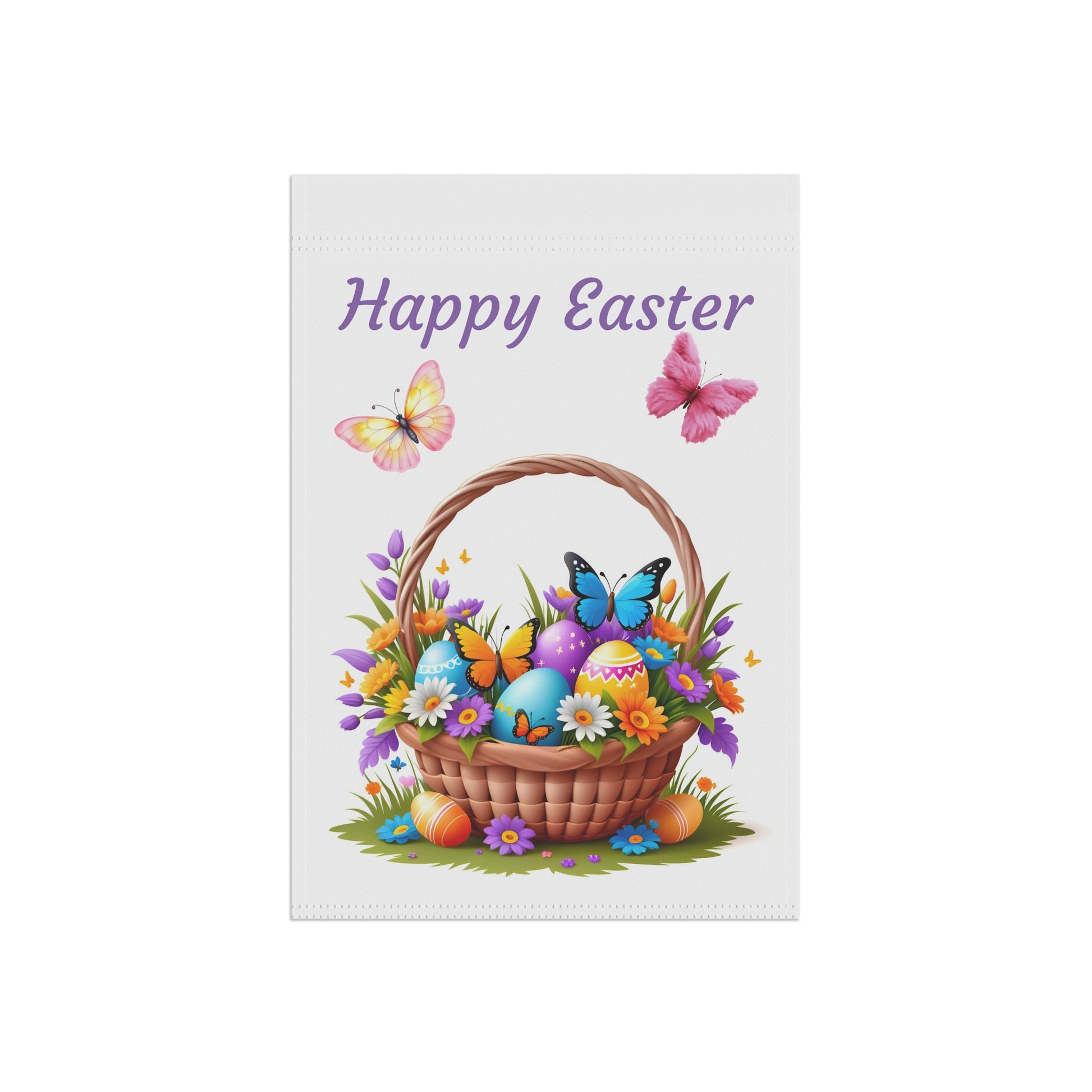 Celebrate the vibrant spirit of Easter with our delightful "Happy Easter Basket" Garden Flag! This cheerful flag showcases a beautifully woven basket overflowing with an array of brightly colored Easter eggs, delicate spring flowers, and lively butterflies fluttering all around. The charming "Happy Easter" message floats above, creating a warm and inviting atmosphere for your garden, yard, or patio. Crafted from high-quality, weather-resistant material, this durable flag is designed to withstand the elements, ensuring its vivid colors and festive scene remain bright and beautiful throughout the spring season. A perfect way to welcome guests and embrace the joy of the holiday!