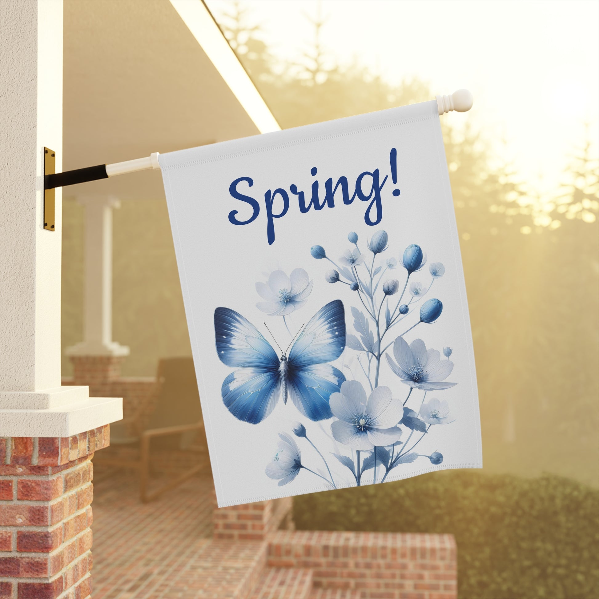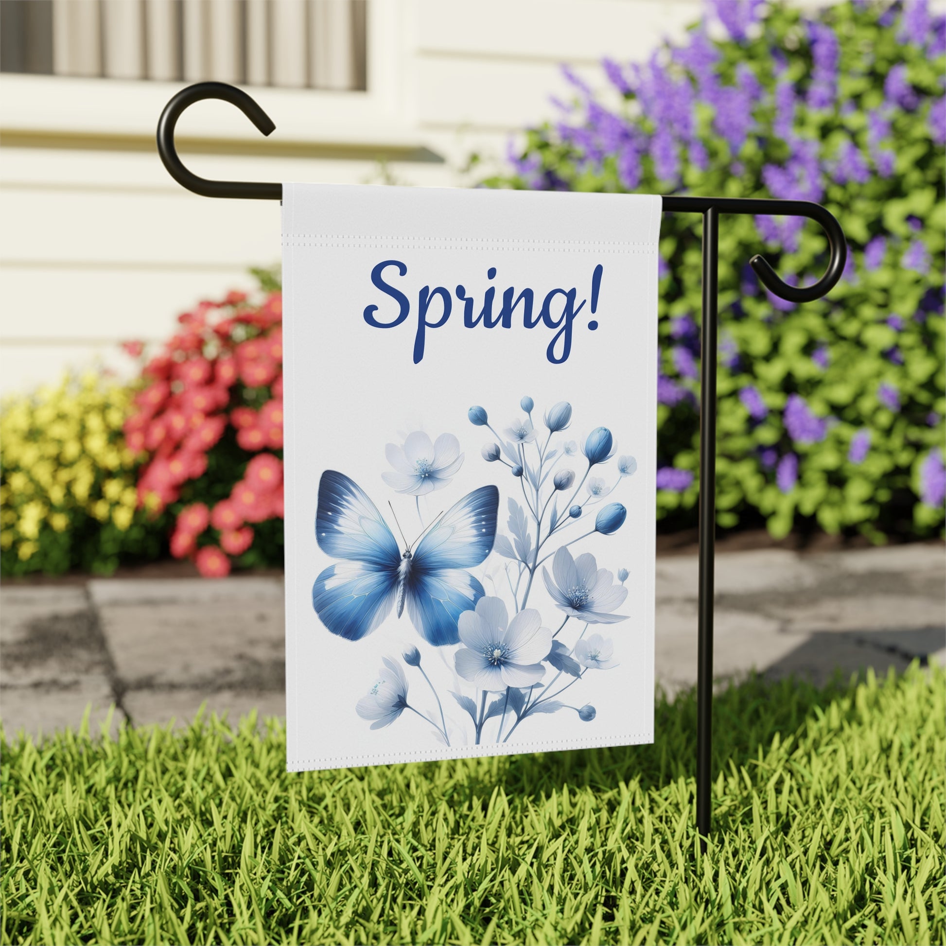 Introduce the serene elegance of the season with our beautiful Single Blue Butterfly & Blue Floral Spring Garden Flag! This exquisite flag showcases a striking single blue butterfly gracefully poised amidst delicate blue and white flowers and subtle botanical accents. The vibrant "Spring!" text in a lovely blue script announces the arrival of warmer days. Crafted from high-quality, weather-resistant fabric, this durable flag is designed to maintain its rich colors and withstand the elements, making it a perfect enhancement for your garden, yard, or patio throughout the spring. It's designed to fit effortlessly onto standard garden flag stands.