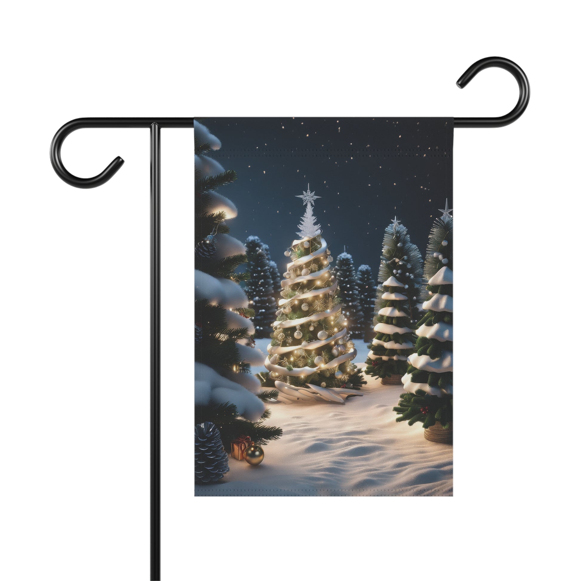 Transform your garden into a magical winter wonderland with our Enchanted Winter Forest Christmas Garden Flag! This stunning flag depicts a serene snowy landscape filled with frosted pine trees, one beautifully illuminated with warm white lights and topped with a glistening star. The tranquil night sky with subtle stars completes this enchanting scene, perfect for creating a peaceful and festive atmosphere. Made from durable, weather-resistant material, it's designed to withstand the elements and maintain its vibrant charm all season long. Ideal for front yards, patios, and entryways, this flag is a beautiful addition to your holiday decor.
