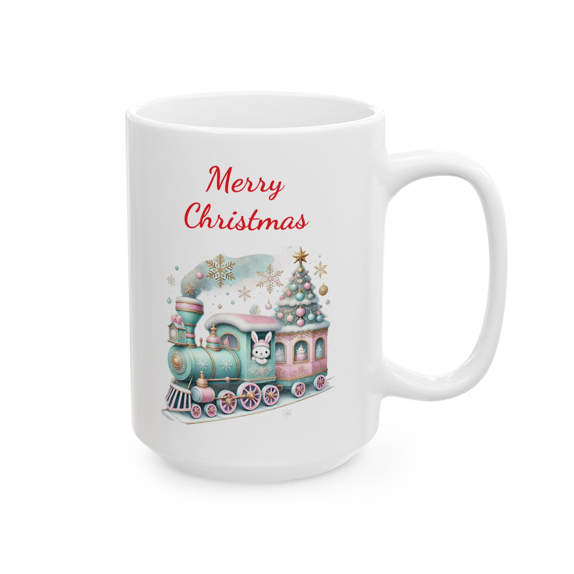 All aboard for holiday cheer with our delightful "Merry Christmas" coffee mug! This charming mug features a whimsical watercolor illustration of a festive Christmas train, complete with a decorated tree and a cute bunny peering from a window. It's the perfect way to enjoy your favorite hot beverages throughout the holiday season or to give as a heartwarming gift. Crafted from durable white ceramic, this mug is both microwave and dishwasher safe for your convenience. Bring the magic of Christmas to your home with this enchanting and unique holiday mug!
