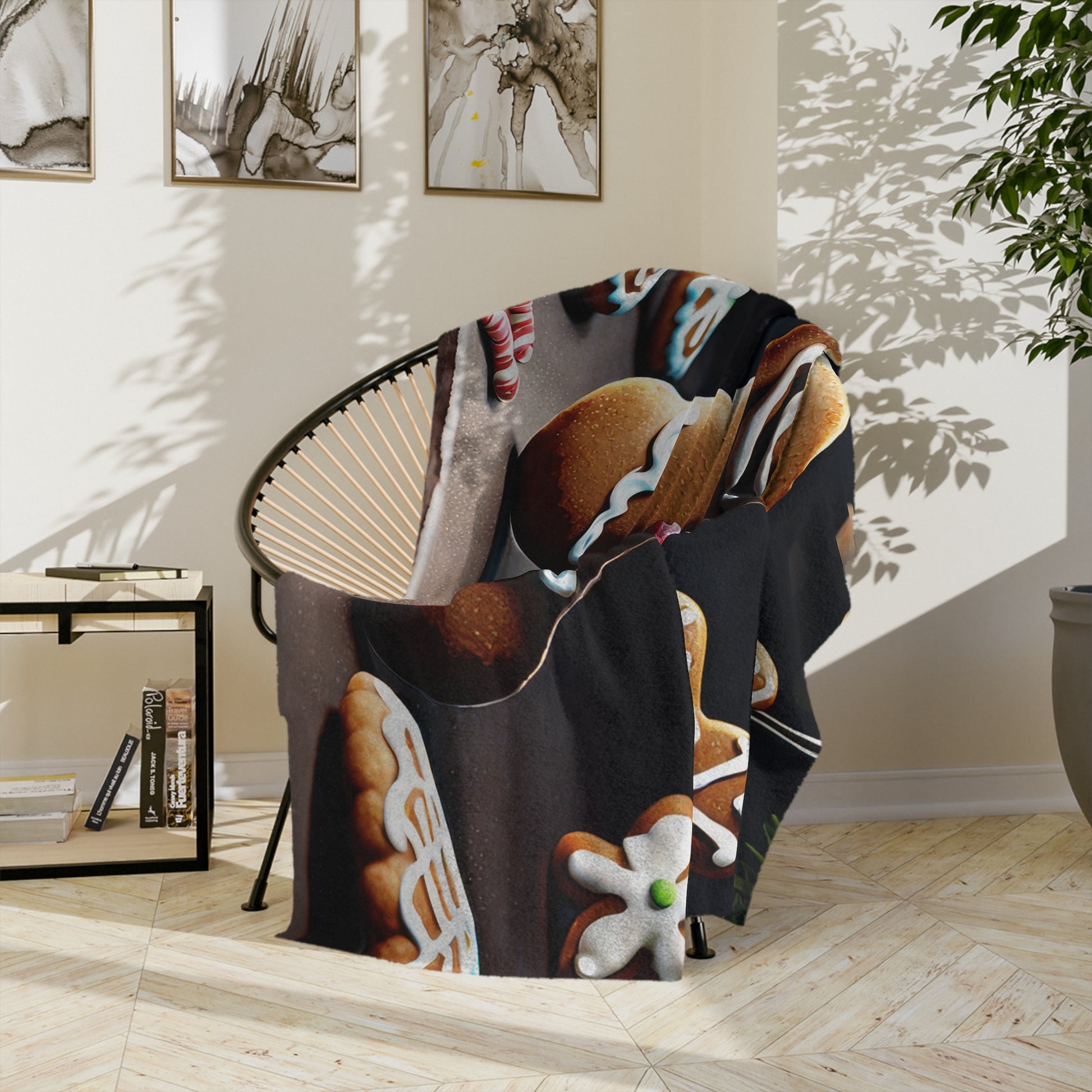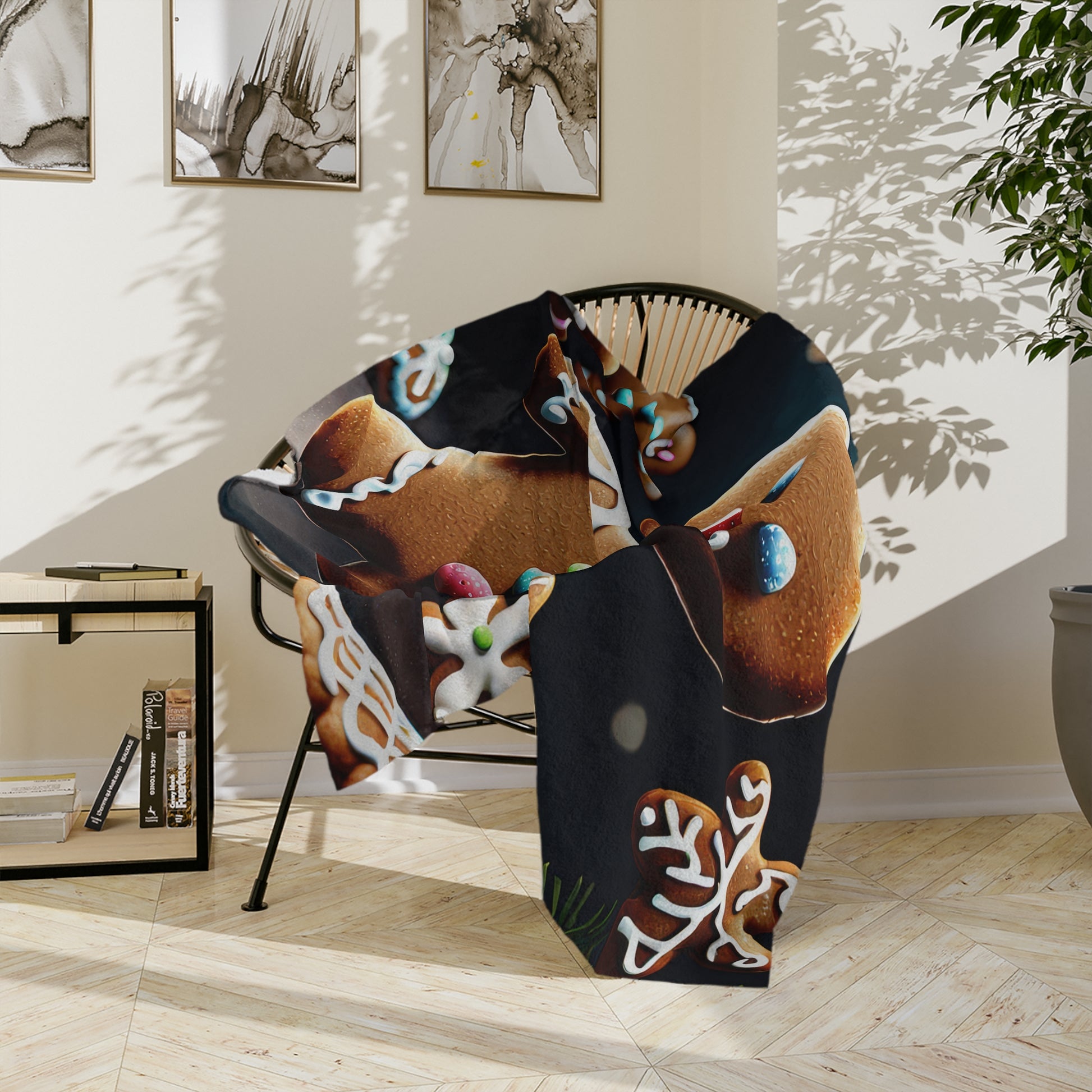 Add a dash of sweetness to your holiday season with our Gingerbread Man Plush Blanket. This soft velveteen throw features a cheerful gingerbread cookie decorated with colorful candy buttons and white icing, surrounded by snowflake cookies and festive treats. Whether you're sipping cocoa by the fire or gifting holiday joy, this cozy blanket makes the perfect addition to your Christmas decor or a delightful present for loved ones of all ages.