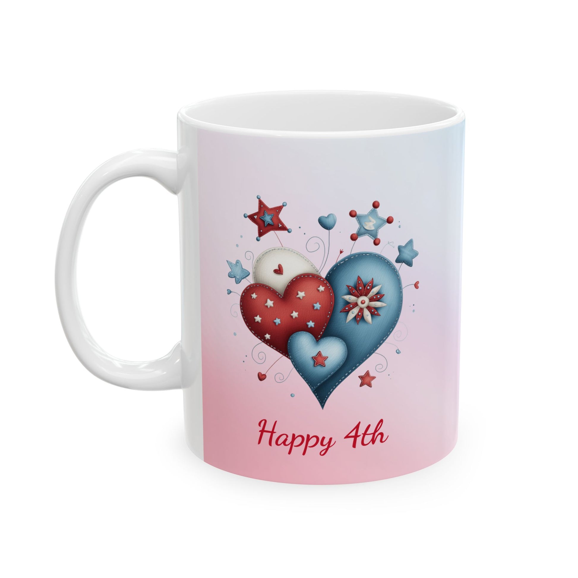 Celebrate freedom and express your national spirit with our adorable "Happy 4th" Patriotic Hearts & Stars Coffee Mug! This delightful white ceramic mug features a beautiful arrangement of decorative hearts in vibrant red, crisp white, and bold blue, each adorned with playful stars and intricate details. Below this charming cluster, the cheerful red text "Happy 4th" adds a festive touch, making it the perfect companion for your Independence Day celebrations, Memorial Day gatherings, or simply to show your love for the USA every day.