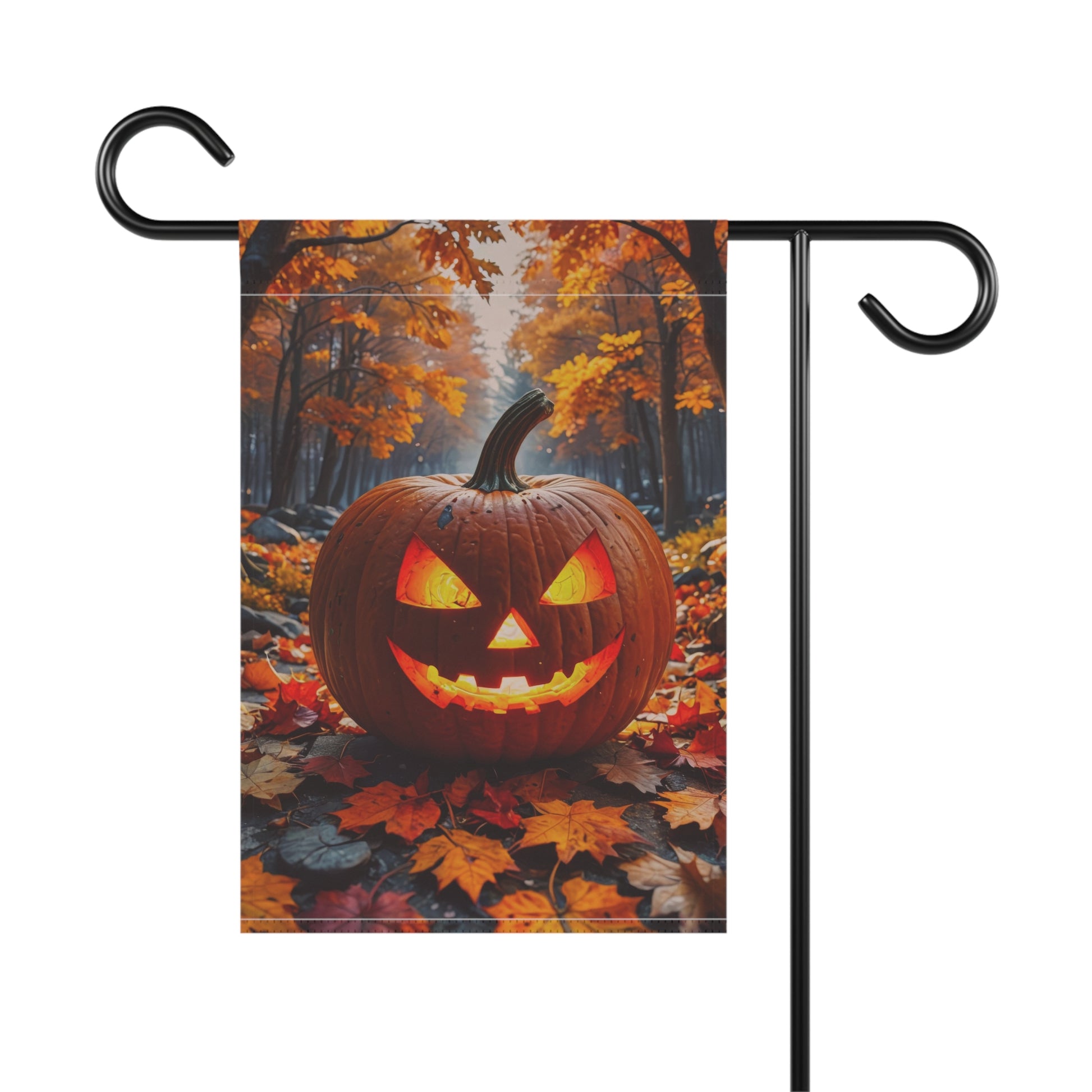 Embrace the mystery of the season with this Forest Jack-O’-Lantern Garden Flag. Featuring a glowing, carved pumpkin surrounded by vivid autumn leaves in a moody woodland setting, this flag adds an atmospheric touch to your Halloween display. Perfect for nature lovers, woodland décor themes, or anyone who wants a little spook with their seasonal serenity!