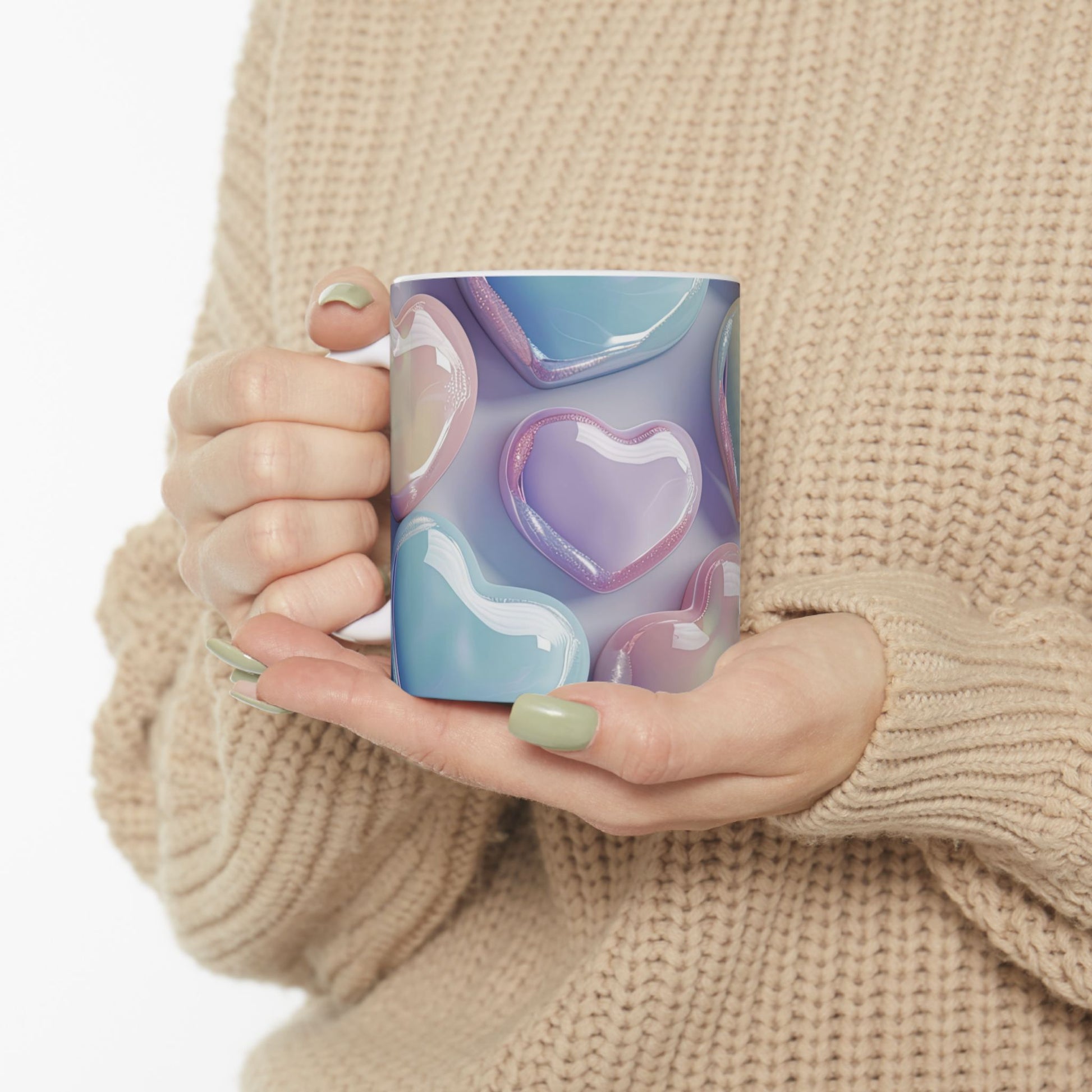 Add a touch of whimsical enchantment to your sips with our Iridescent Pastel Hearts Ceramic Coffee Mug! This captivating mug features a beautiful, seamless pattern of lustrous hearts that shimmer with an iridescent, bubble-like effect in soft shades of pink, blue, and cream. Each heart glows with a subtle, magical sheen, making every glance a moment of delight.