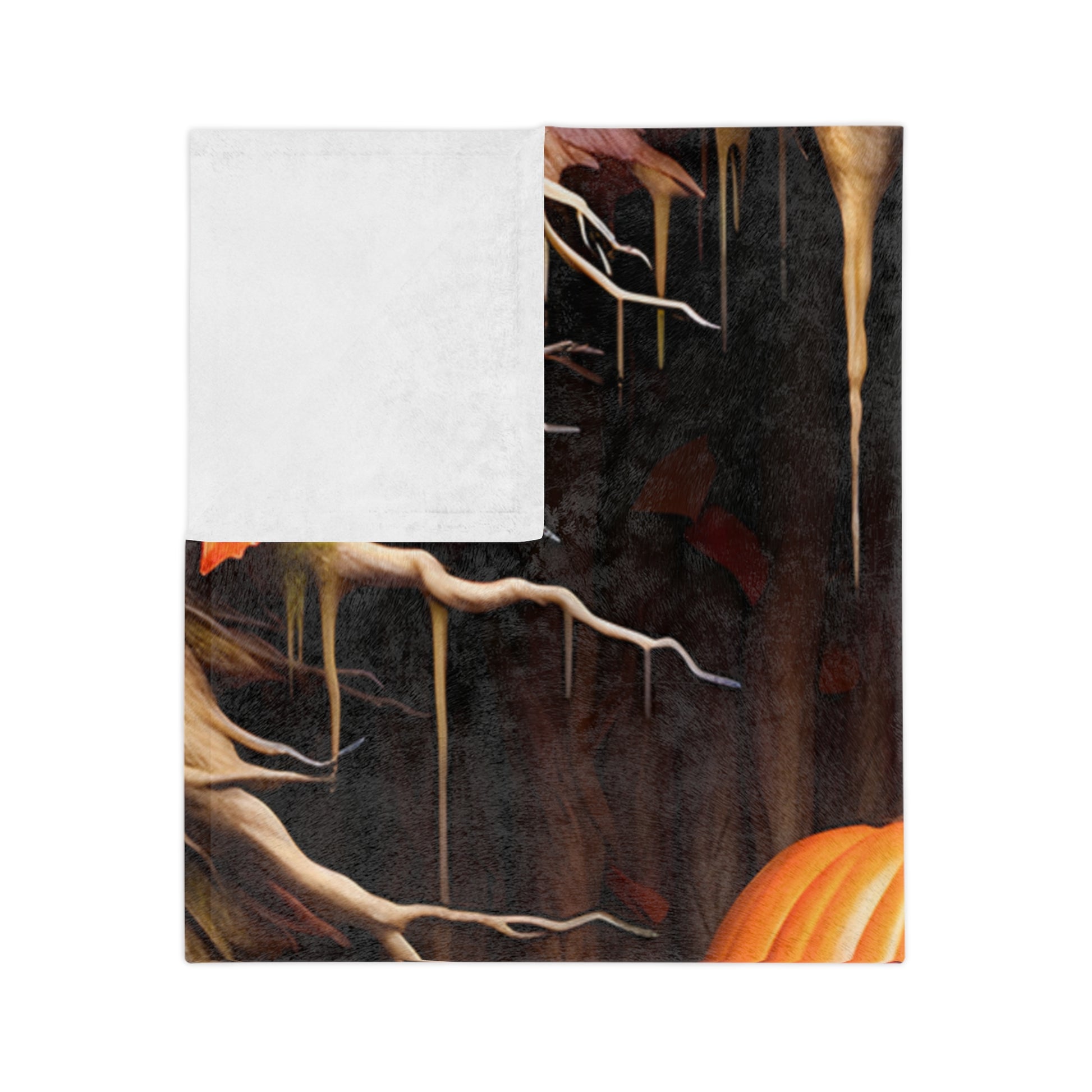 Immerse yourself in the enchanting mystery of Halloween with this captivating blanket! It features a warmly glowing jack-o'-lantern nestled within a gnarled, spooky tree hollow, with roots and branches creating an eerie frame. A shimmering pool of light reflects the pumpkin's glow, and scattered autumn leaves add to the fall ambiance. This unique design perfectly captures the spirit of a magical autumn night, making it ideal for cozying up during spooky story times, enhancing your Halloween party decor, or adding a unique, festive accent to any room. Made from luxuriously soft velveteen plush, it provides ultimate comfort and warmth. A must-have for Halloween enthusiasts and a fantastic gift for anyone who appreciates the mystical beauty of the season!