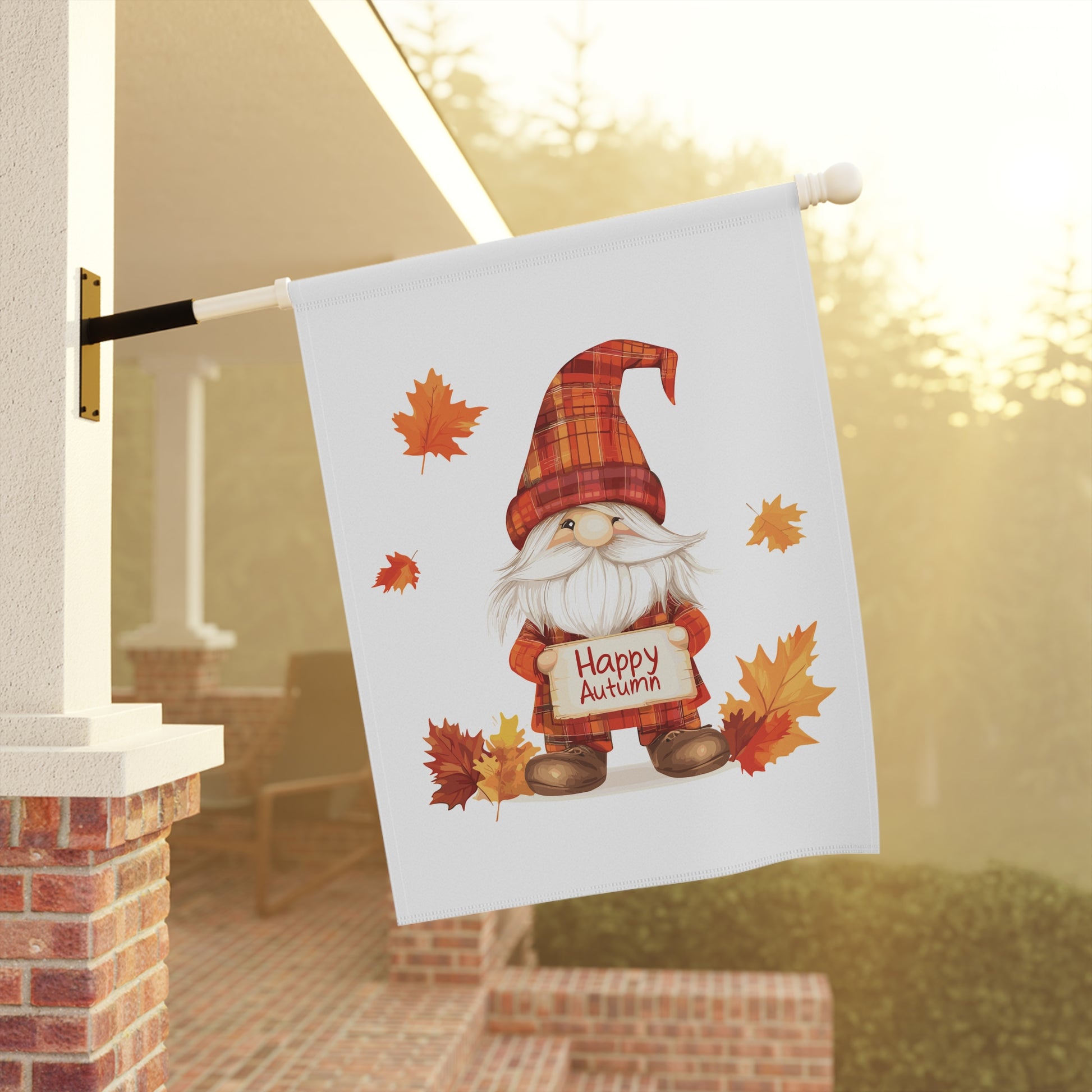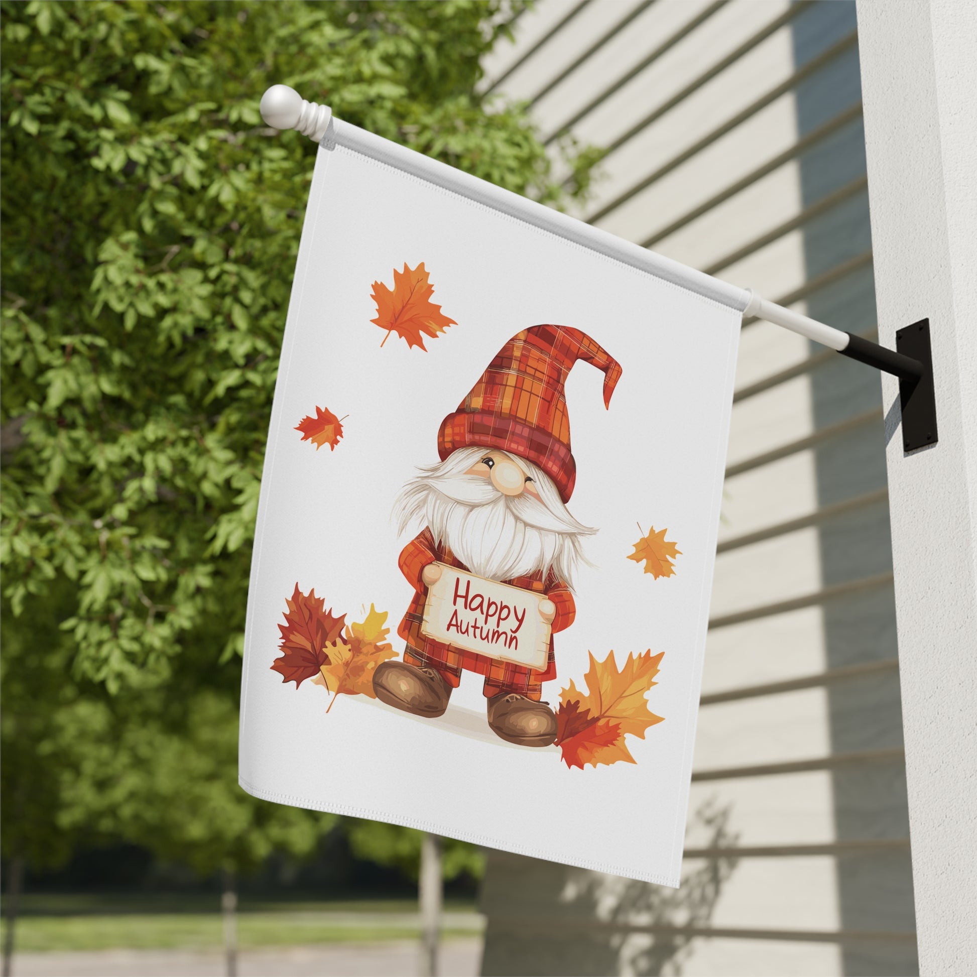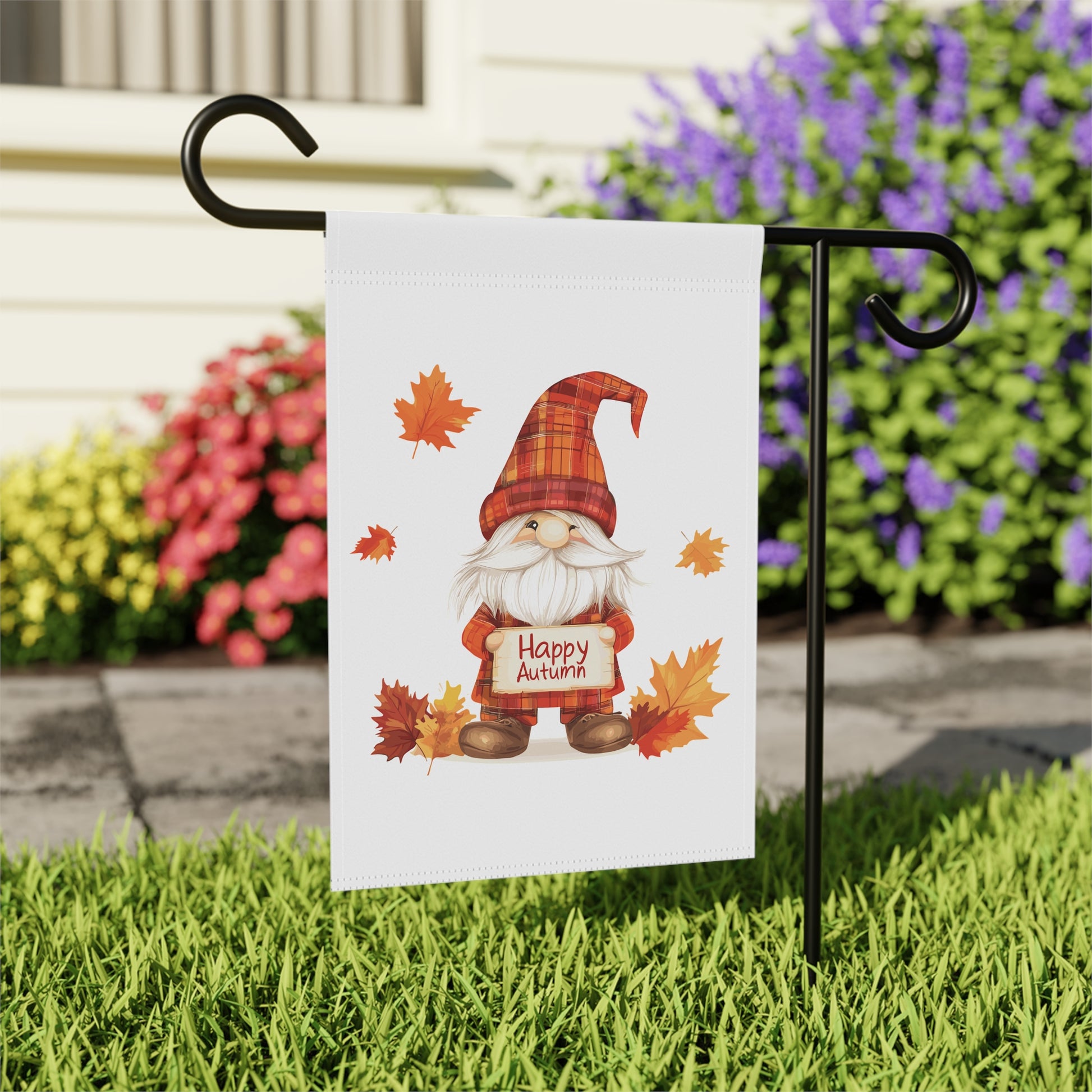 Welcome the season of pumpkin spice and cozy sweaters with our charming "Happy Autumn" Gnome Garden Flag. This delightful flag features a friendly gnome wearing a festive plaid hat and holding a sign that wishes all a "Happy Autumn." Surrounded by beautifully colored fall leaves, this flag is the perfect way to add a touch of whimsy and seasonal cheer to your front yard, porch, or garden. Made from durable, weather-resistant material, it's designed to withstand the elements and keep your home looking festive all season long.