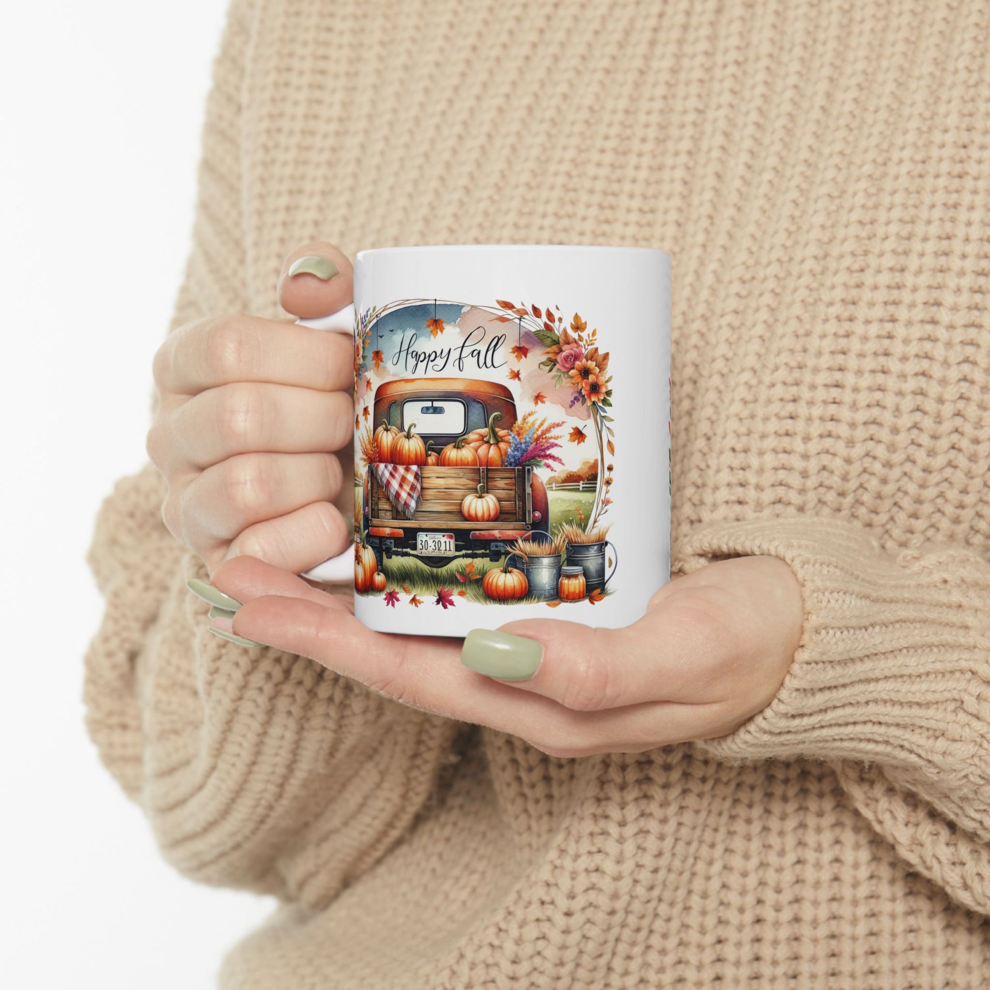 Embrace the cozy vibes of autumn with our charming "Happy Fall" coffee mug! This delightful mug features a classic vintage pickup truck overflowing with a bountiful harvest of pumpkins, surrounded by colorful fall leaves and beautiful floral accents. It's the perfect way to enjoy your favorite warm beverages like pumpkin spice lattes or hot cider during the crisp autumn season, and makes a wonderful gift for anyone who loves fall decor, rustic charm, or farm-fresh aesthetics. Crafted from durable white ceramic, this mug is both microwave and dishwasher safe for your convenience. Bring the warmth and beauty of fall right into your home or office!